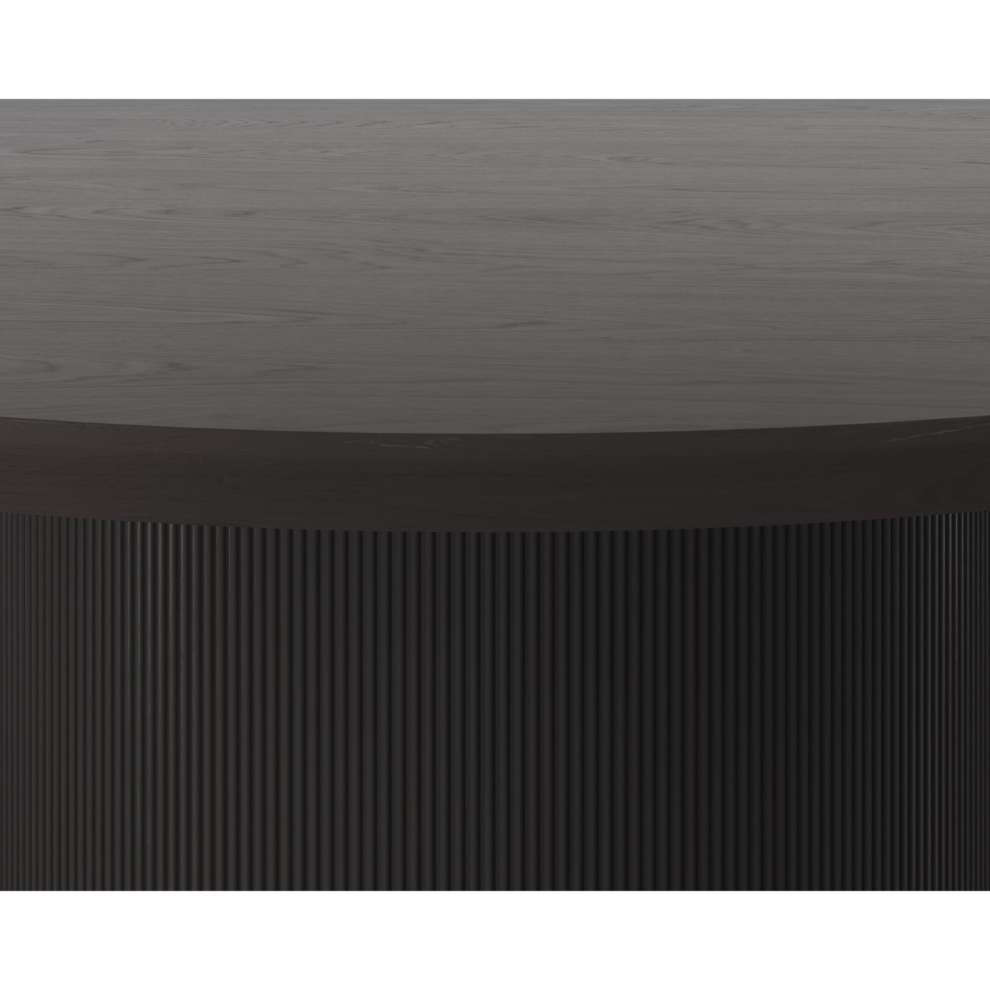 The Kalla Dining Table brings form and function to life. Crafted with a charcoal grey oak veneer table top with a chamfered edge. Vertical reeding on a solid oak wood base with brushed gold steel detailing at the bottom finishes the look. As wood is an organic, porous material, these pieces will contain natural variation of texture and may also exhibit fine indentations and cracks. Wood pieces will also display a disparity of colour and grain, and visible knots and burls that add to the character of each piece.