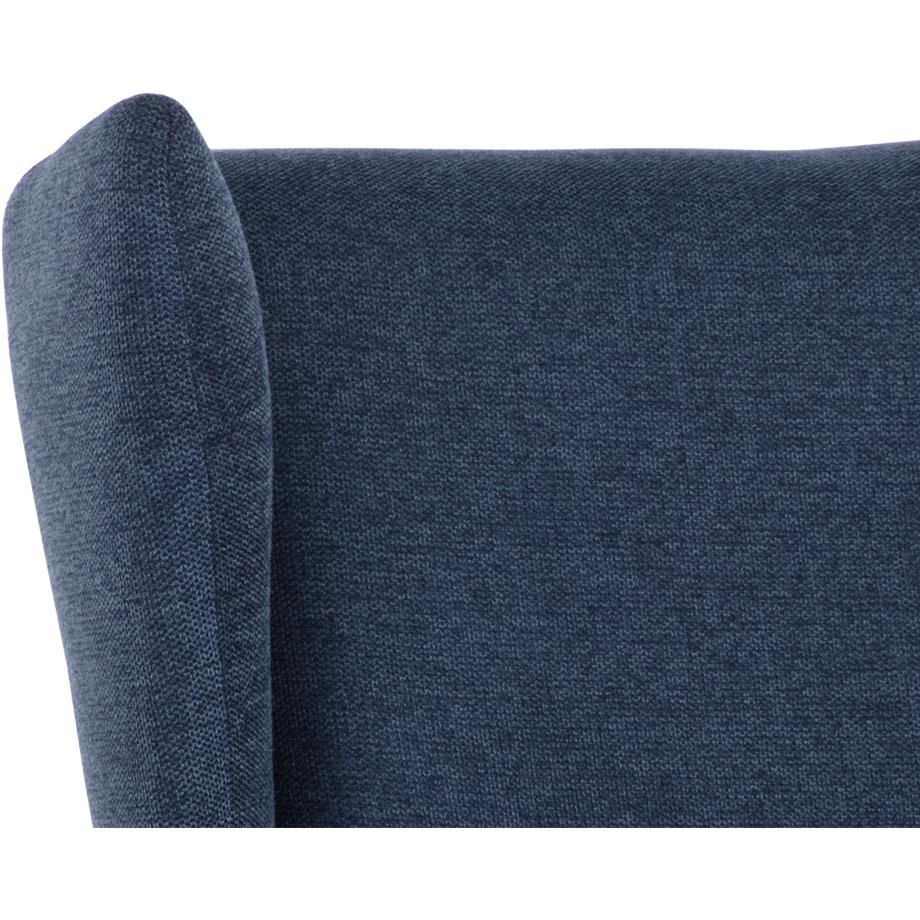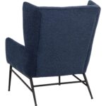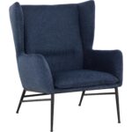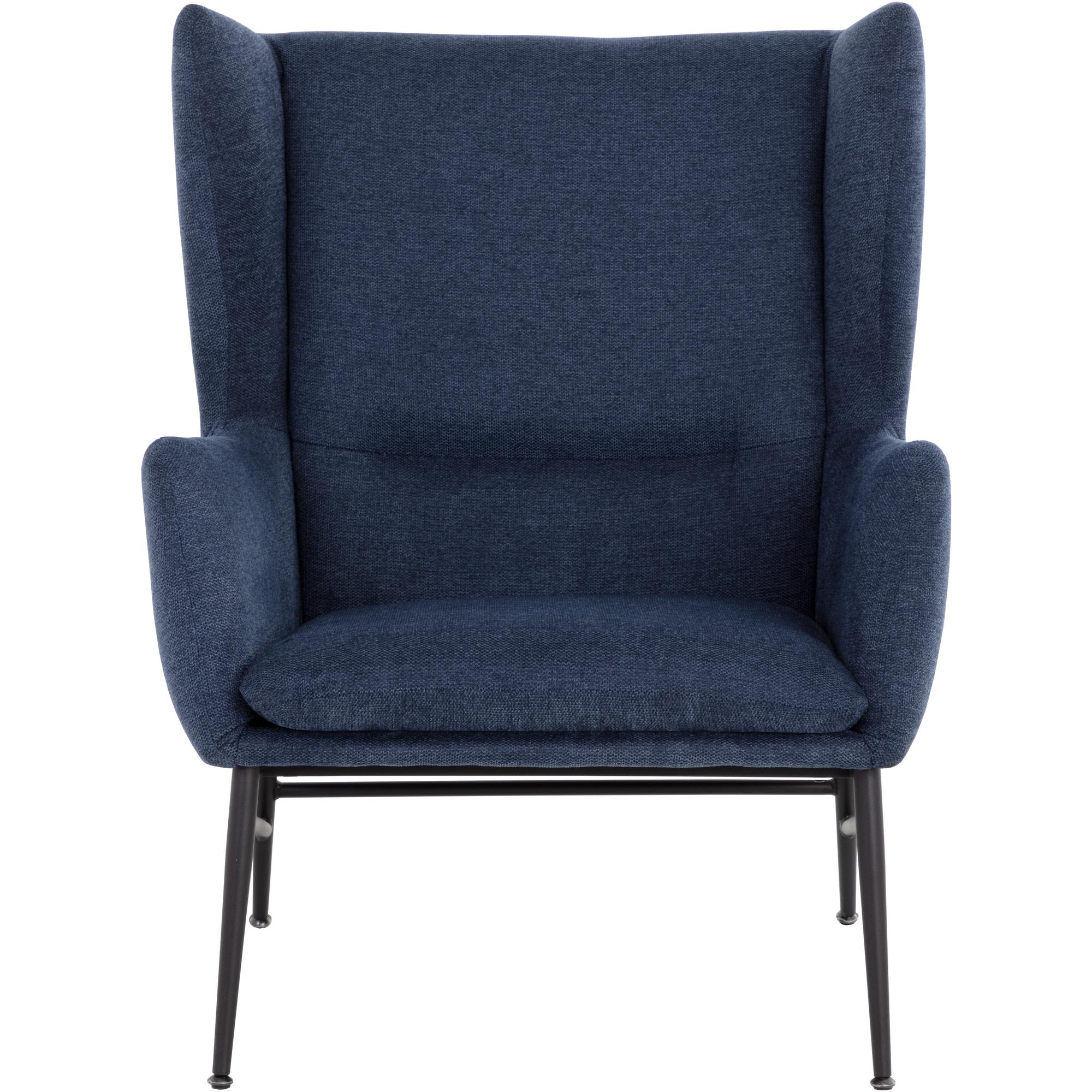 Elevate any space with this contemporary lounge chair that has a marvelous wingback design. Stocked in belfast navy fabric with subtle horizontal tufting on the interior seat. Completed with matte black powder coated steel frame and legs.
