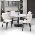 Your search for the perfect contemporary but comfortable armchair for your dining table ends with this one. Curved high back and cushioned seating provide ergonomic support while the metal frame creates a unique modern looking piece. Neutral finishes will work with a variety of table styles – formal or casual. Great as accent chair in a hallway or bedroom.