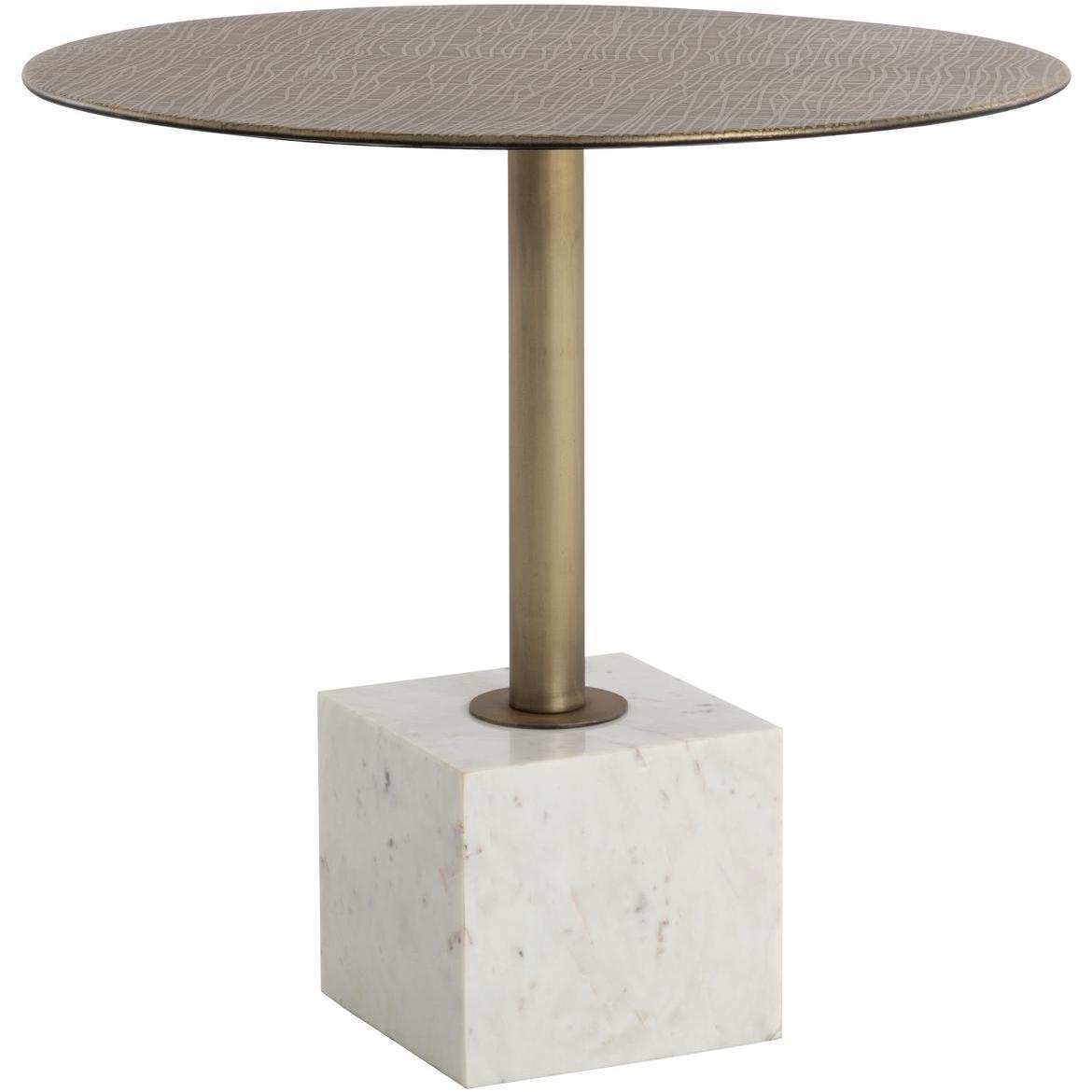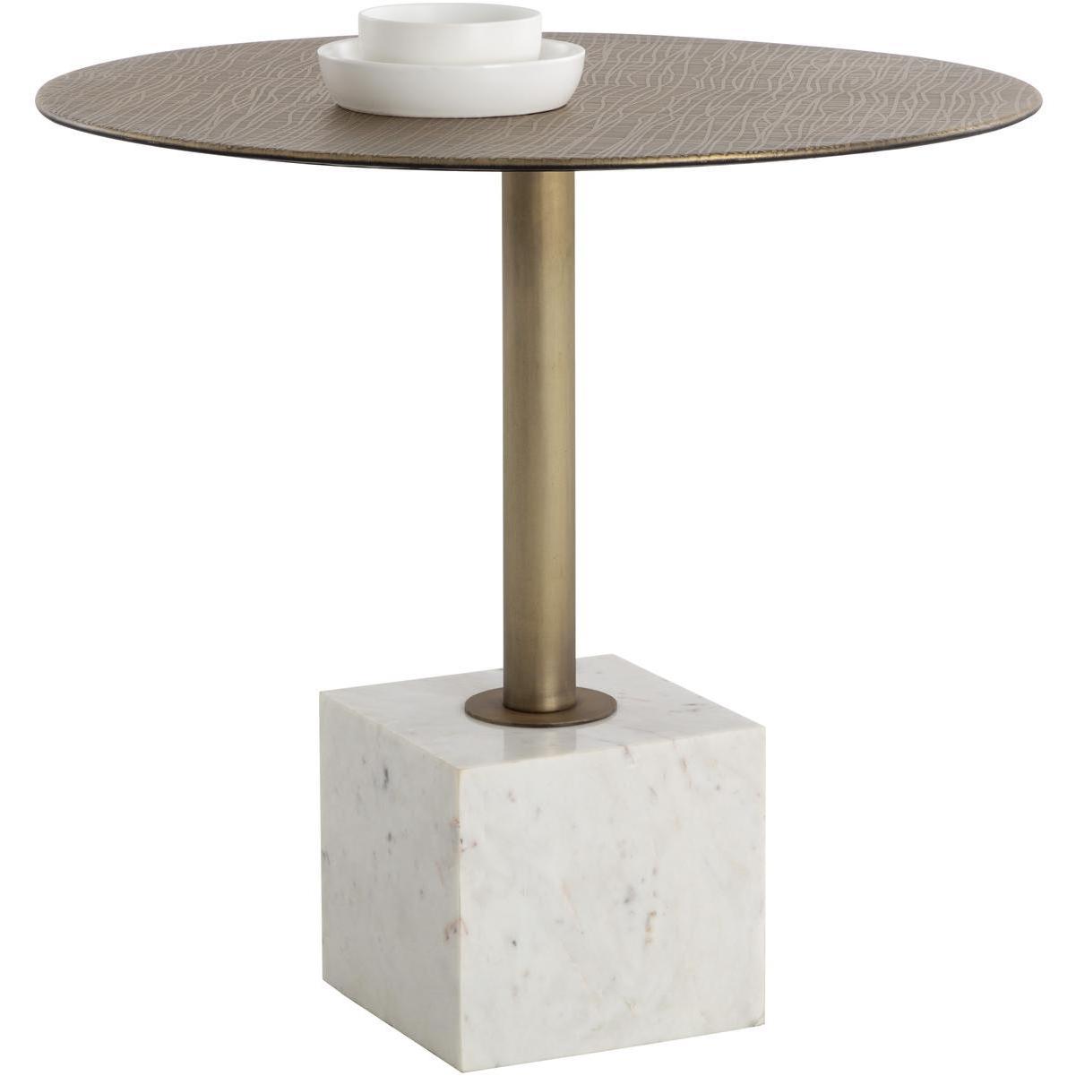Add a touch of opulence to any space with this spectacular bistro table. Features a brushed antique brass frame with mesh patterning on the tabletop. Completed with a white marble block base. Also available in grey marble. Made in India. With refined craftsmanship, this design was brought to life by skilled local artisans. By nature, these materials develop unique imperfections such as fissures, markings and colour variations for a truly one-of-a-kind piece.