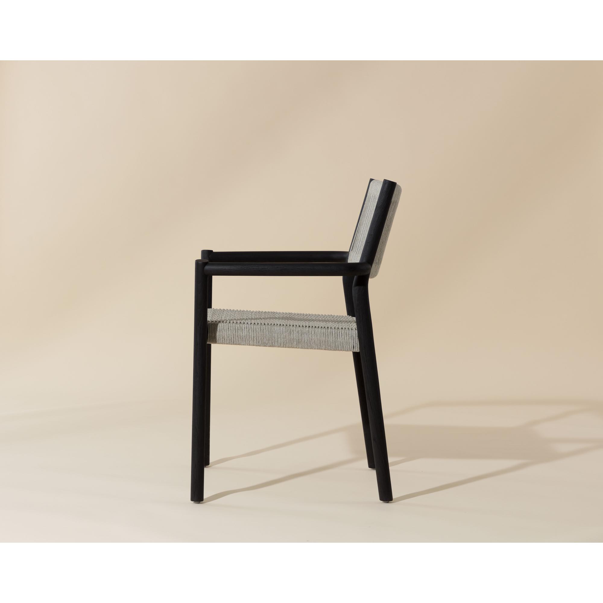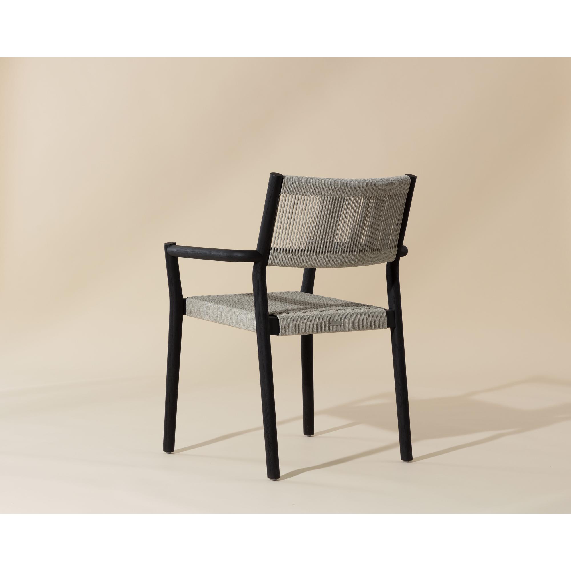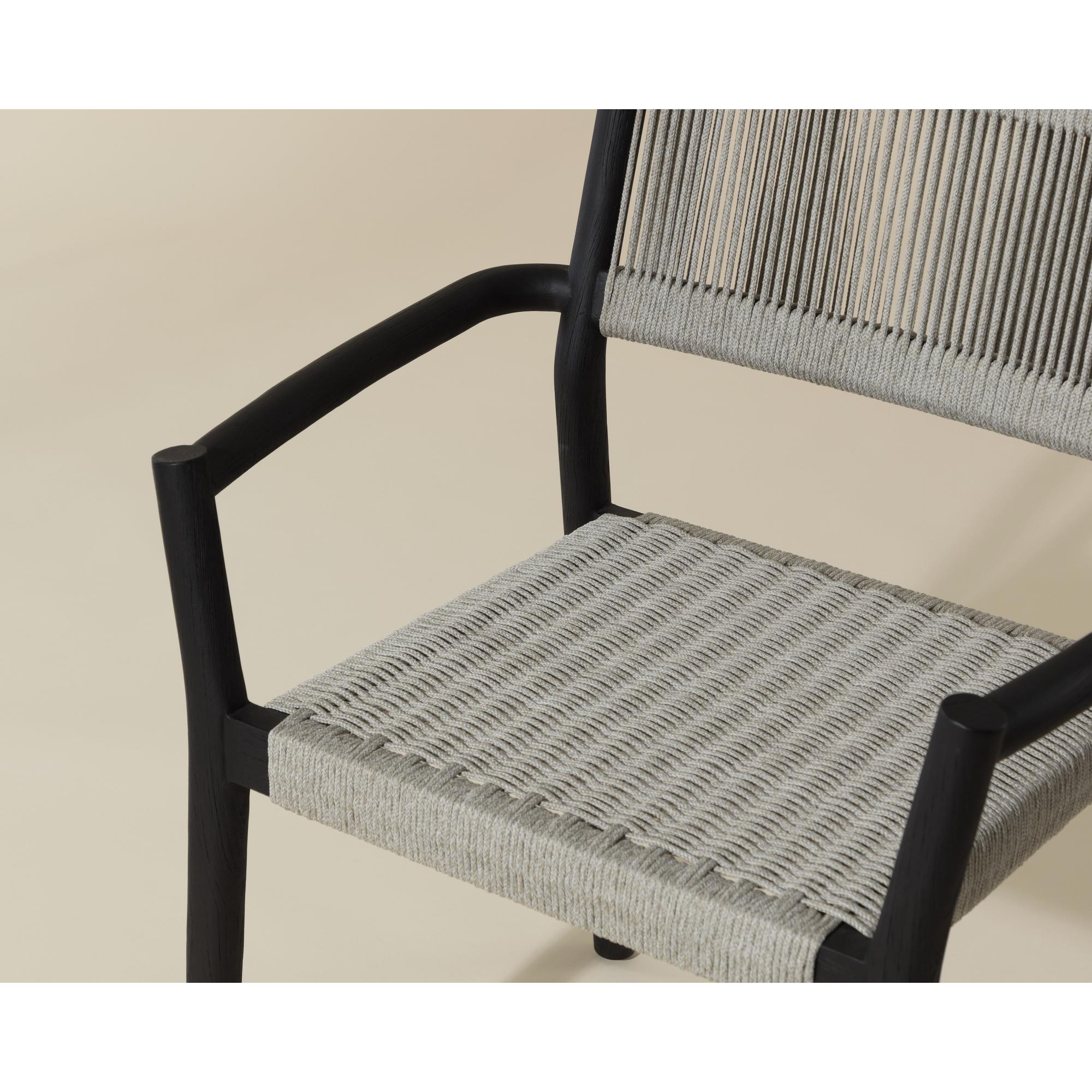Reimagine al fresco dining with the stylish and functional Kavala Stackable Dining Armchair. A simple charcoal teak wood frame draws attention to the breezy handwoven rope design on the seat and backrest, encouraging an elegant arrangement around a table when paired in multiples.