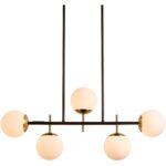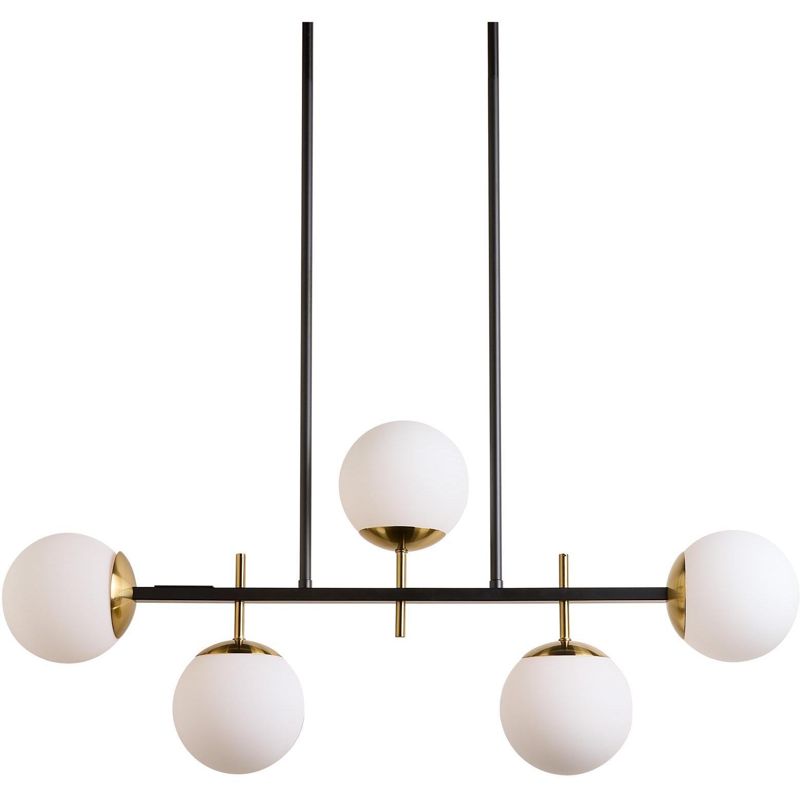 With a clean design that puts mesmerizing lines in focus, this modern chandelier is effortlessly stylish. Features five white frosted glass shades with a matte black metal frame. Accenting gold plates complete the look.