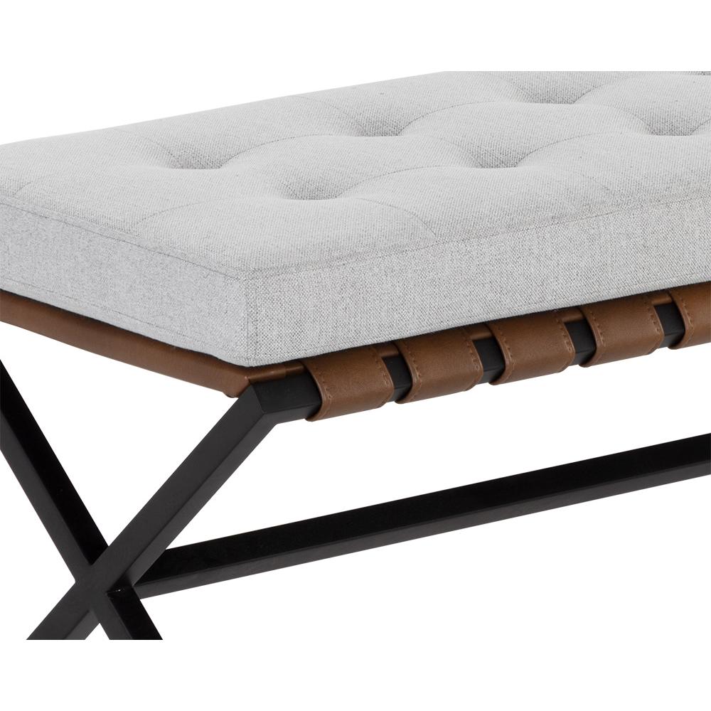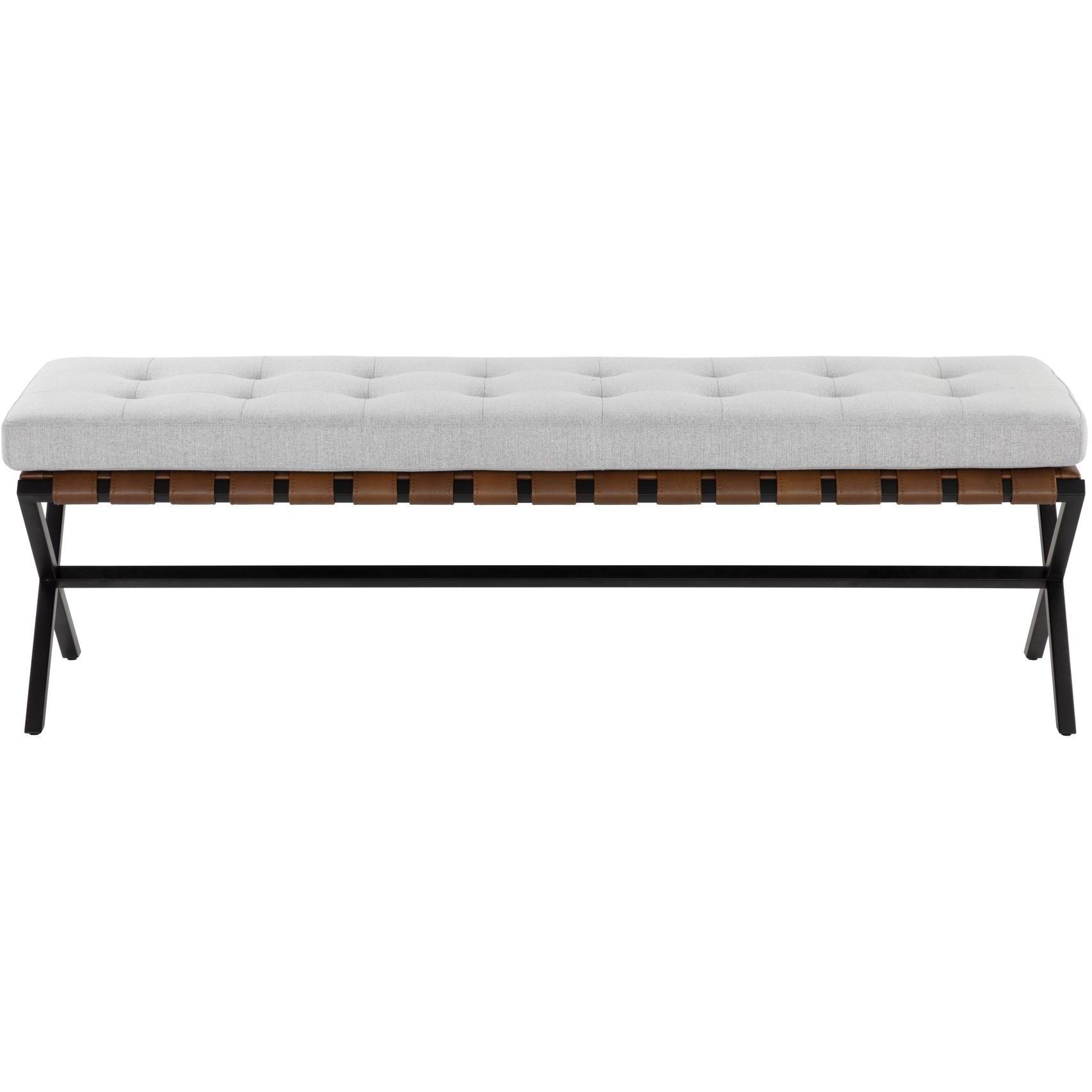 This transitional bench offers comfort and style to living and lounge spaces, bedrooms and more. Features a trestle style black stainless steel frame and completed with a button tufted seat. Stocked in mina light grey fabric. Also available in bravo black and cream faux leathers with a gold stainless steel frame.