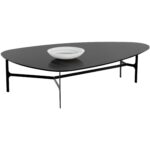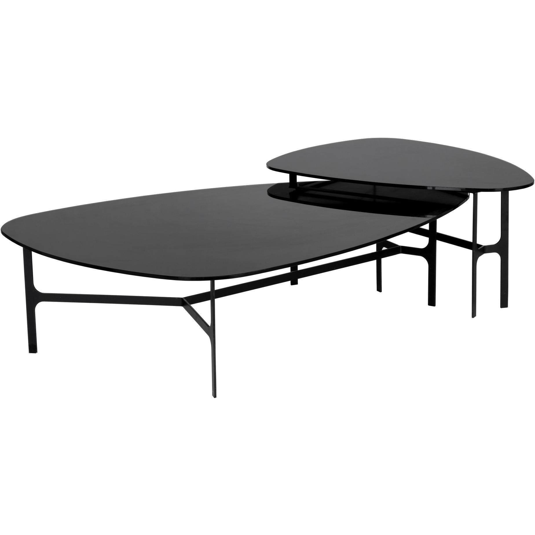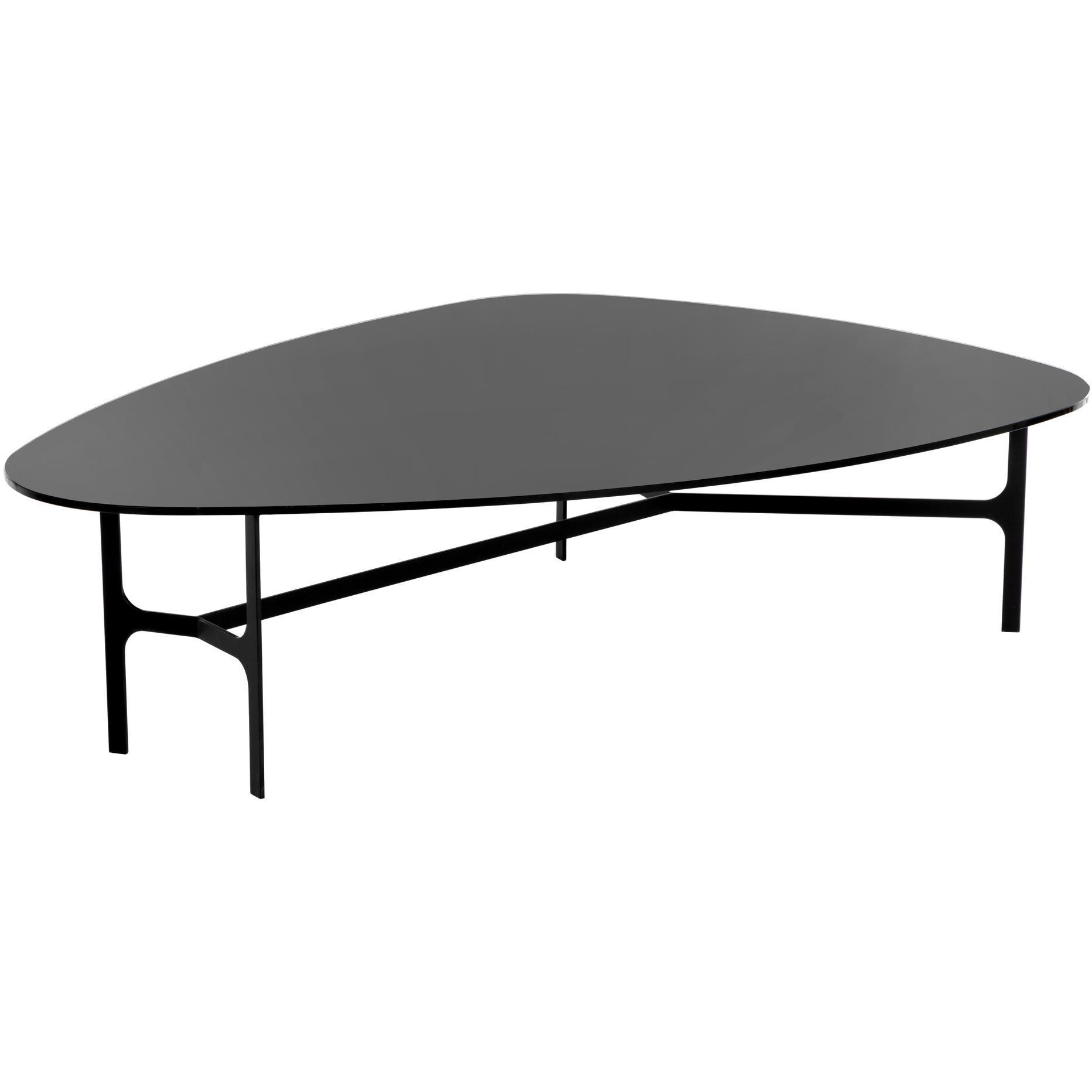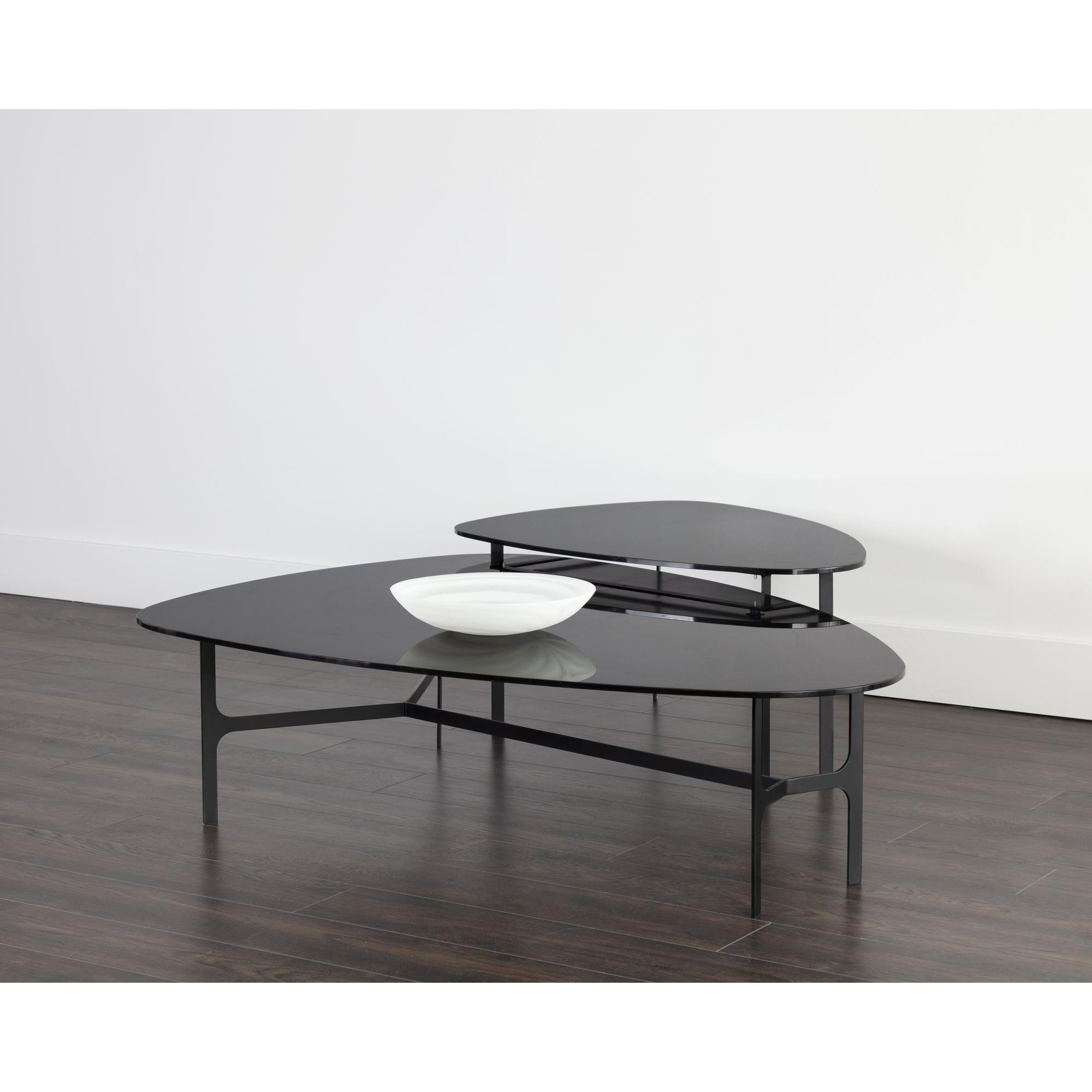 With a charming curved design, this coffee table boasts a mid-century modern appeal. Features a painted black glass top and completed with a matte black metal frame. Coordinating side table also available.