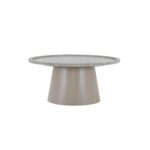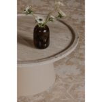 The Kimberley Coffee Table is a blend of cool materials and warm tones. A rounded tray-shaped top of antique white marble featuring subtle veining rests upon a camel-colored iron sheet base that angles outward with grace. This piece marries practicality with refined aesthetics—its tray top offer security; its design timeless appeal.