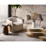 The Kiri End Table is a shapely spectacle that embraces the essence of mid-century modern design. Made entirely of concrete with textural wood details such as natural graining patterns and a wire brush finish. Complemented with a hand-painted antique brass metal finish on the base and underneath the table top.