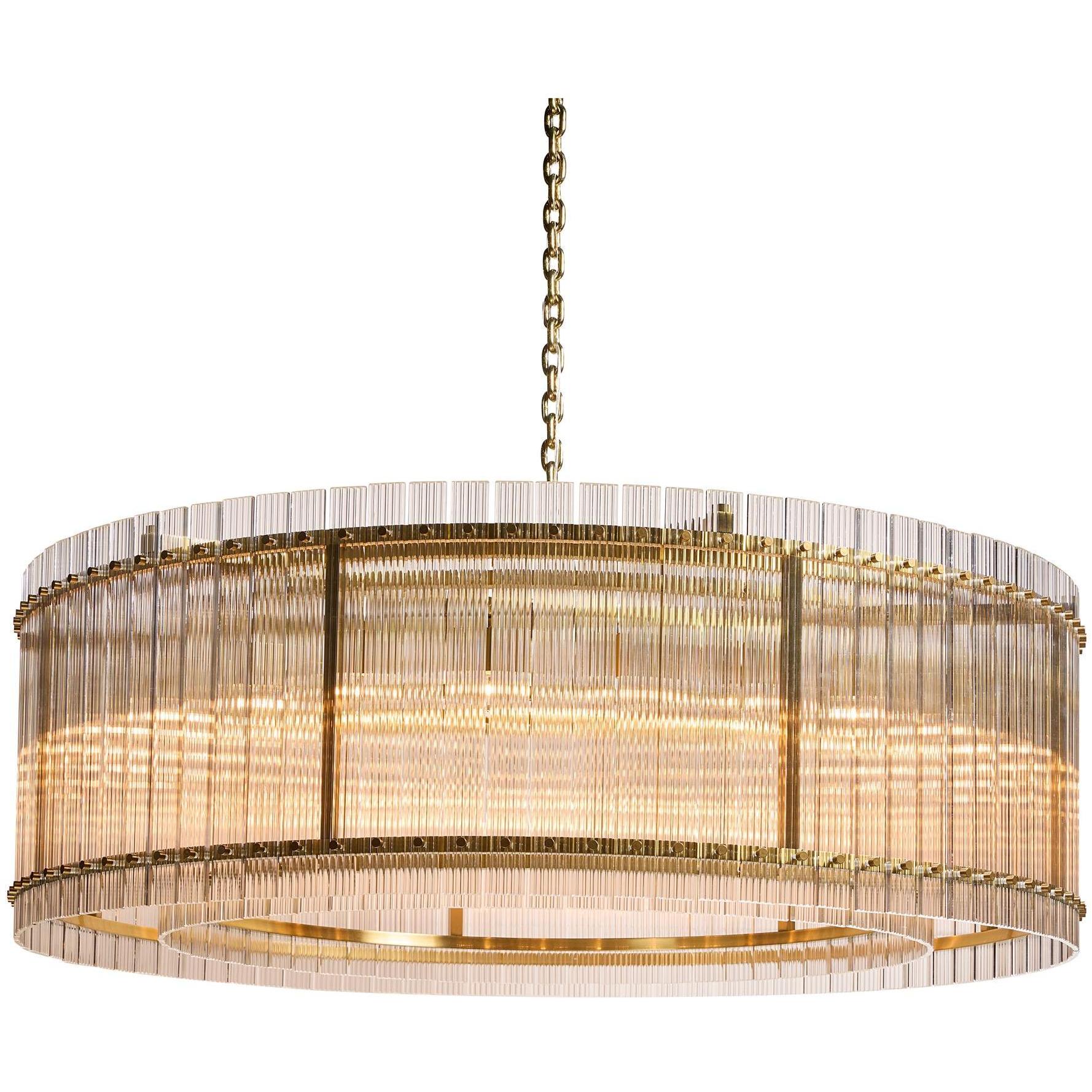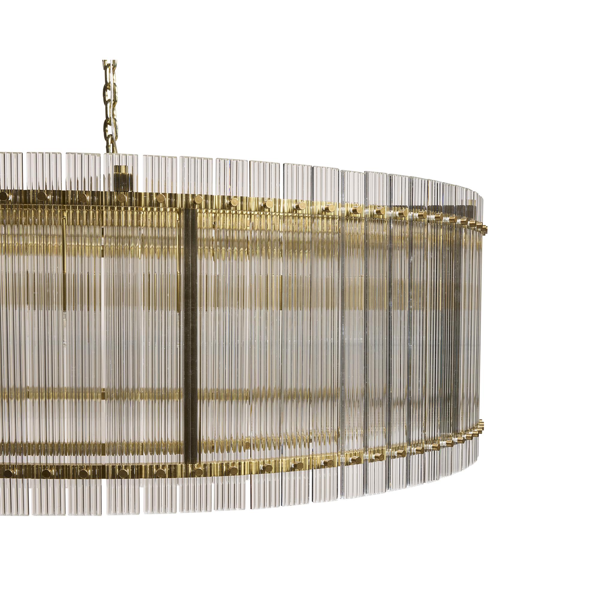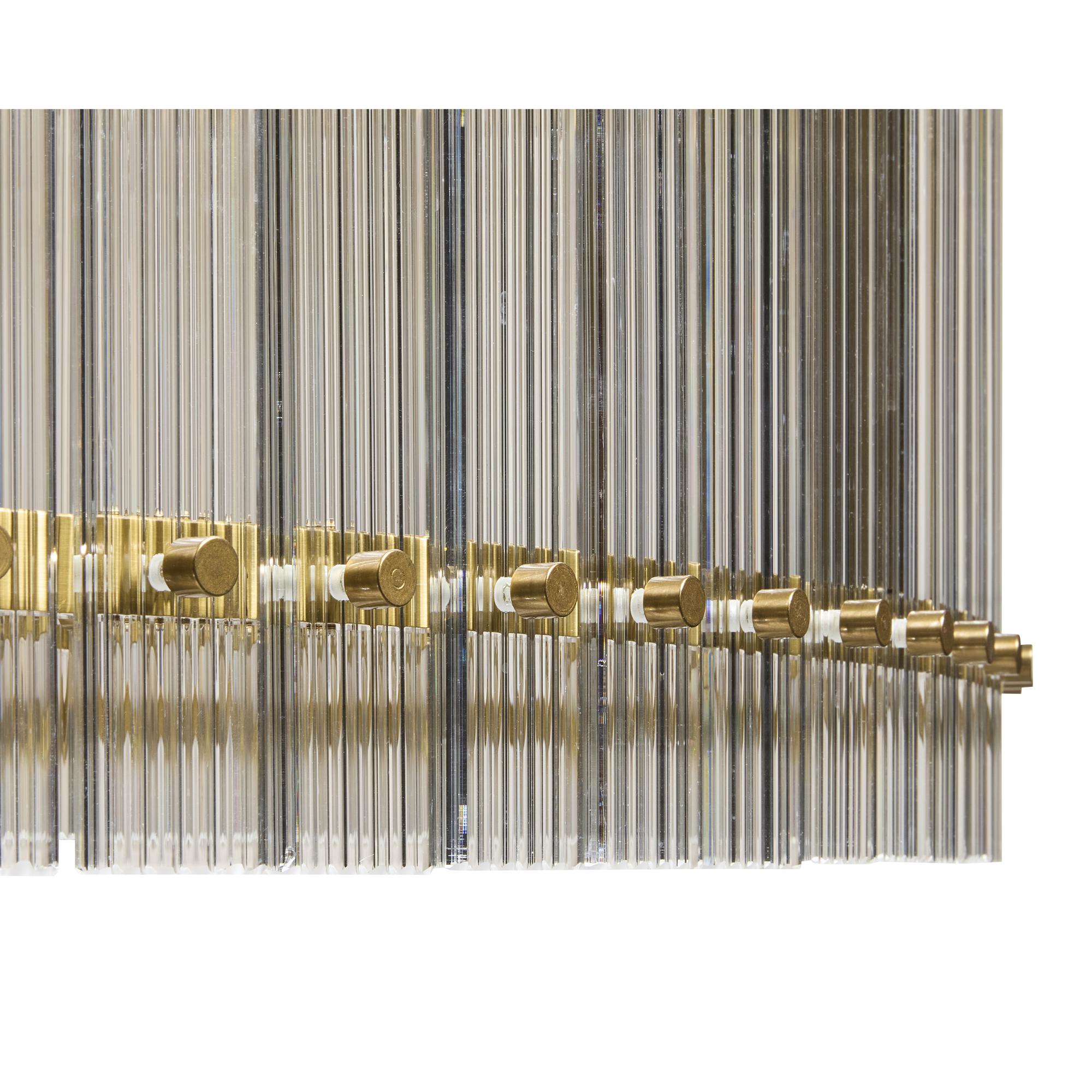 Dazzling and eye-catching, this large, modern chandelier will add a stunning display of radiance to any space. Features a clear fluted glass design with a complementing metal frame in a brass finish. Small version also available.