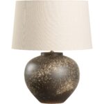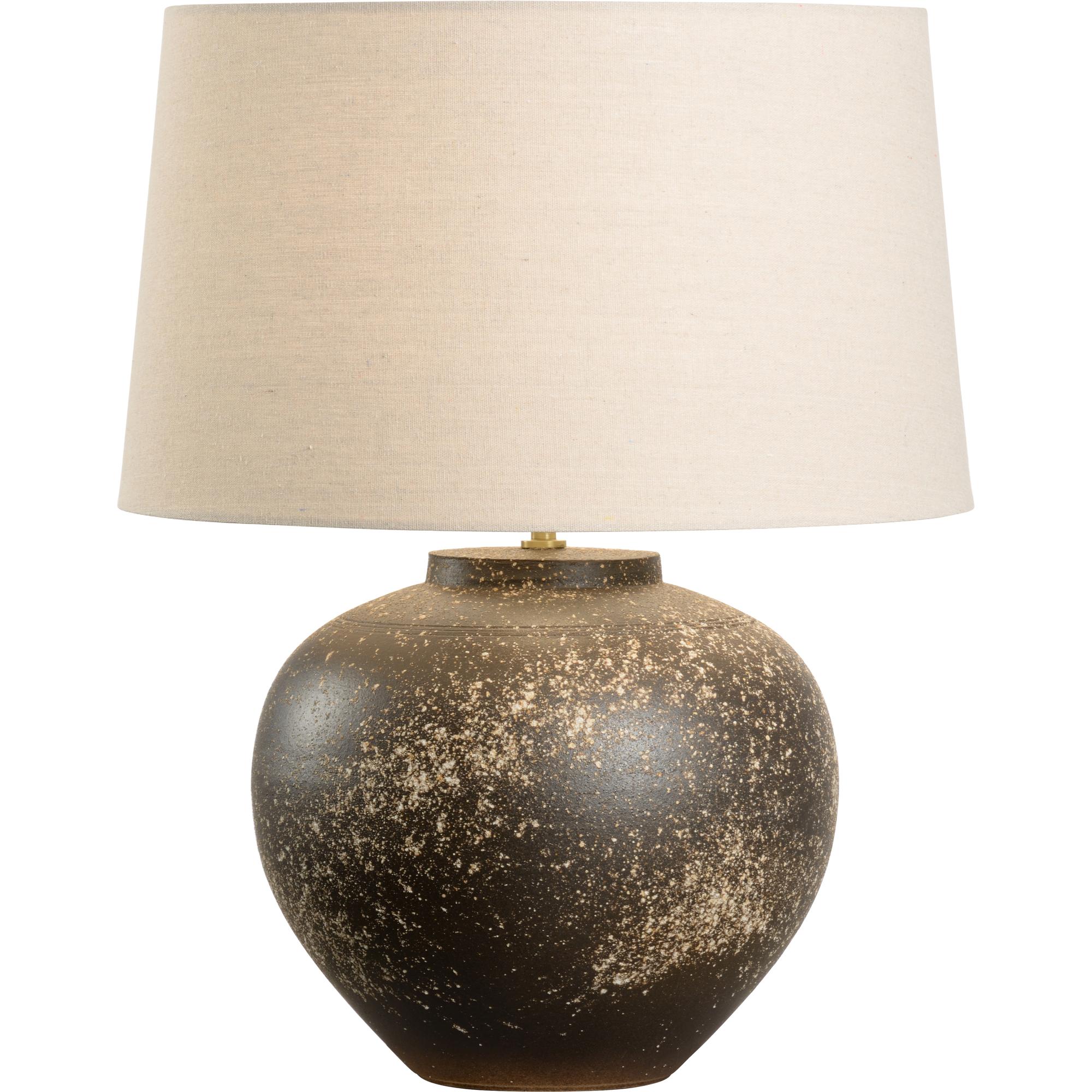 The Kota Table Lamp, part of the Shiga collection, is hand turned with splattered glaze, then oxidation fired – allowing free admission of air during the firing process, making it unique to this type of ancient kiln in Japan. This classic jar lamp is completed with cloth wiring and topped with a refined rolled-edge linen shade. Made in Japan.