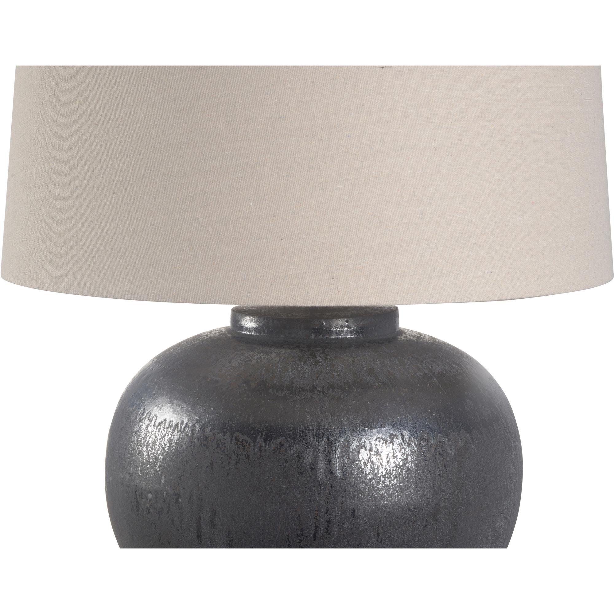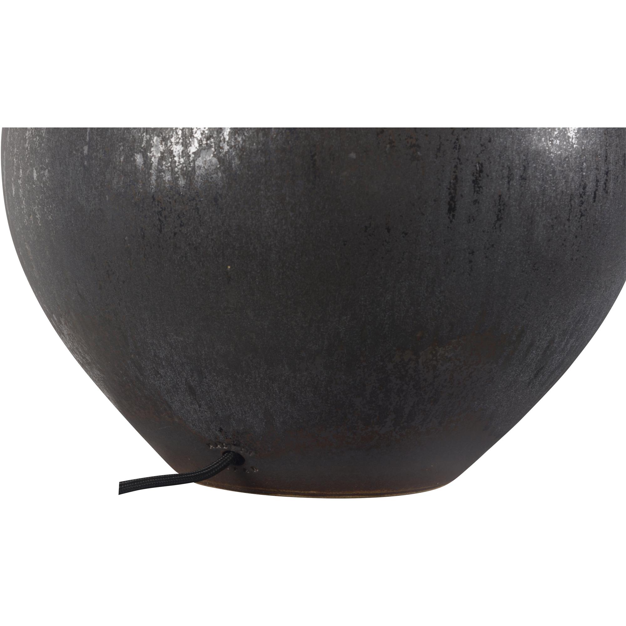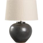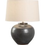 The Kuro Table Lamp, part of the Shiga collection, is hand turned with mineral glaze, allowing iron oxides to be used as part of the coloring process. The Kuro is completed with cloth wiring and topped with a refined empire rolled-edge linen shade. Made in Japan.