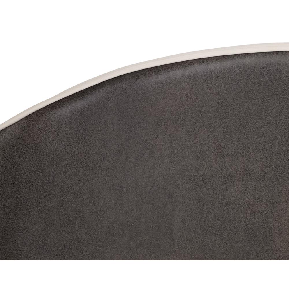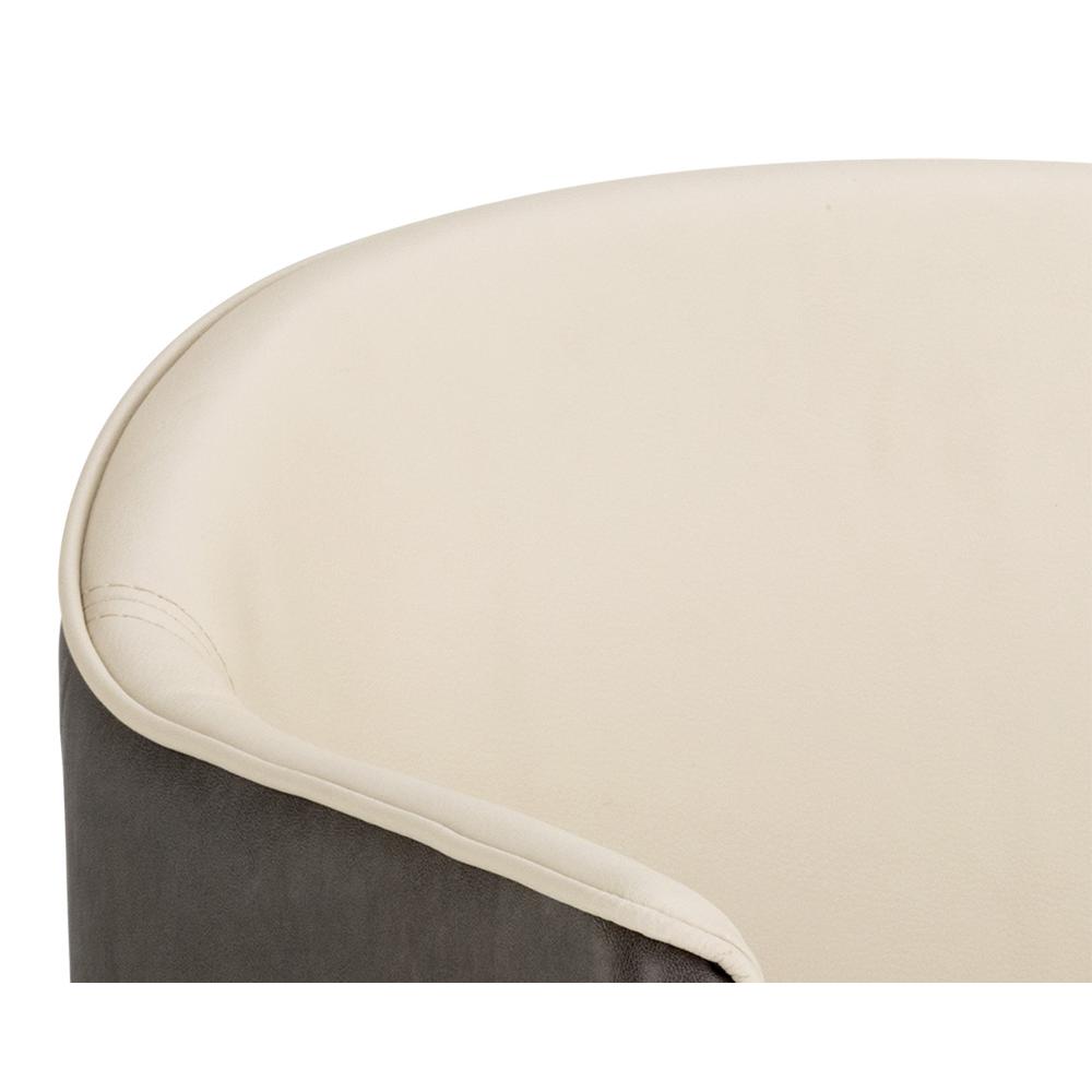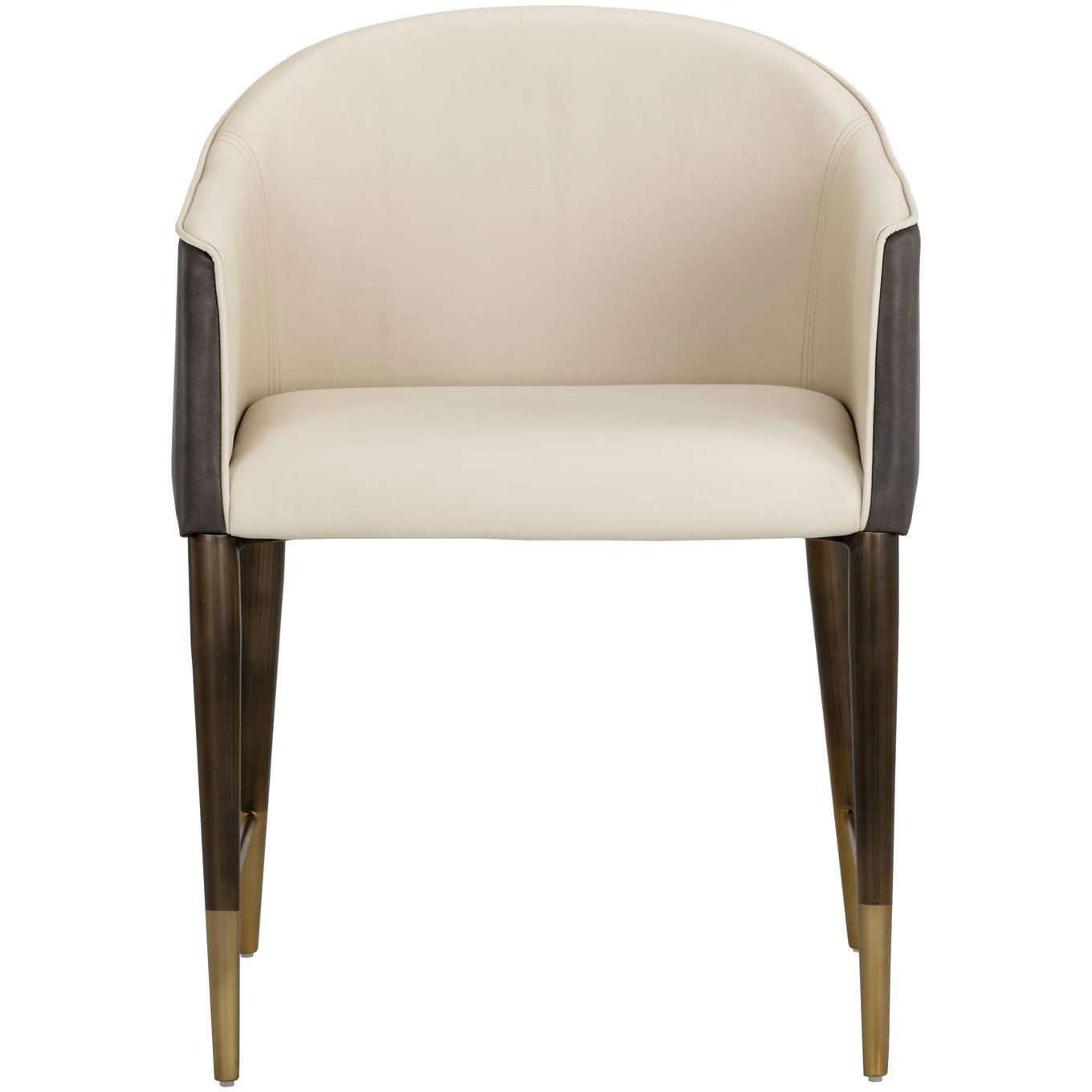 A modern barrel back dining armchair upholstered in dillon cream faux leather and contrasting bravo ash faux leather. Finished with dark brass brushed steel legs with stretchers and brushed champagne foot caps and stretchers. Handle With Care: This design has been crafted with faux leather. Faux leather is manufactured to reflect the natural characteristics of leather; as such, colour variations, markings, wrinkles, grooves, and light scratches are appreciated characteristics. No two pieces will be alike. Visit our Product Care page for more information on how to ensure the lasting beauty of this piece.