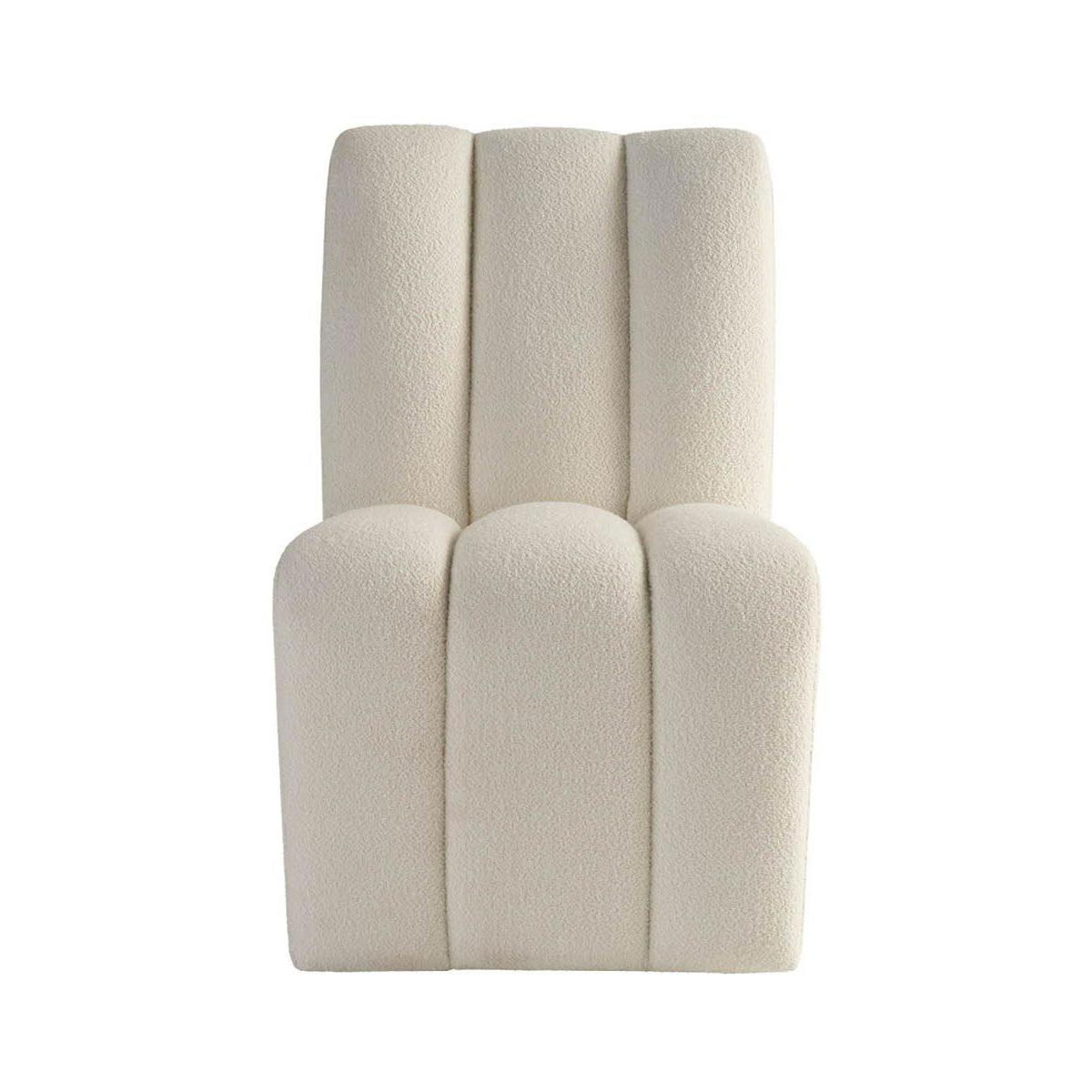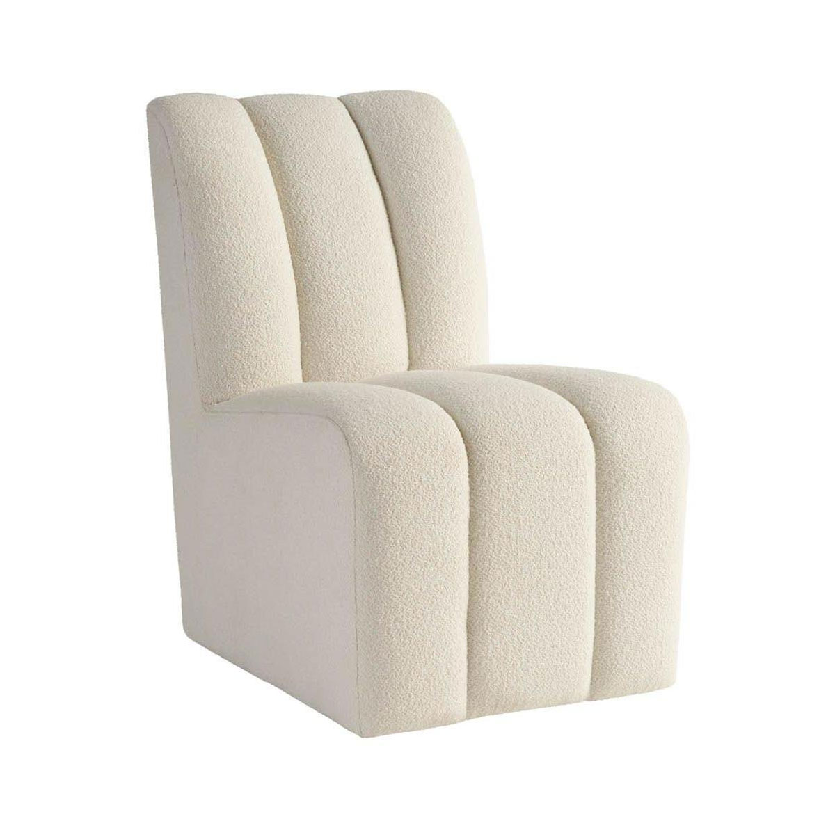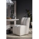 The Kylo Side Chair offers a bold reinterpretation of contemporary luxury, boasting a seat with pronounced tufting that creates a rich tapestry of deep ridges and sumptuous comfort. Clad in the sophisticated Canberra Ivory Fabric, the chair’s design is accentuated by three elegantly upholstered vertical sections, each contributing to its visual allure. Mounted on sleek casters, it combines effortless mobility with a modern, refined aesthetic.