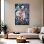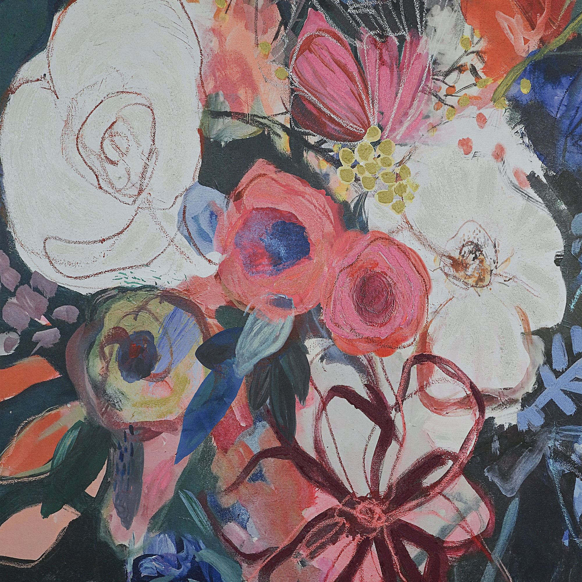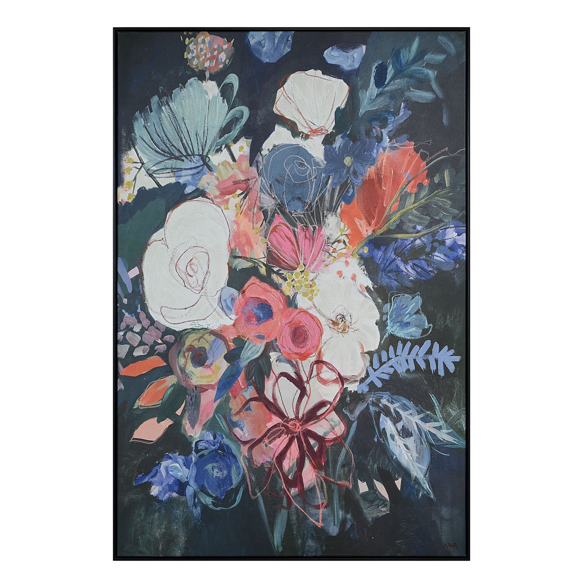 A symphony of colour across a dark canvas, this beautiful bunch of blooms was chosen for its ability to bring a fresh update to any contemporary or transitional space. Artfully printed on a high-quality cotton-linen canvas with hand-painted textured accents, this black-framed oversized piece is poised to become a conversation starter anywhere it hangs.
