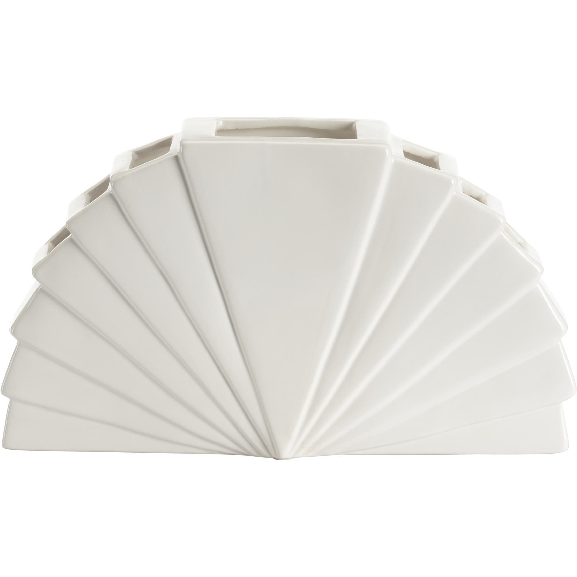 The La Feria Vase, crafted from glossy white ceramic, showcases a striking fan silhouette that brings elegance and vintage charm to any decor. Available in two sizes. Designed by Elizabeth Wicker.