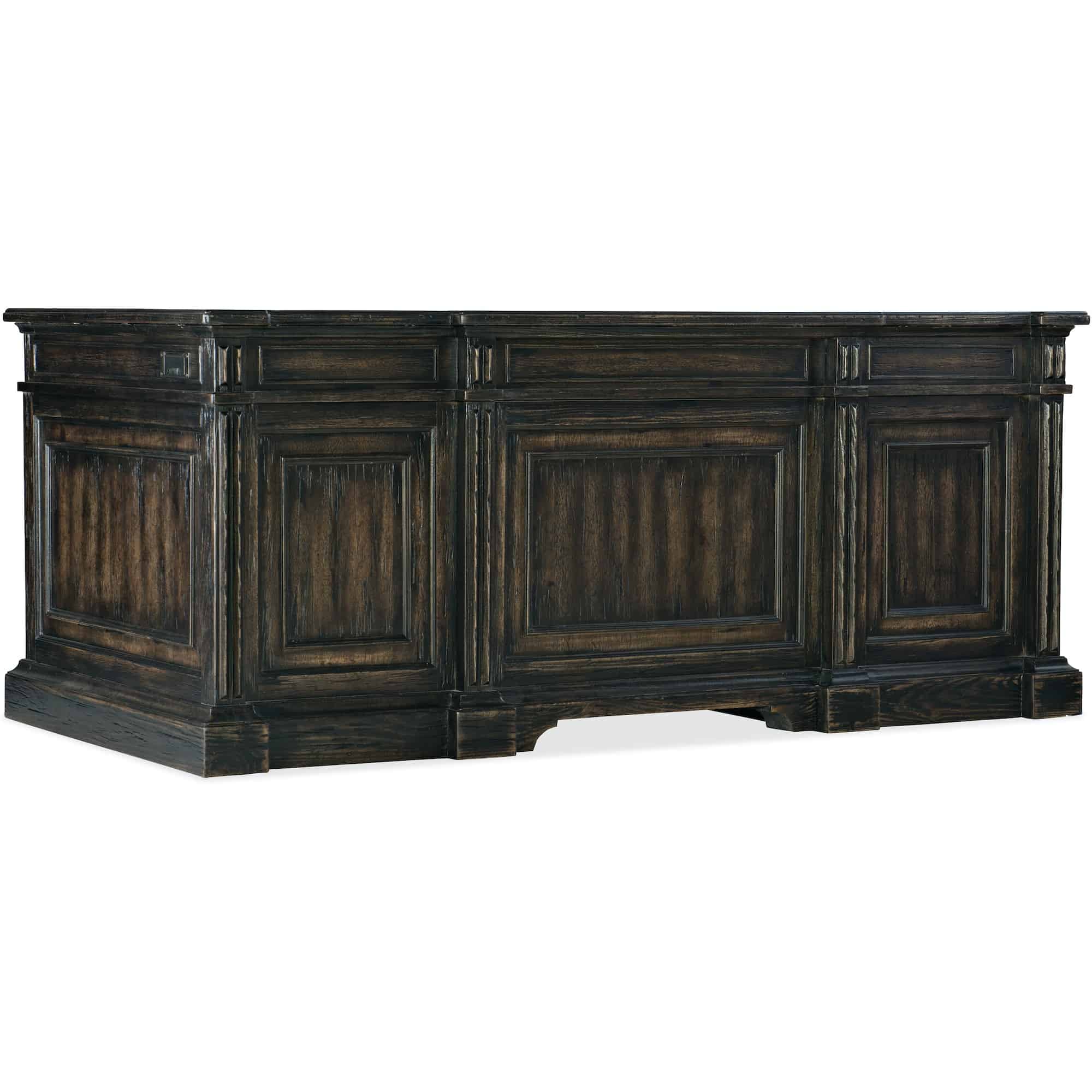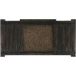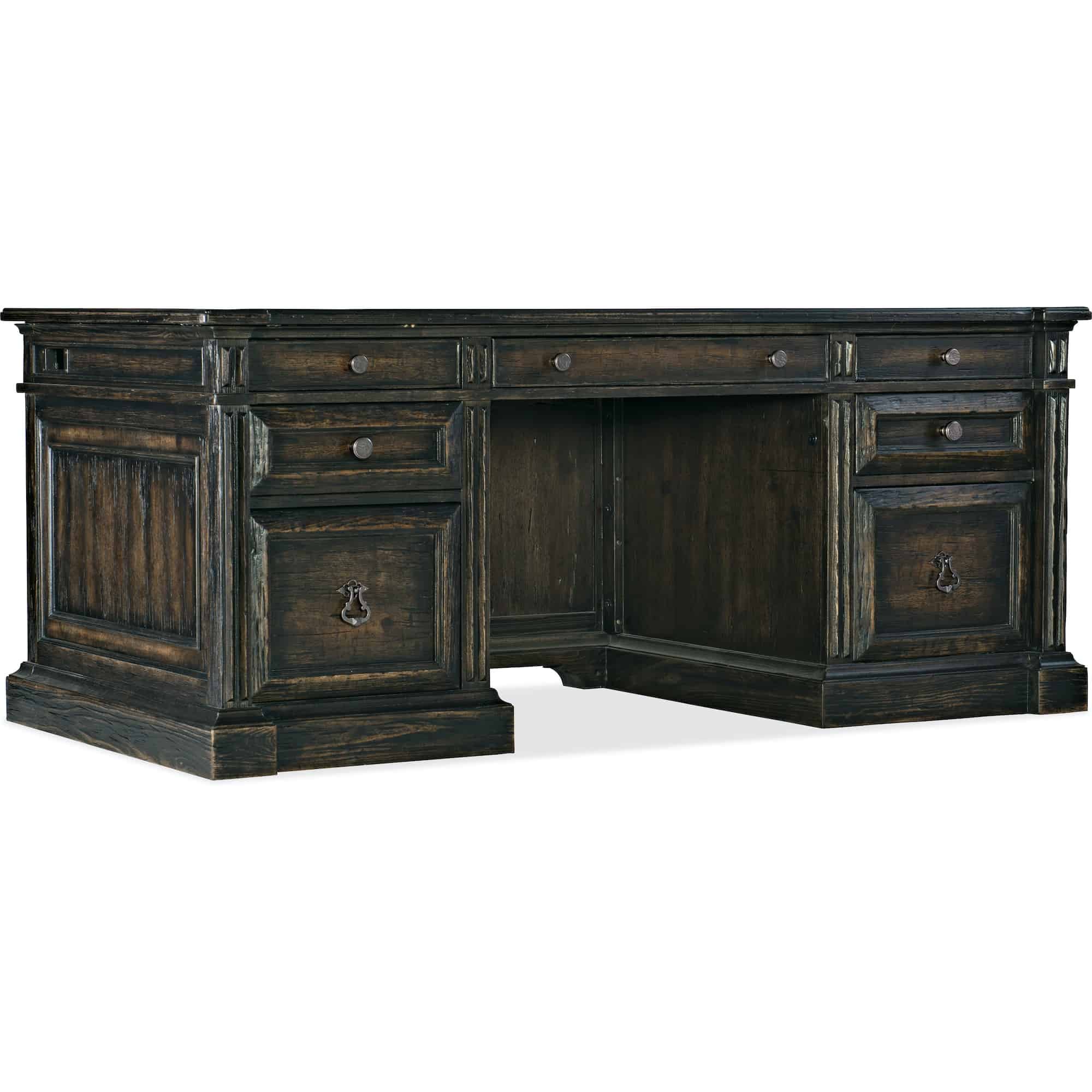 Finish: Antique Varnish, a rich dark finish with highlights of natural wear and distressing. Distressing includes rasping, chopping, gouging and worm holes. Ring pulls and knob hardware are gunmetal color.
