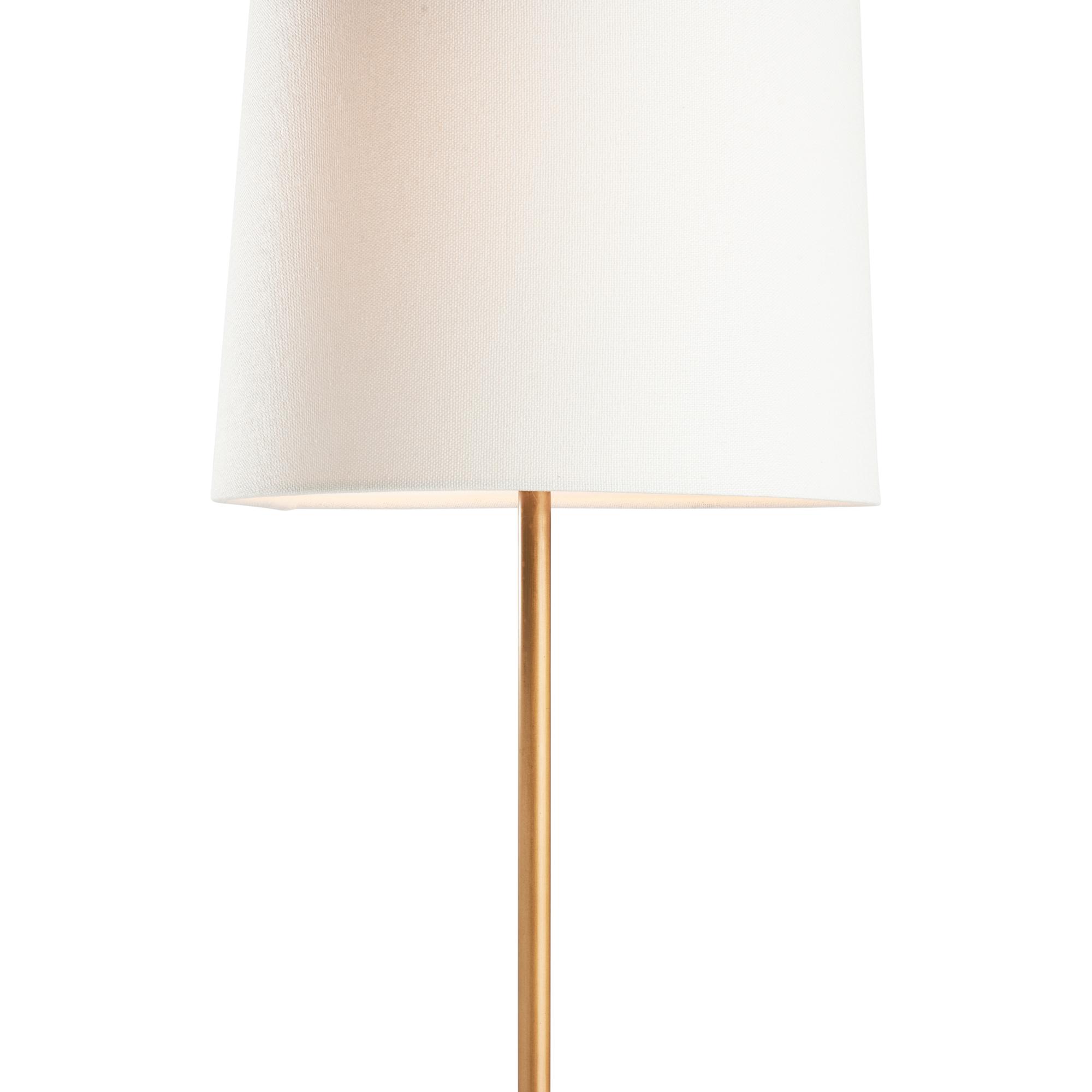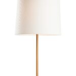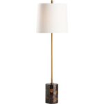 This contemporary lamp features a brown marble base with natural veining, accented by a sleek metal body in a rich gold finish. Its minimalist design and refined shade create a warm, elegant glow, blending modern style with timeless luxury. Designed by Jamie Merida.