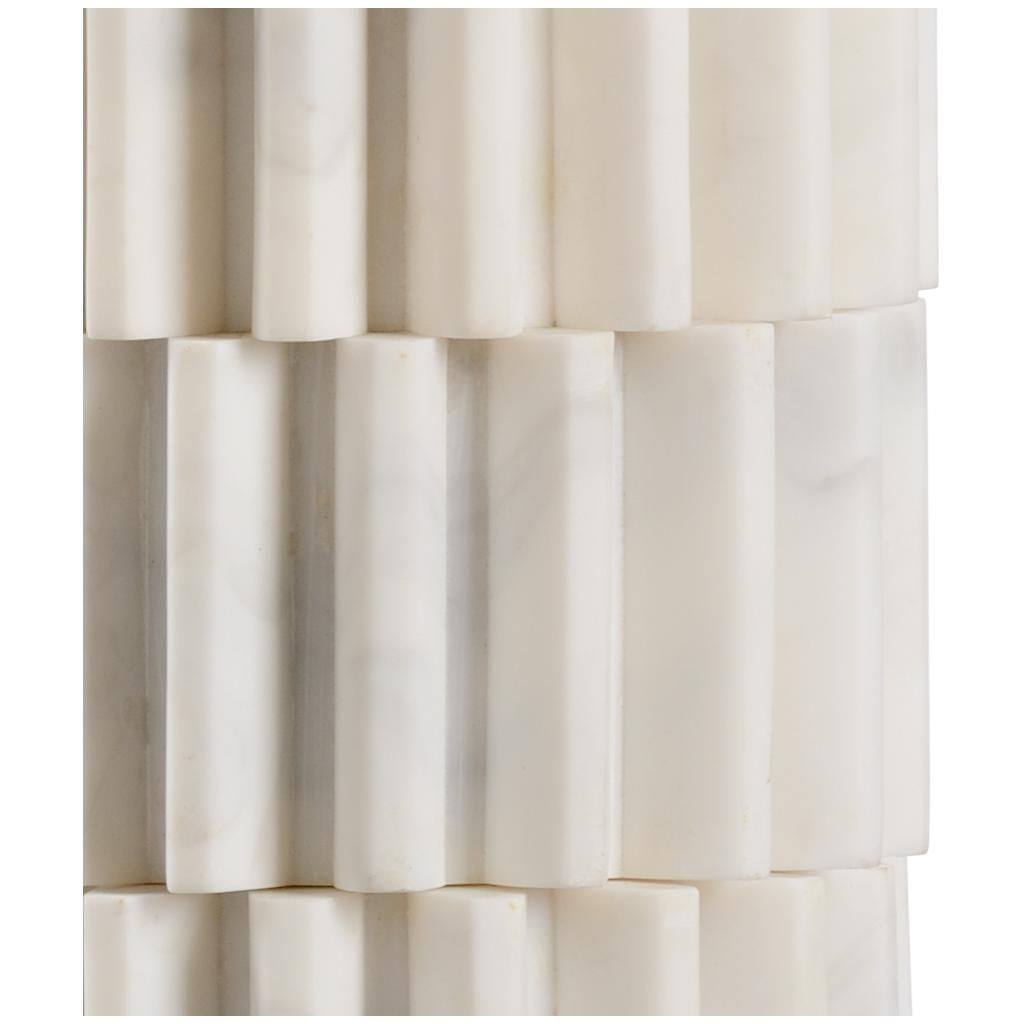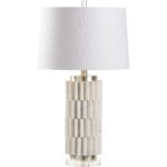 Our modern interpretation of industrial gears, Langdon Lamp features a cast of natural white faux stone on a crystal mount. Secured with a clear acrylic finial, the off-white linen drum shade softens the masculine look and enhances the neutral design.