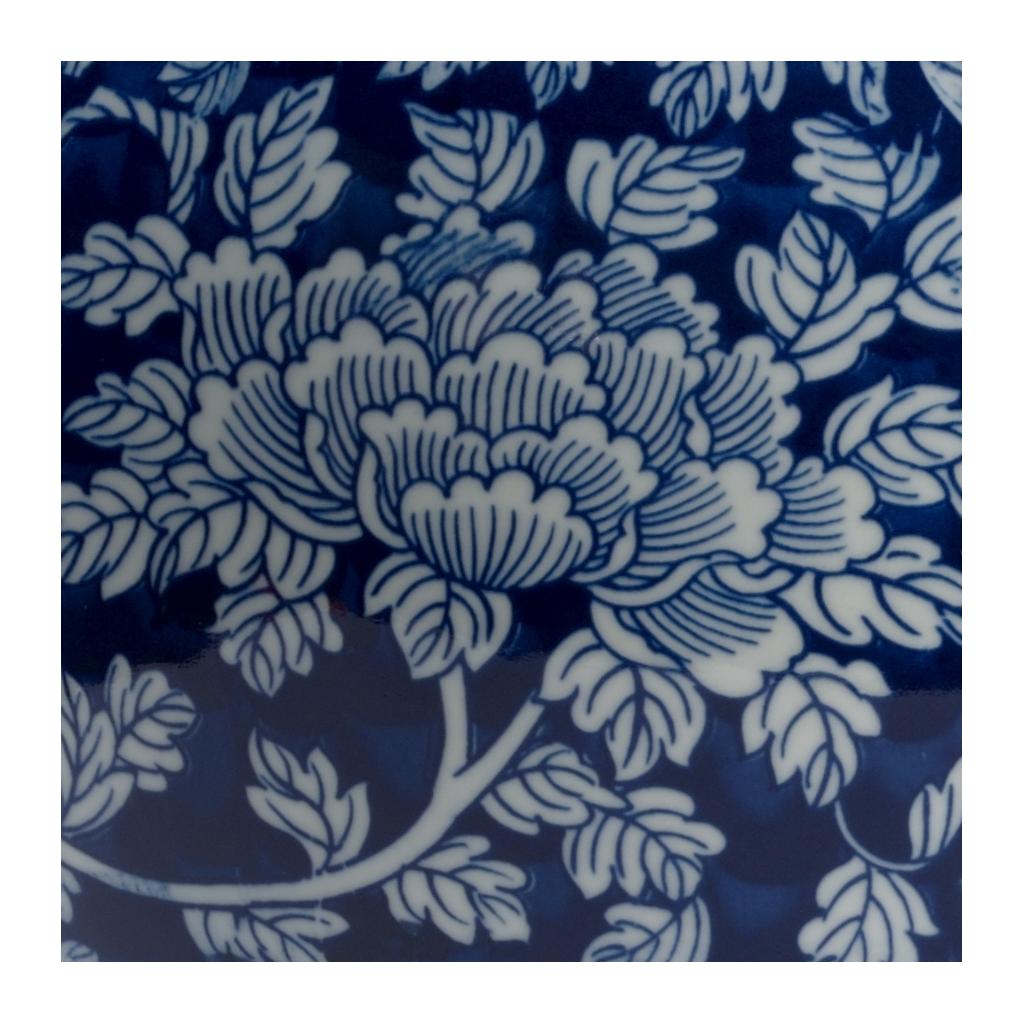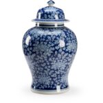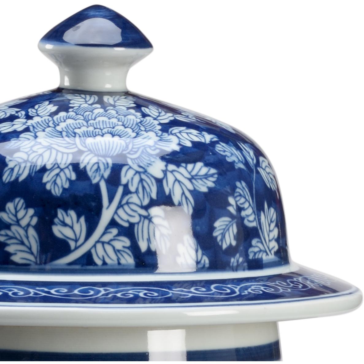 Hand painted blue ceramic vase with a removable lid and decorated with a white vine design.