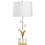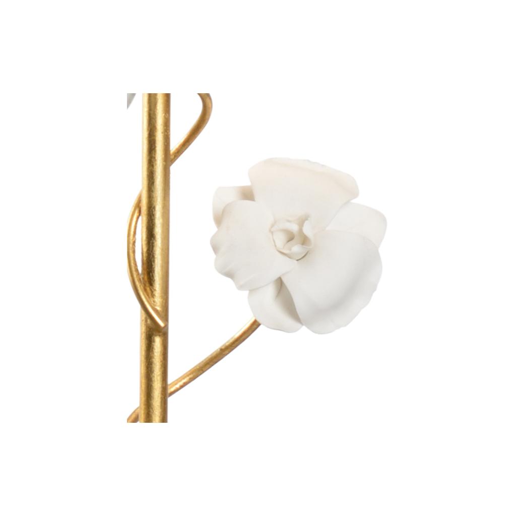 Hand formed white porcelain flowers on gold leaf iron stem with iron and crystal mount.
