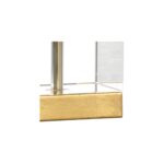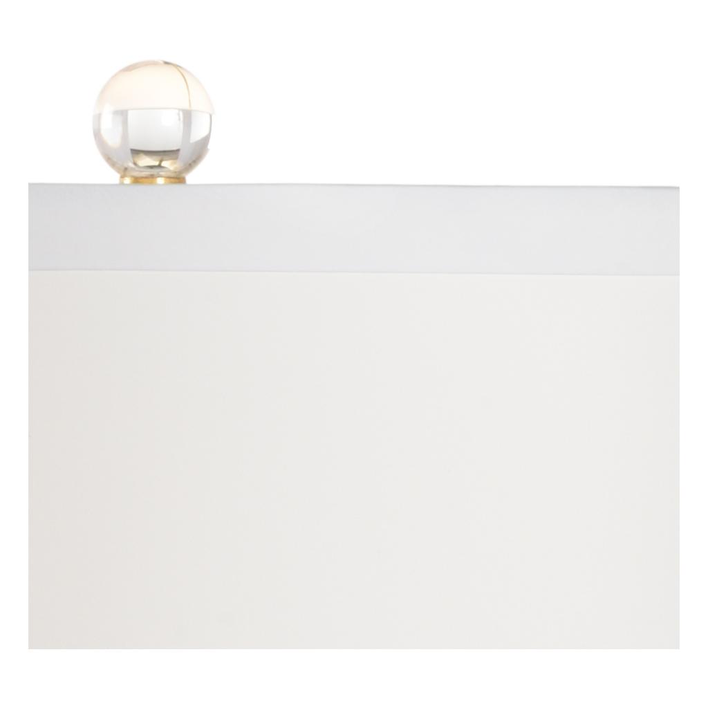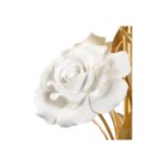 “What a lovely thing a rose is!” featuring antique gold leaf iron, the leaves and stem hold hand crafted matte white porcelain rose blossoms. A square clear crystal base with antique gold trim supports the rose stem. An acrylic finial and off white silkette tapered drum shade complete the elegant table lamp.
