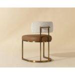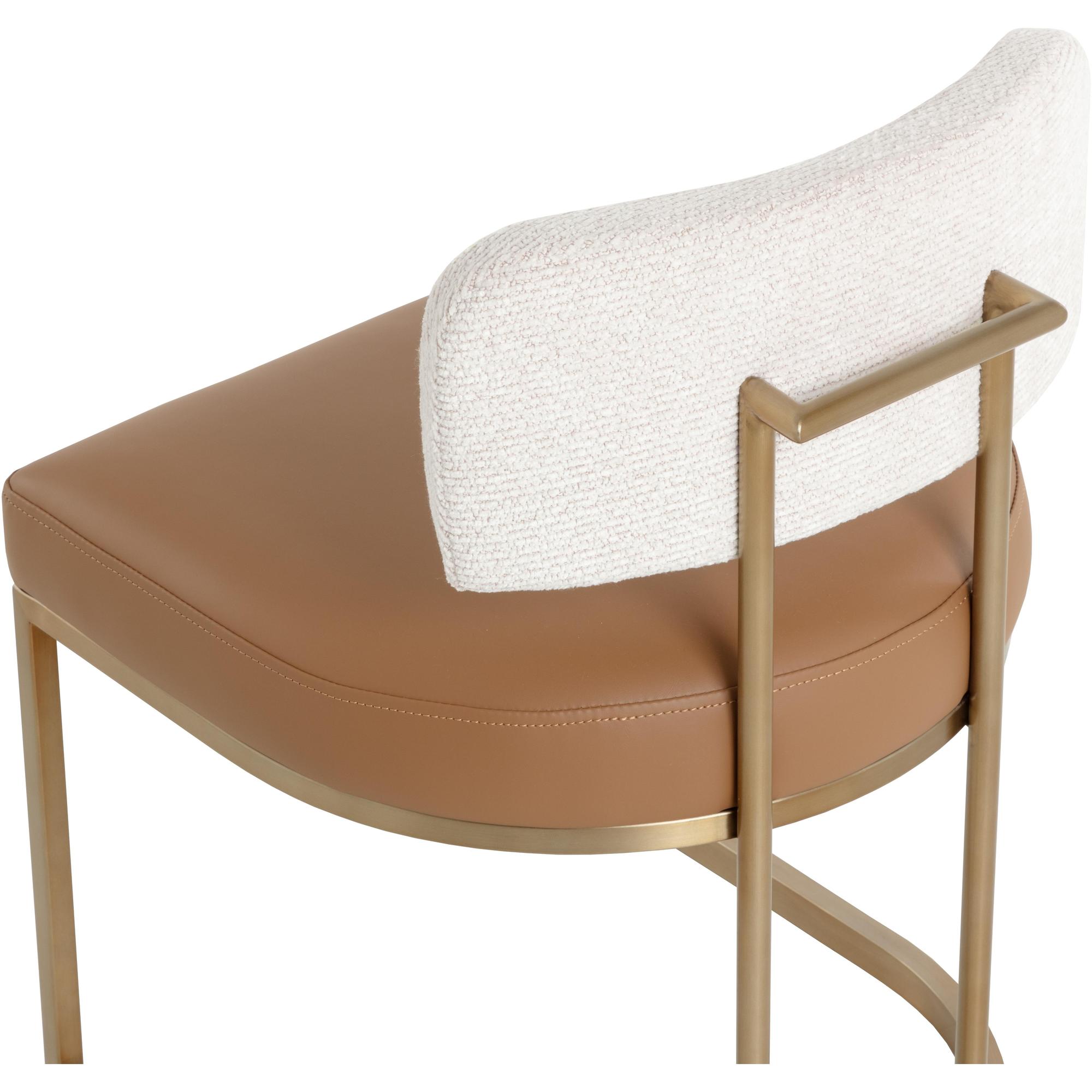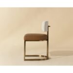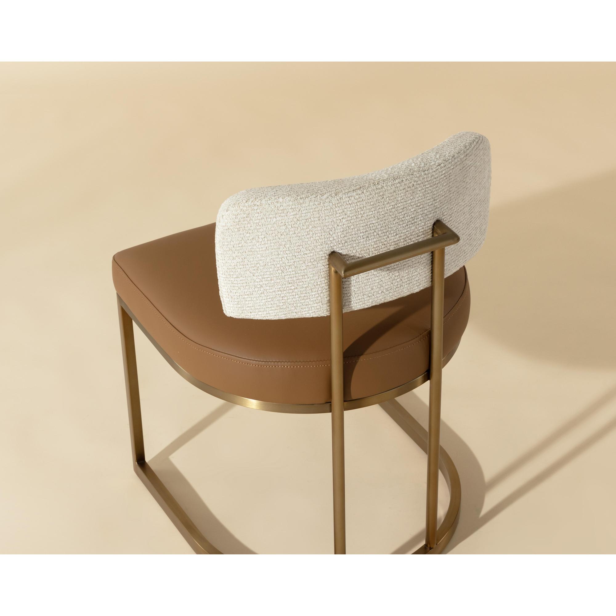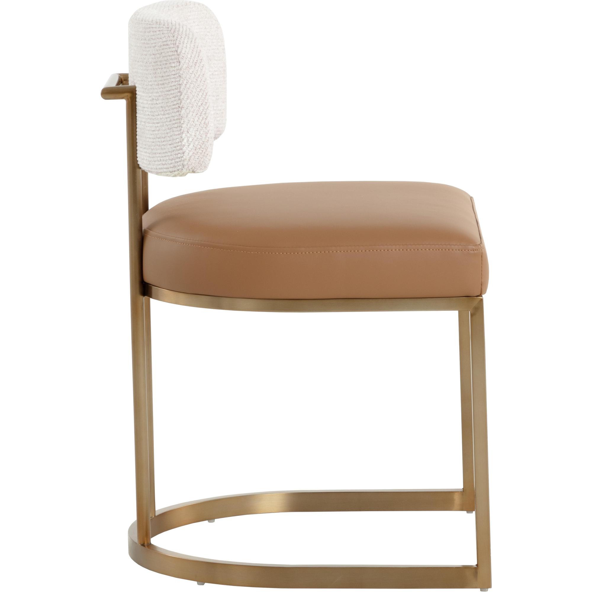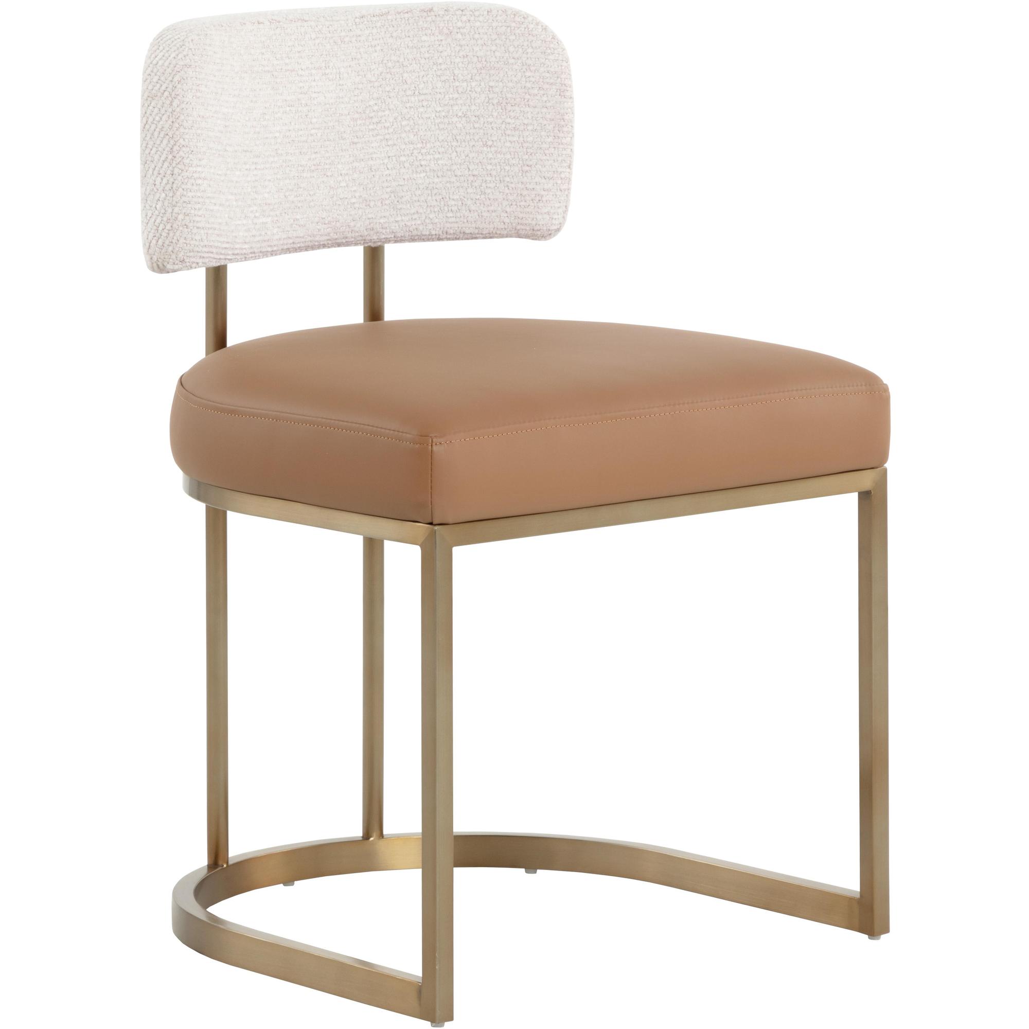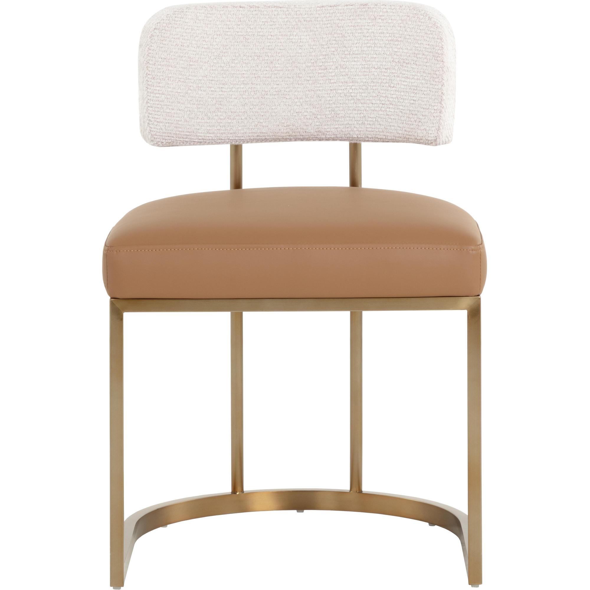 The Larissa Dining Chair brings together a beautiful display of mixed materials. A low seatback upholstered in rhea light barley fabric contrasts the warm tones of the seat upholstered in napa cognac faux leather for an elevated aesthetic. The antique brass stainless steel frame features a handle on the back for a functional and stylish addition.