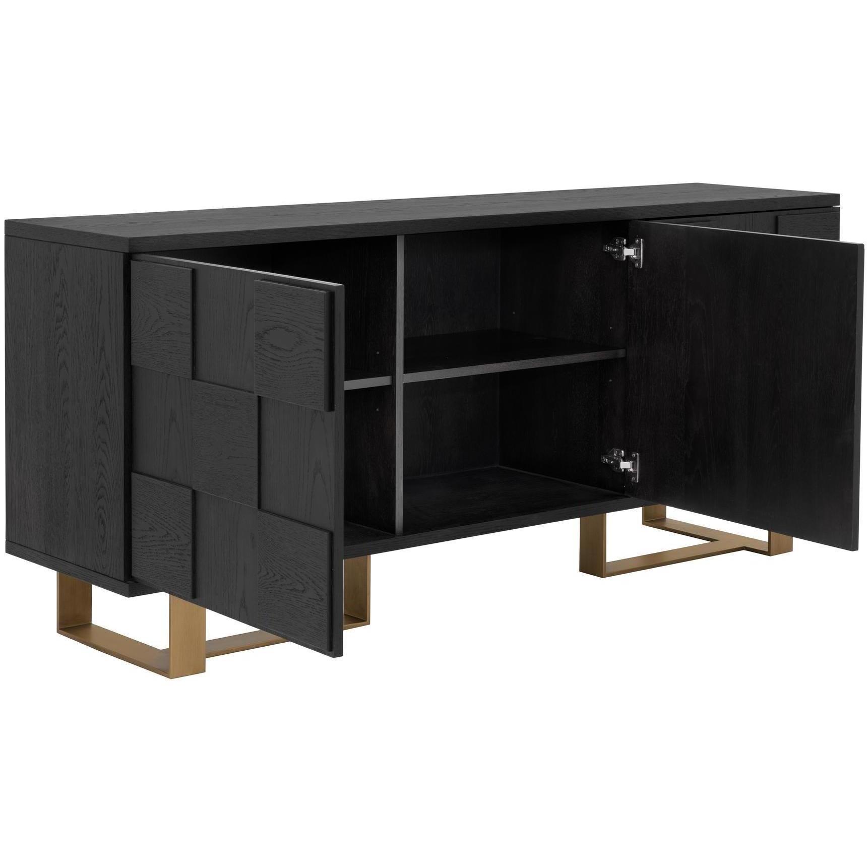 This bold sideboard will bring style and warmth to various dining and living spaces. Crafted with smoked acacia wood and an antique brass frame. Three large cabinets with three-dimensional checkered wood doors provide ample storage. Suitable for residential and contract environments. As wood is an organic, porous material, these pieces will contain natural variation of texture and may also exhibit fine indentations and cracks. Wood pieces will also display a disparity of colour and grain, and visible knots and burls that add to the character of each piece.