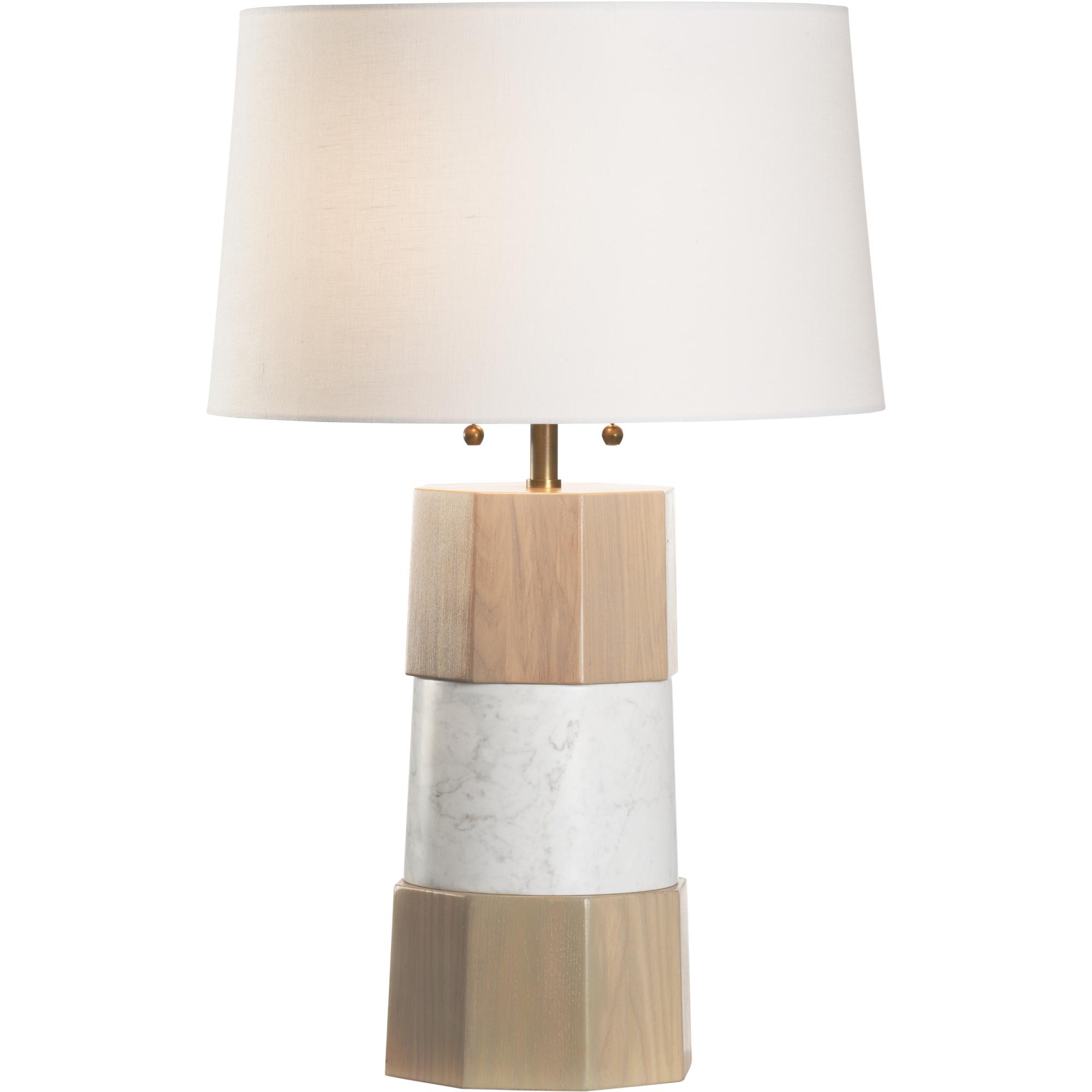 A honed Carrera marble belt intersects a faceted body of rift-cut white oak. The Laurence Table Lamp embodies power and beauty while offering a large-scale sculptural solution. This piece works equally well as a single point of illumination or as a pair.