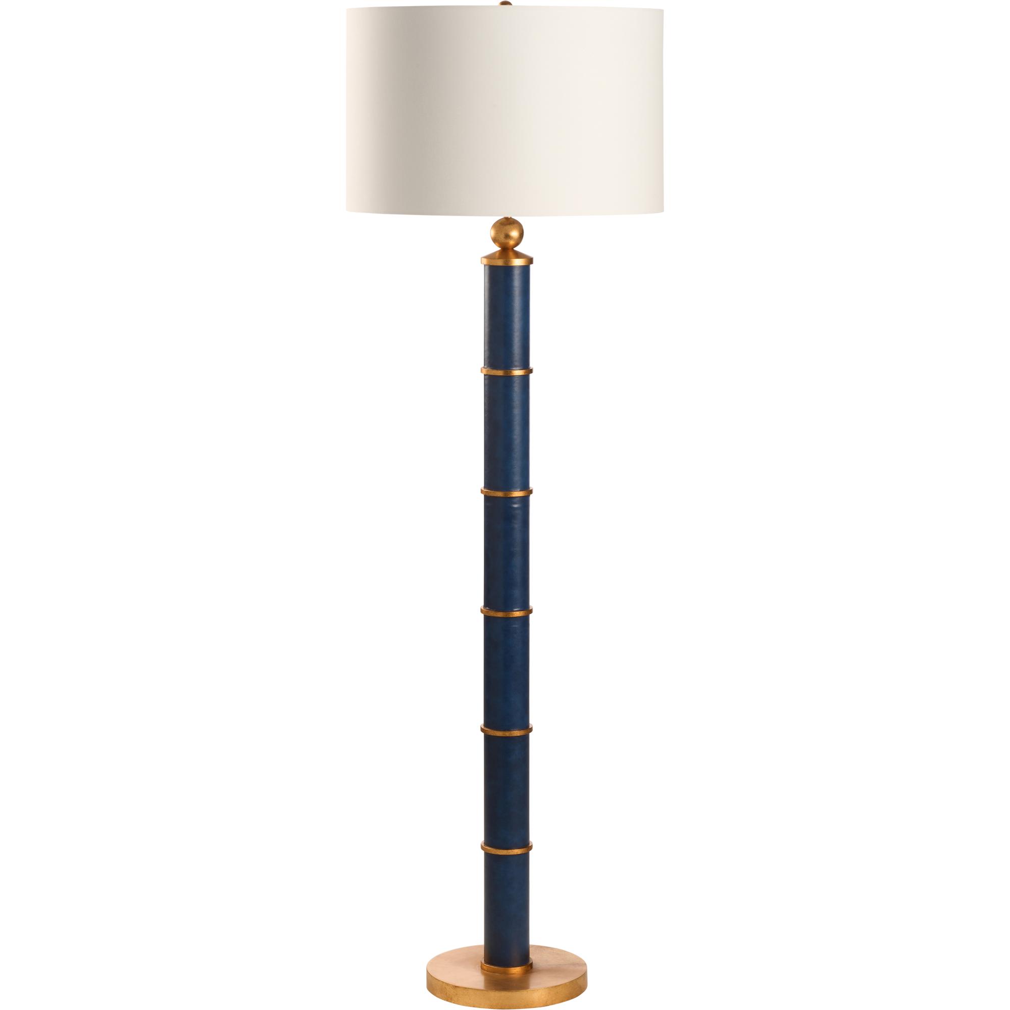 This navy leather floor lamp exudes handsome sophistication, featuring rich leather wrapped around the body and adorned with elegant gold accent bands. A polished gold ball detail adds a refined touch, blending modern luxury with timeless style. It’s a striking statement piece that elevates any interior with its bold, tailored presence.