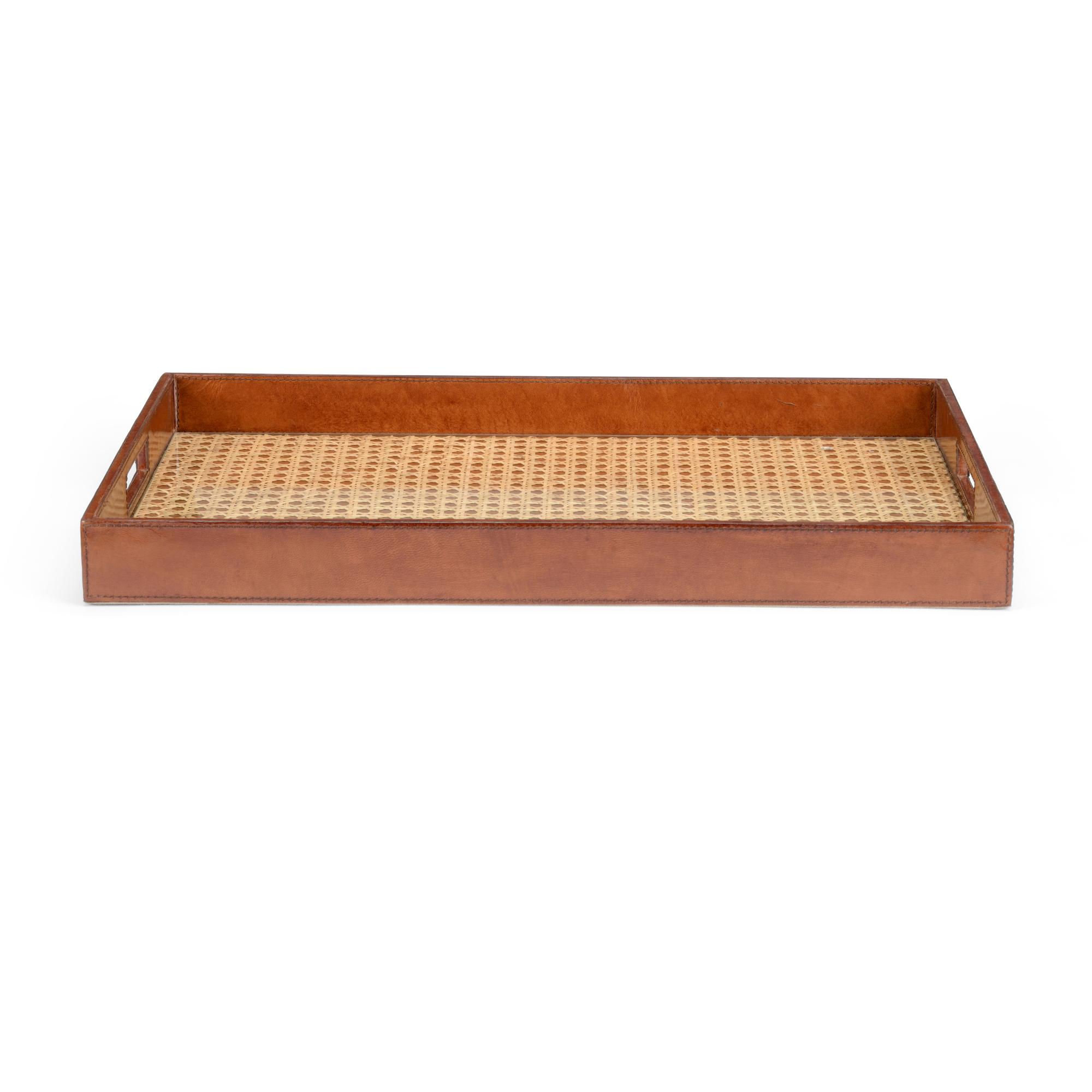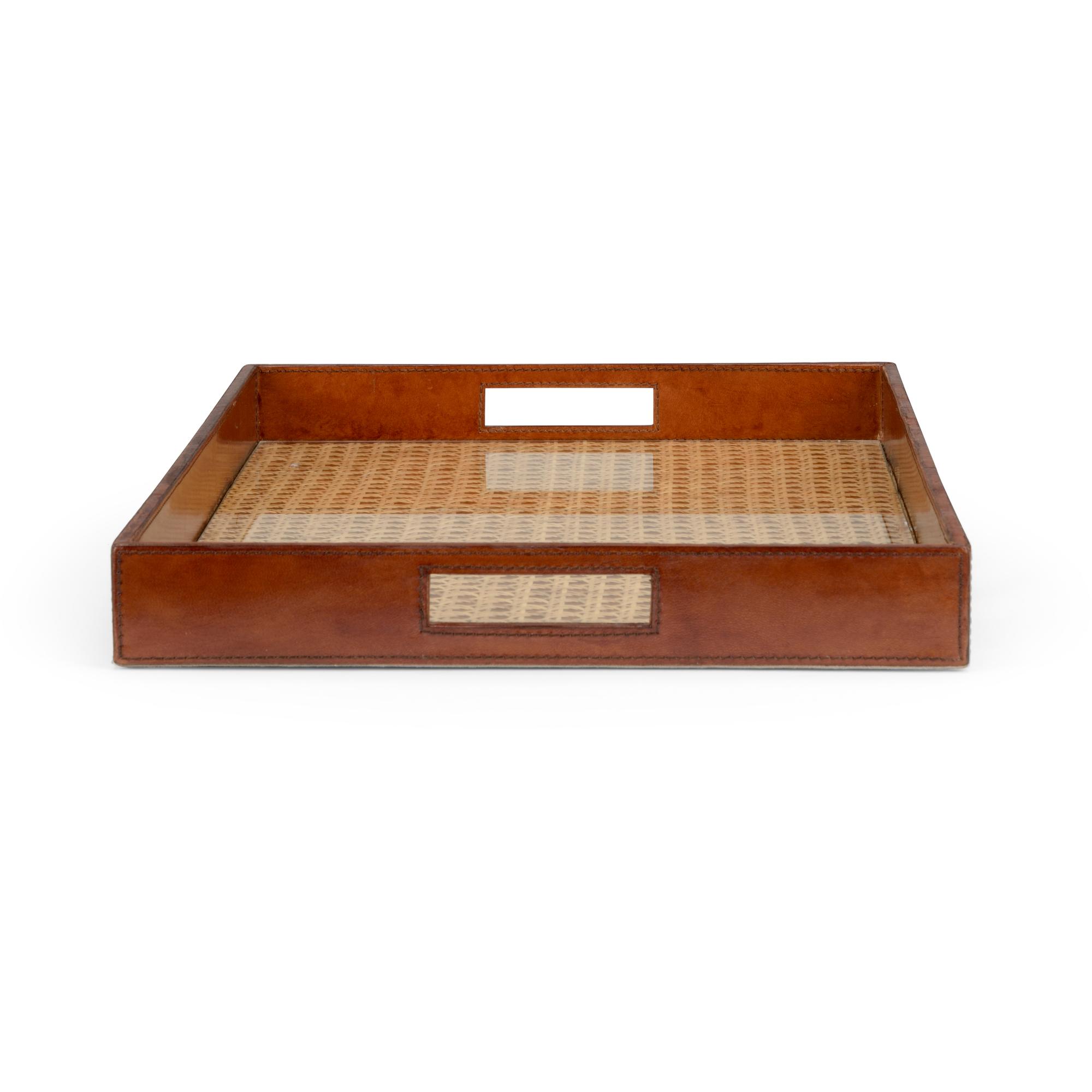 Perfect for entertaining or as a handsome accent, this tray is handcrafted of rich leather with a cane bottom overlayed with glass. A luxurious tray to serve guests.
