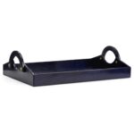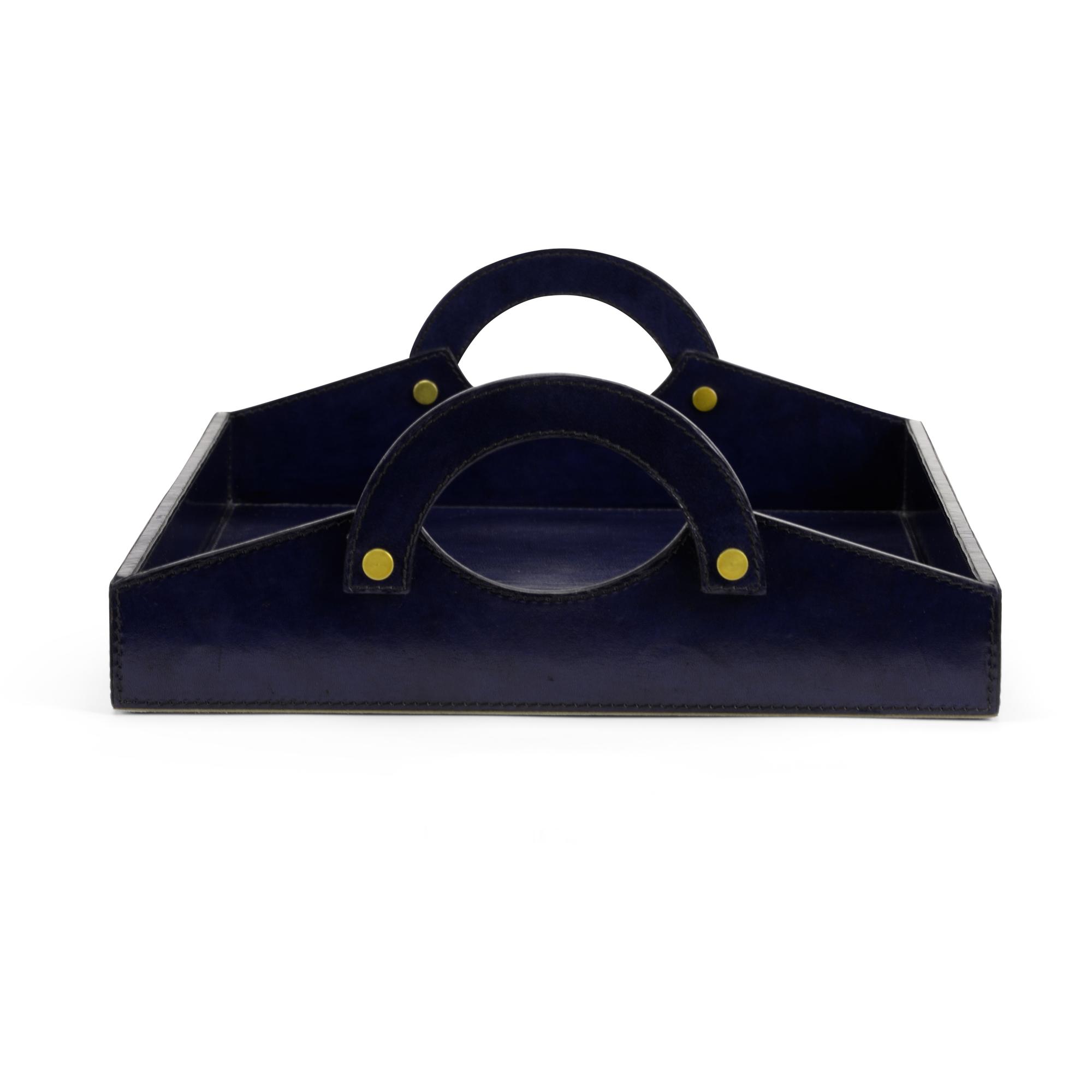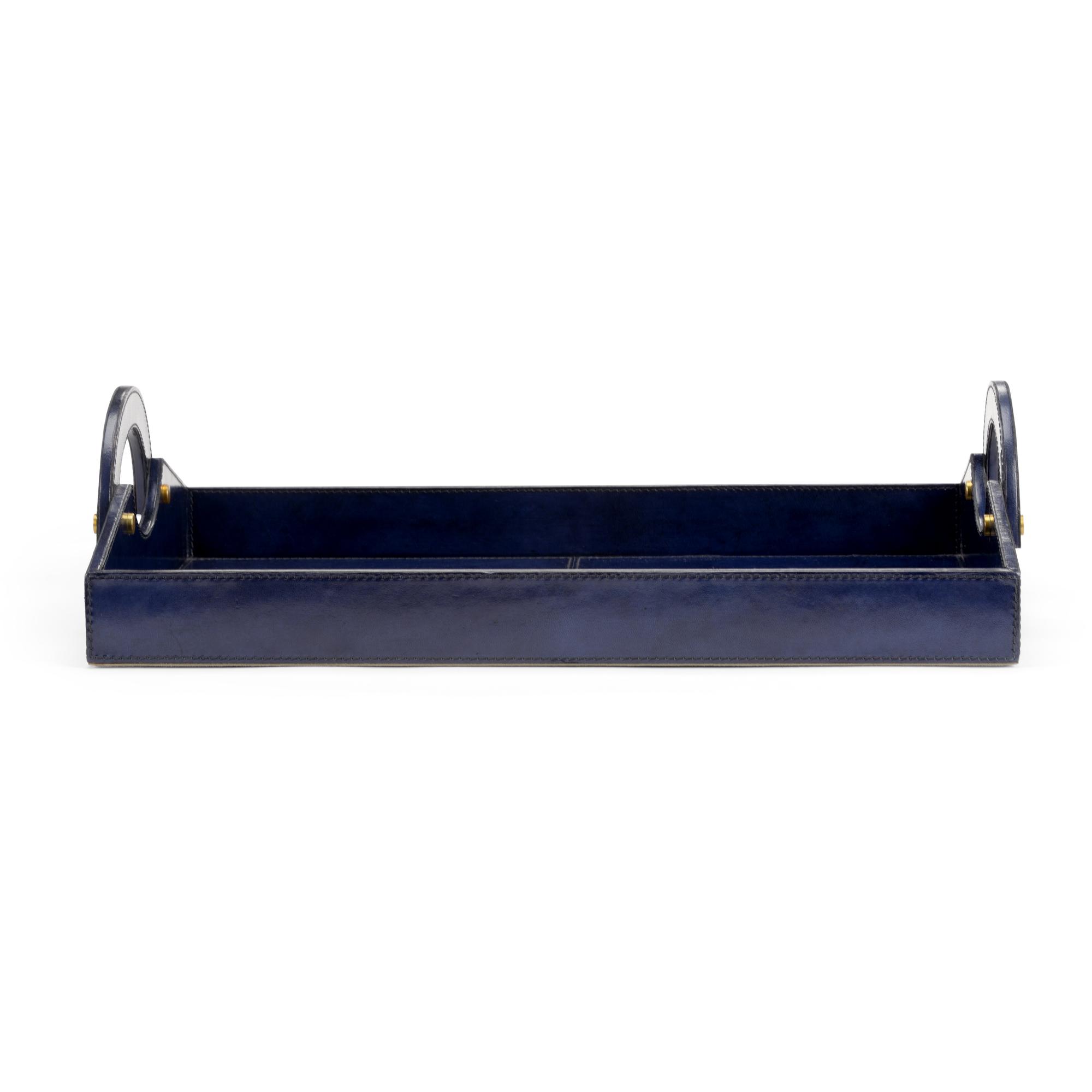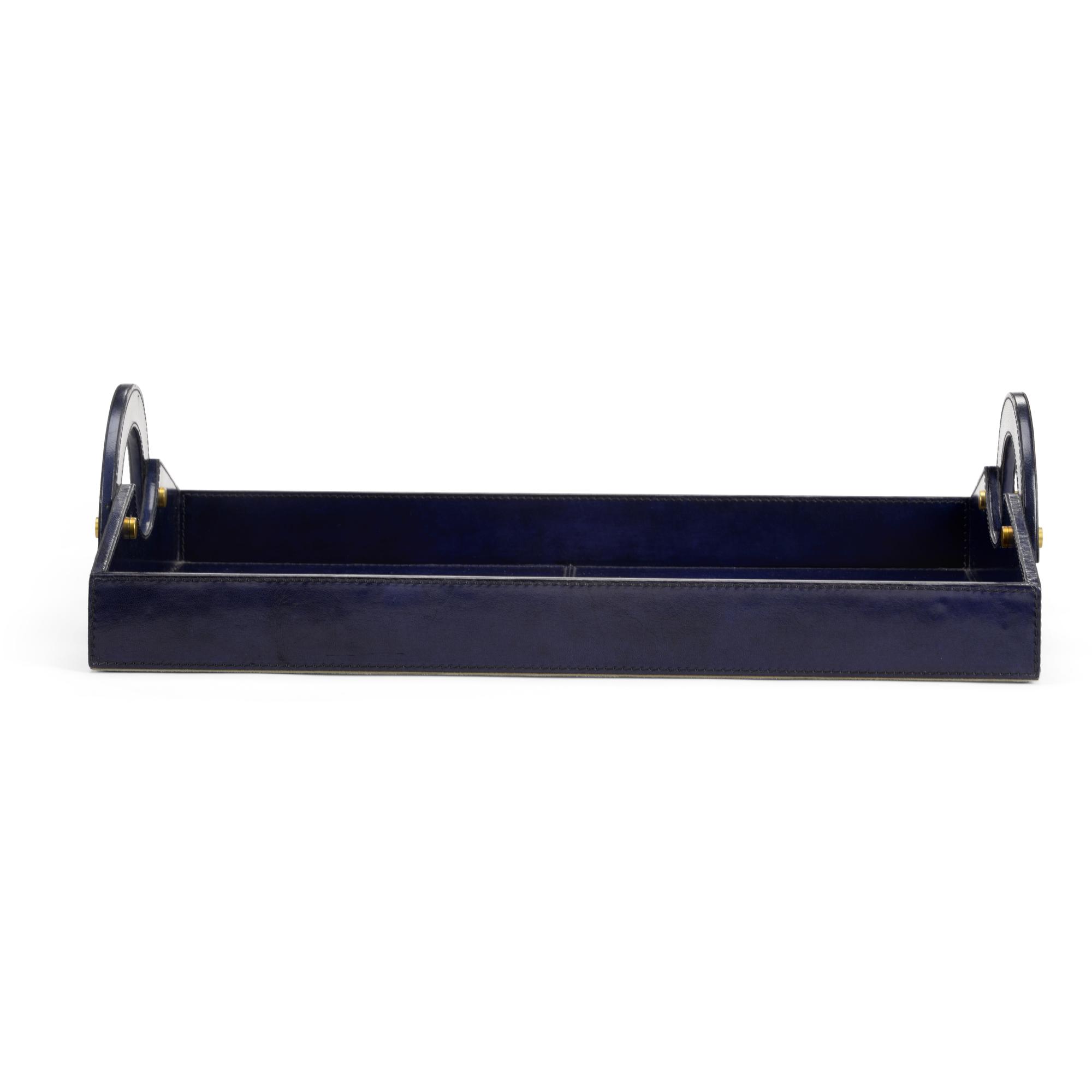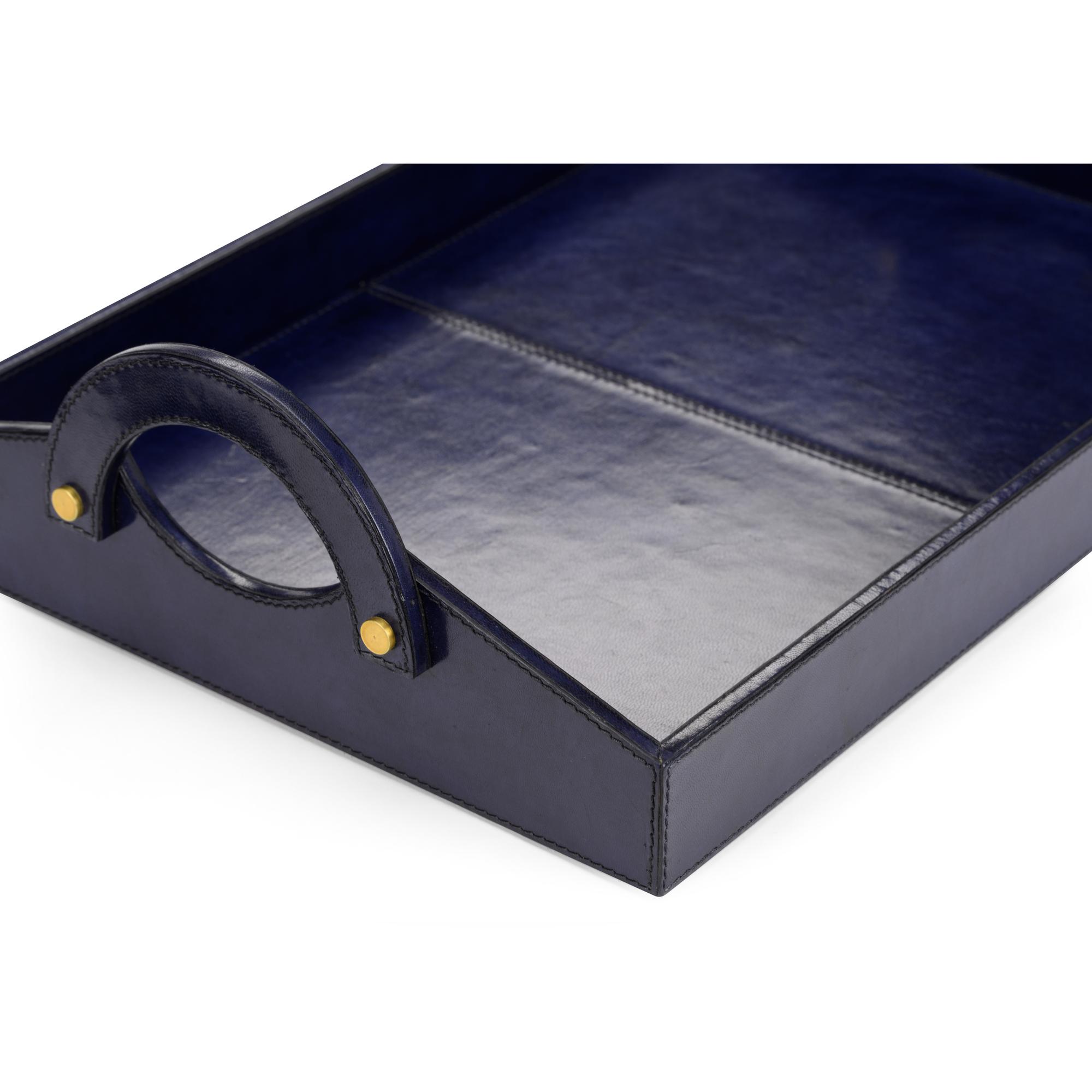 Sleek, classic handcrafted leather tray in rich midnight blue leather with leather handles. A beautiful decorative accent or a luxurious functional tray for entertaining.