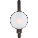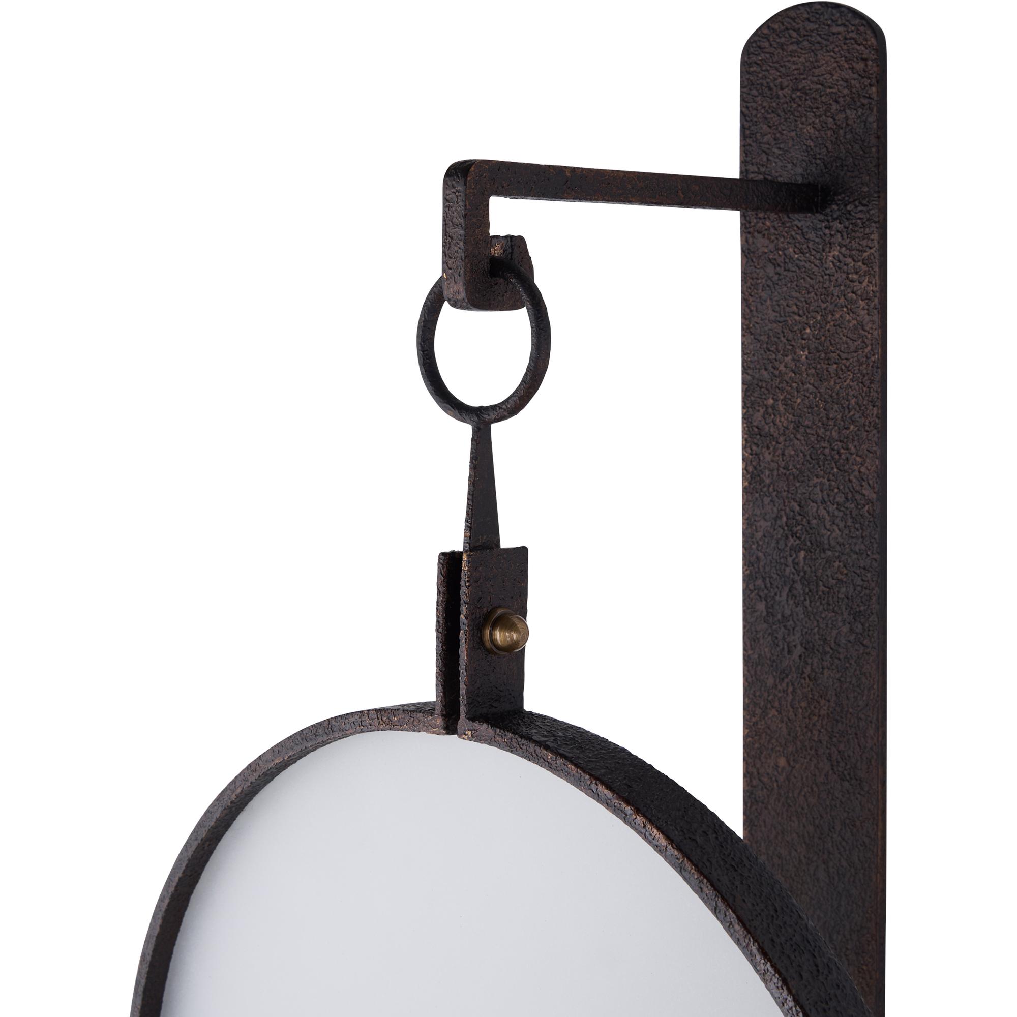 Add warmth and style to your walls with Leggit Sconce. Featuring an antique bronze finished iron supporting a round clear glass shield, this hanging wall sconce gives depth and dimension to your space. This sconce can be used to give a soft glow over a console in a foyer or a pair can be used to flank a mirror or picture in your living area.