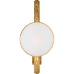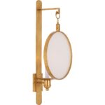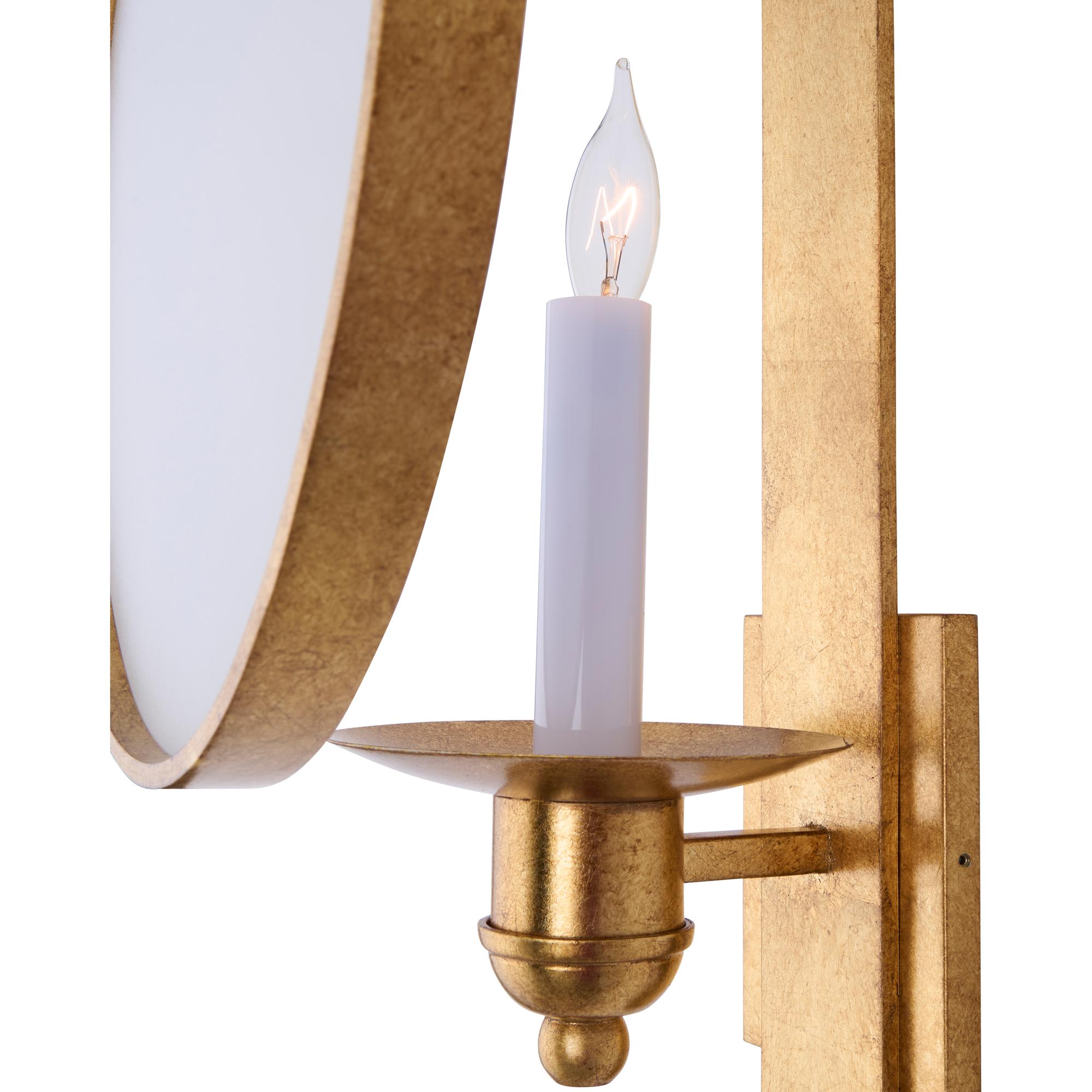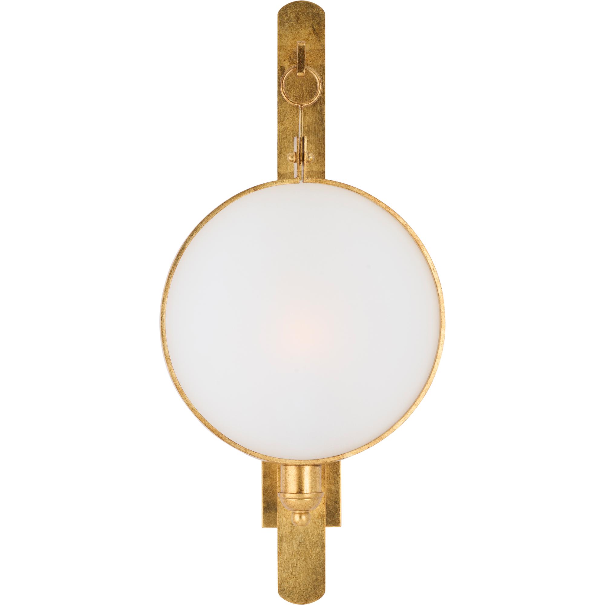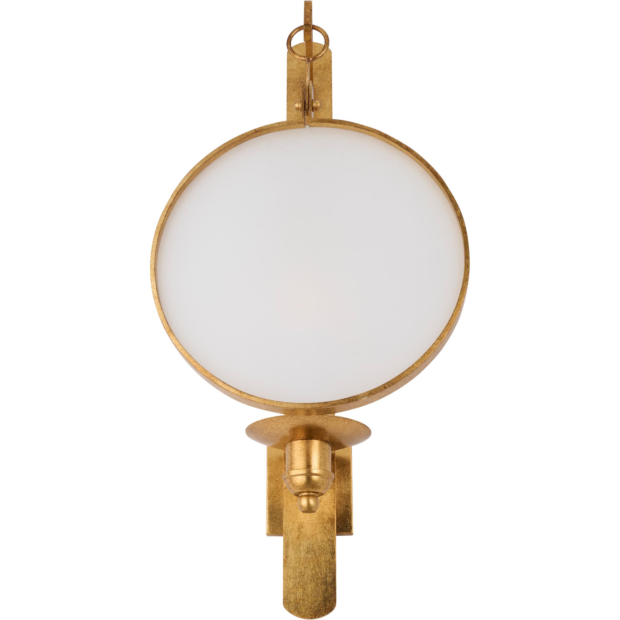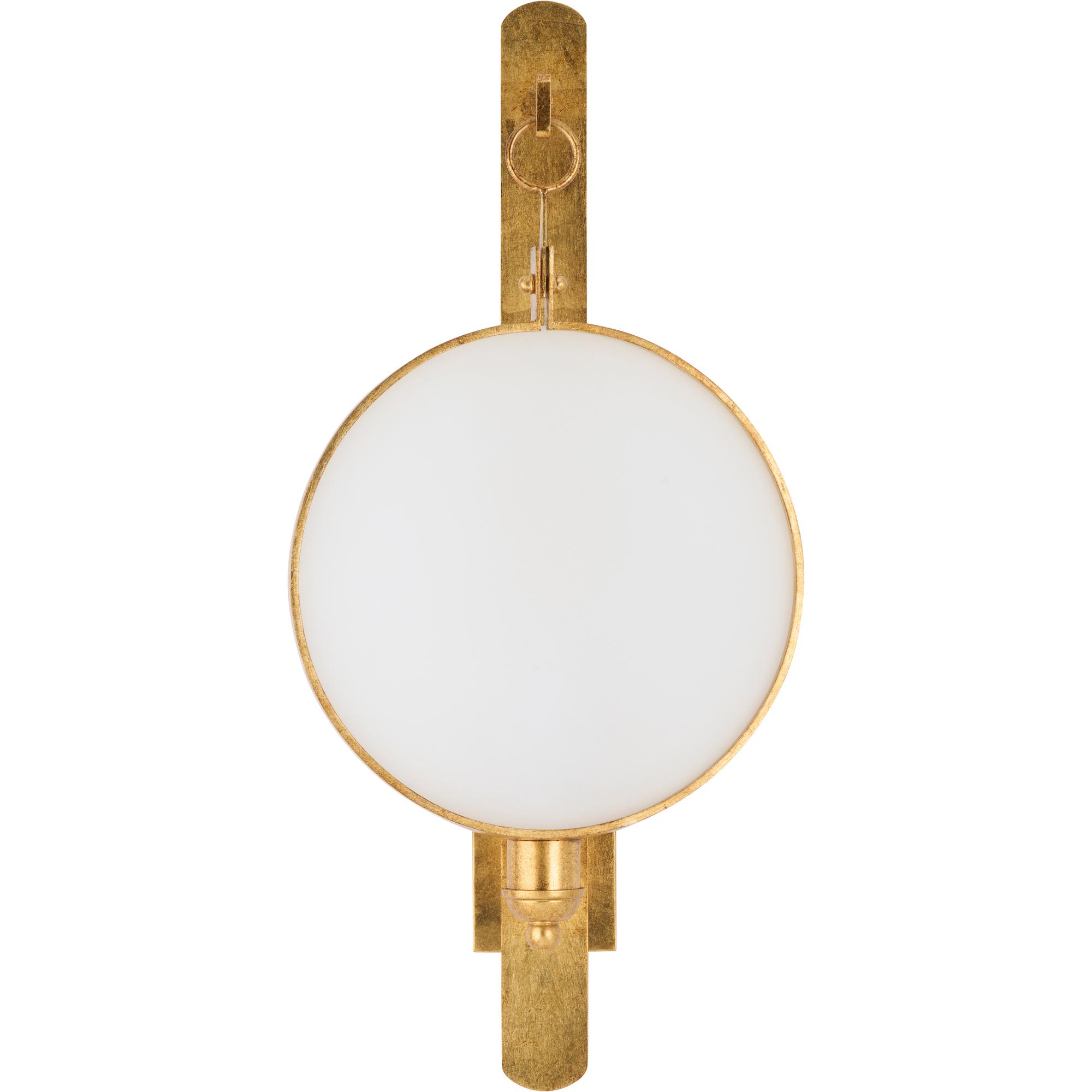 Add warmth and style to your walls with Leggit Sconce. Featuring a radiant antique gold leaf finished iron supporting a round clear glass shield, this hanging wall sconce gives depth and dimension to your space. This sconce can be used to give a soft glow over a console in a foyer or a pair can be used to flank a mirror or picture in your living area.