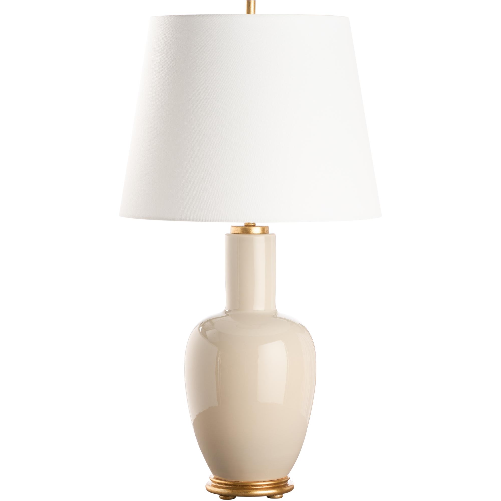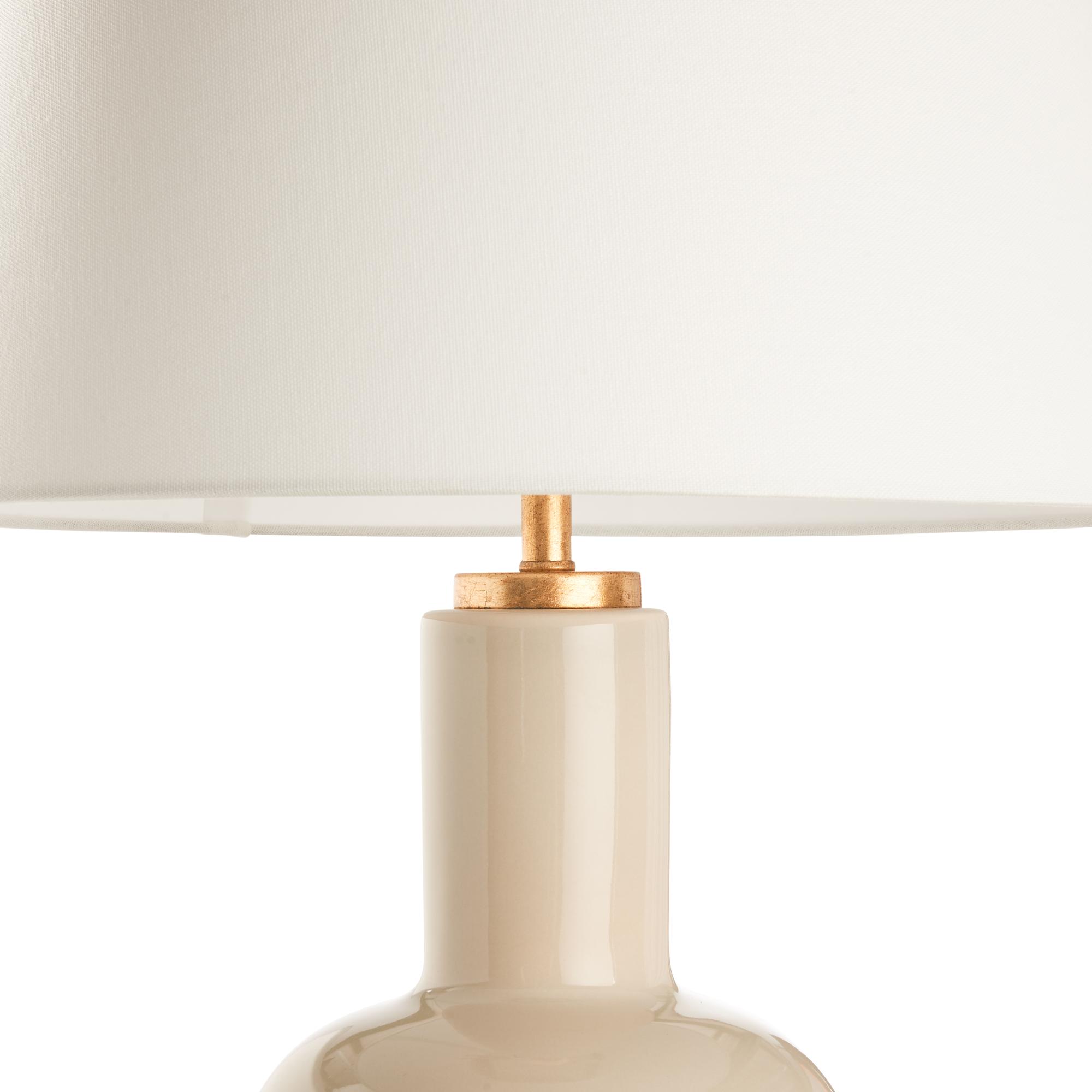 This soft tan ceramic lamp exudes sophistication with its smooth, curved silhouette that seamlessly bridges classic and contemporary aesthetics. Its elegant design is complemented by a gold base, adding a touch of warmth and refinement, making it a perfect accent for any room. Designed by Jamie Merida.