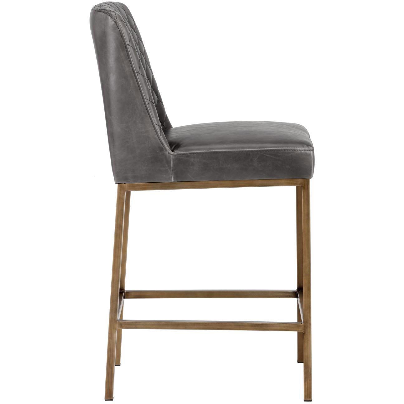 Transform bar and dining spaces with this classic counter stool. stocked in light and dark grey fabric and castillo cream, havana dark brown, coal grey and overcast grey faux leather with diamond stitching on the interior seat back and an antique brass frame steel frame. Suitable for various dining, kitchen and bar spaces of all sizes. Handle With Care: This design has been crafted with faux leather. Faux leather is manufactured to reflect the natural characteristics of leather; as such, colour variations, markings, wrinkles, grooves, and light scratches are appreciated characteristics. No two pieces will be alike.