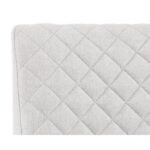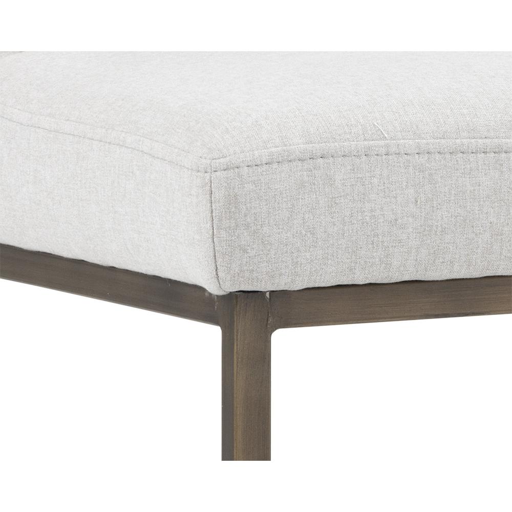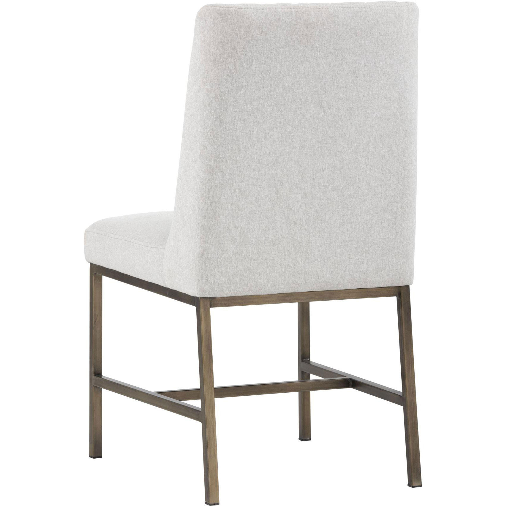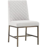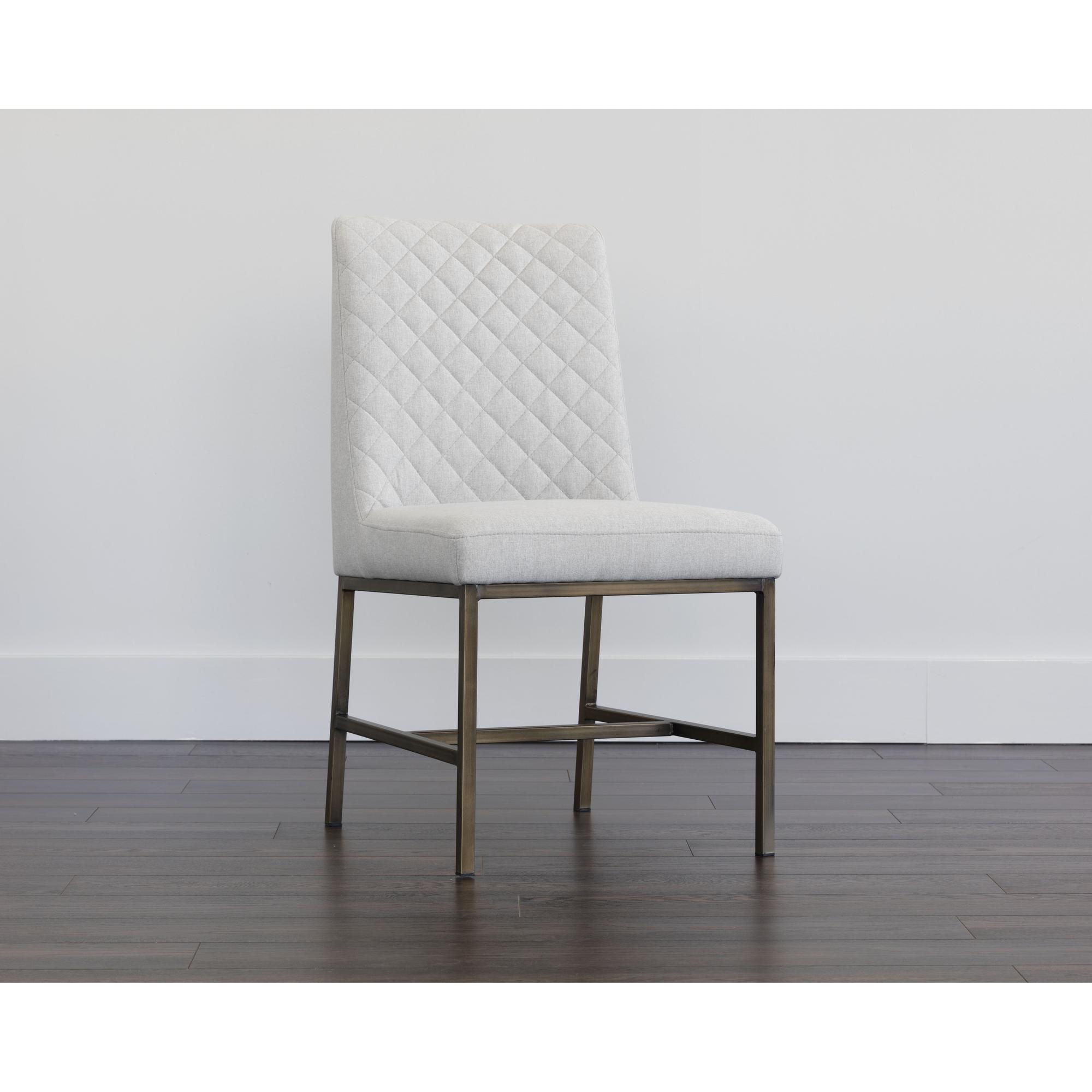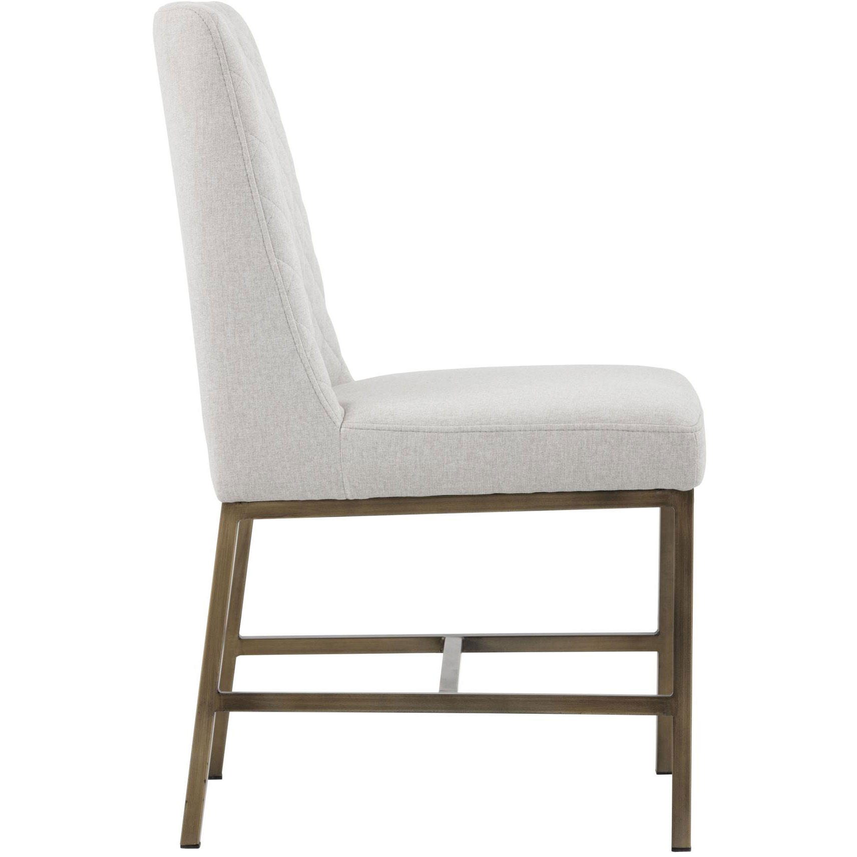Invigorate dining spaces with this classic dining chair. Features beautiful diamond stitching on the interior seat back and an antique brass frame steel frame. Stocked in light or dark grey fabric and havana dark brown, castillo cream, coal black, or overcast grey faux leather.