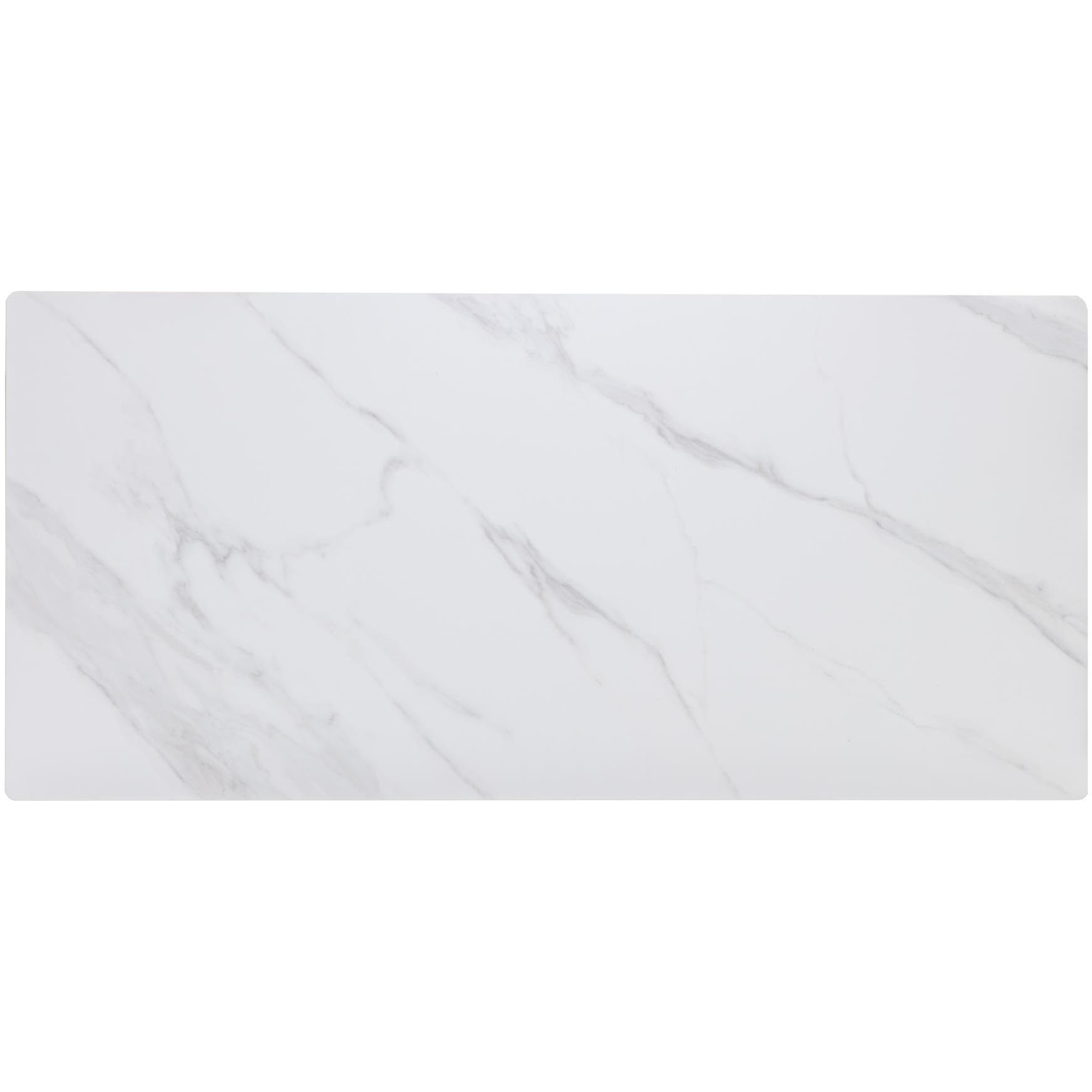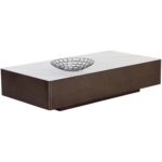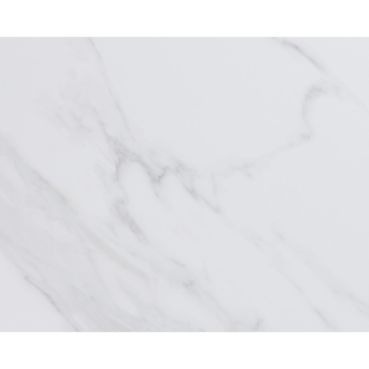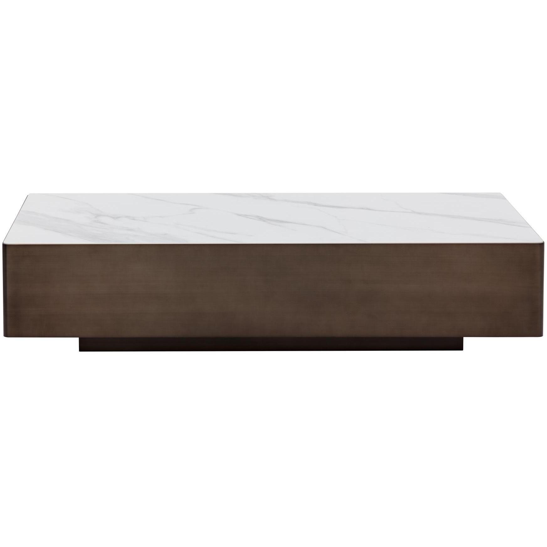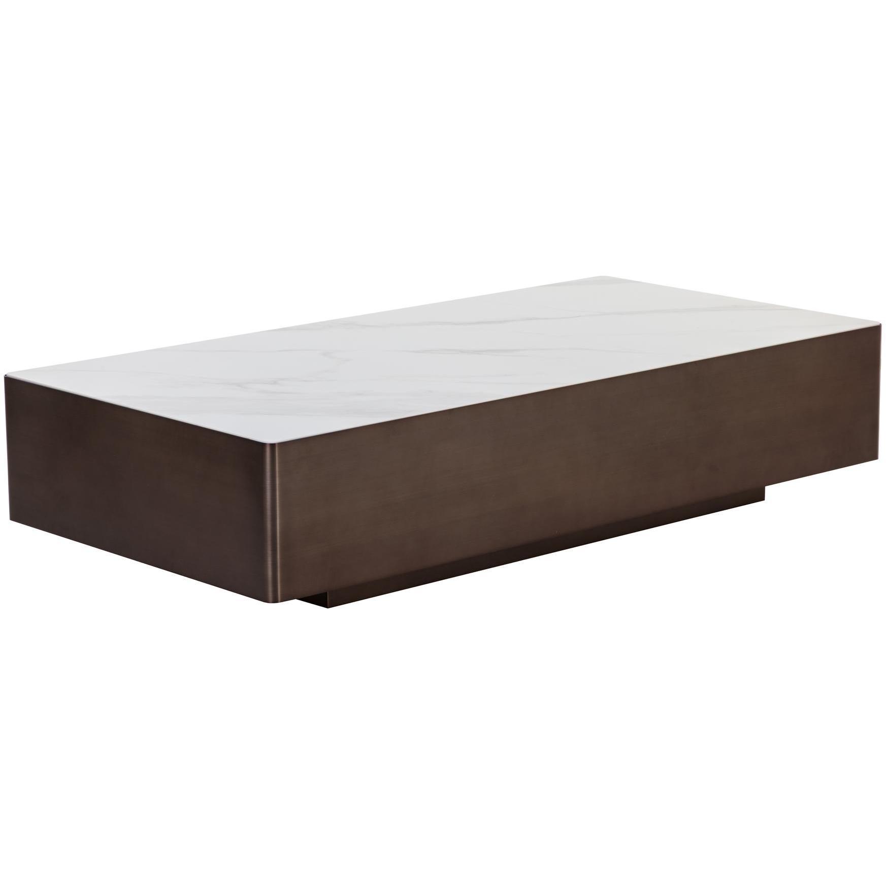 The Lenay Coffee Table boasts a minimal profile for a clean and modern aesthetic. The white marble-look ceramic top is accentuated by the sleek dark bronze stainless steel base.