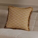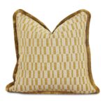 The Leone cushion adds vintage charm and contemporary flair with its bold geometric print in vibrant chartreuse. Meticulously crafted with a dense fringe trim, this Art Deco-inspired accent piece offers comfort and enduring character.