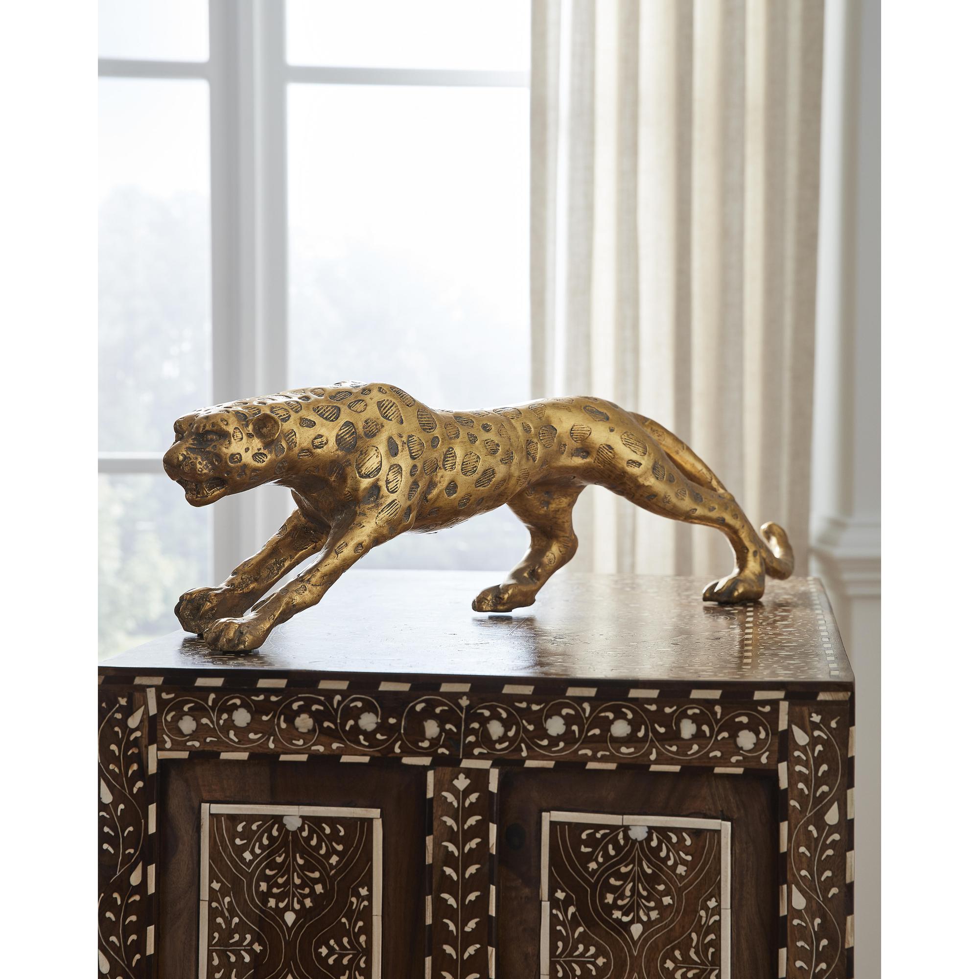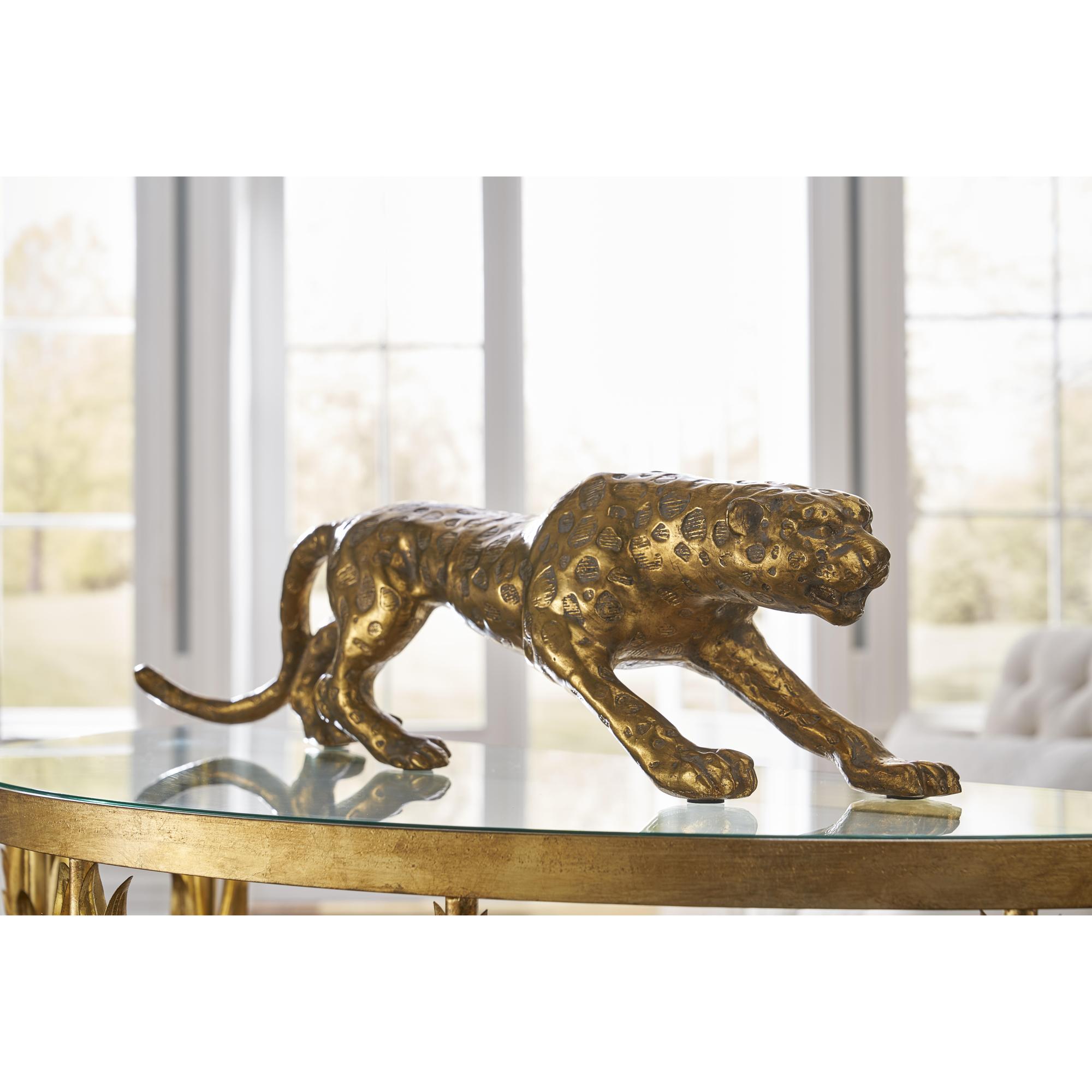 Featuring the majestic leopard, this figural accent is crafted of cast composite with an old gold finish. The detailed face and body show the strength of the animal. Display on a credenza or bookcase to bring the beauty of nature into your home or office decor.