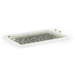Fun wood tray with leopard pattern under glass and clear acrylic handles with polished brass accents. Great for entertaining and bold decorative accent. Designed by Elaine Burge.