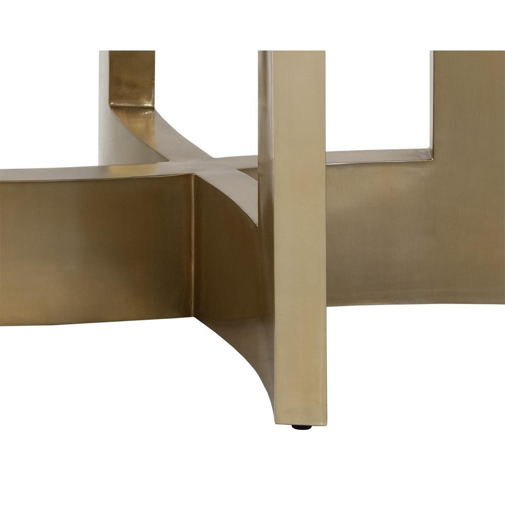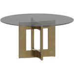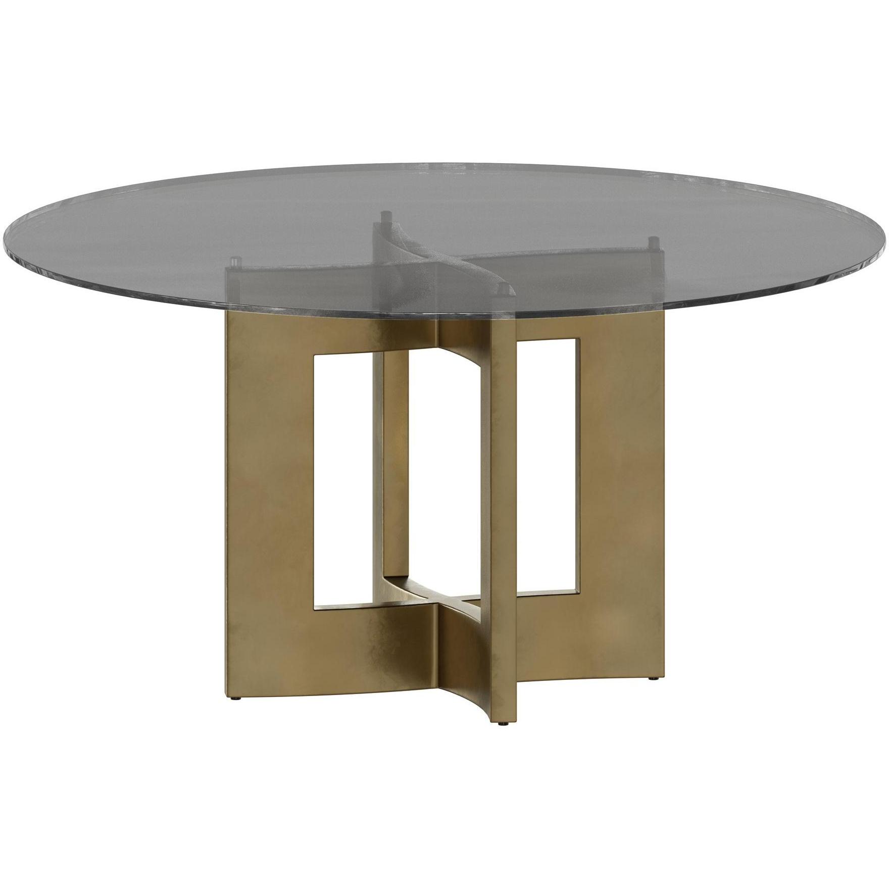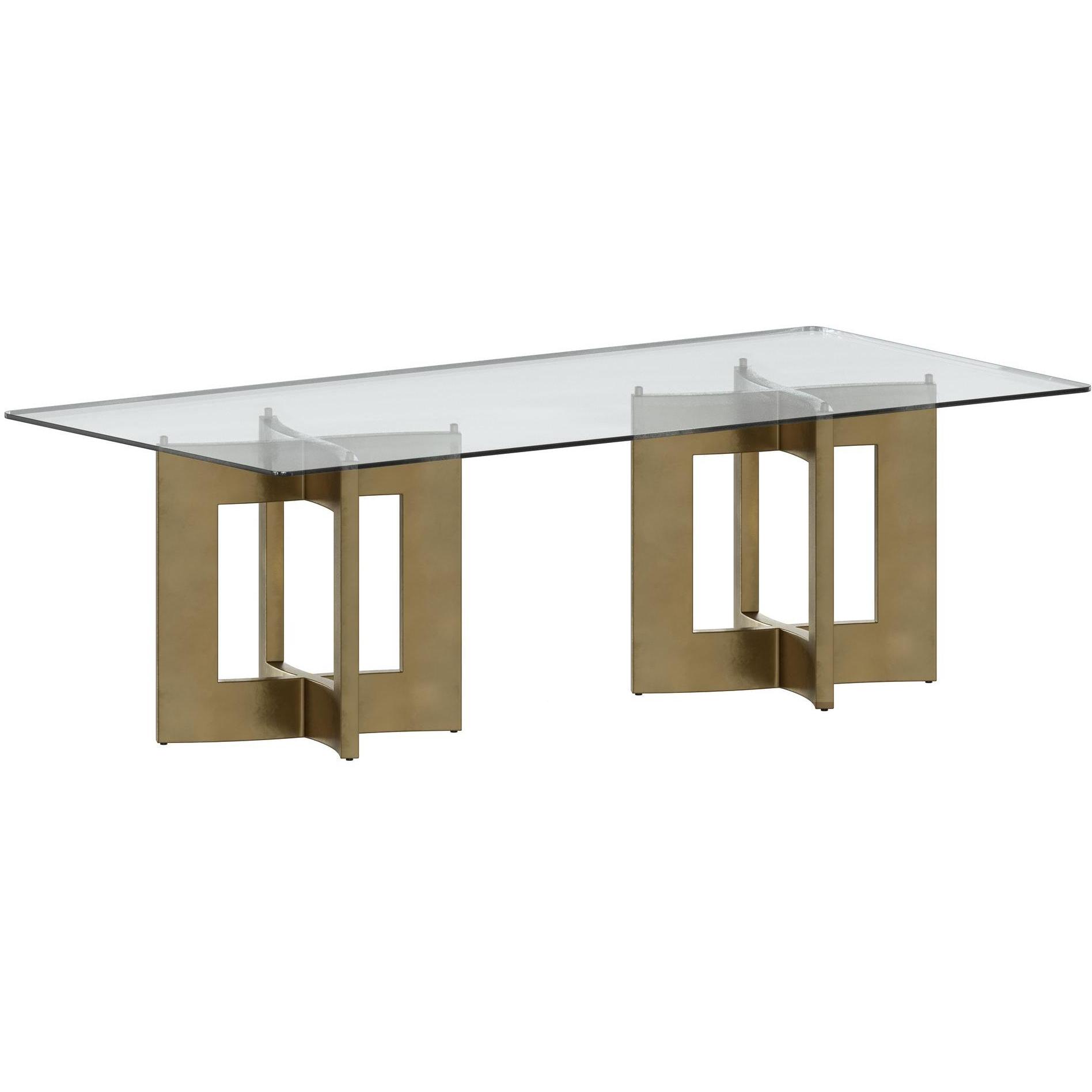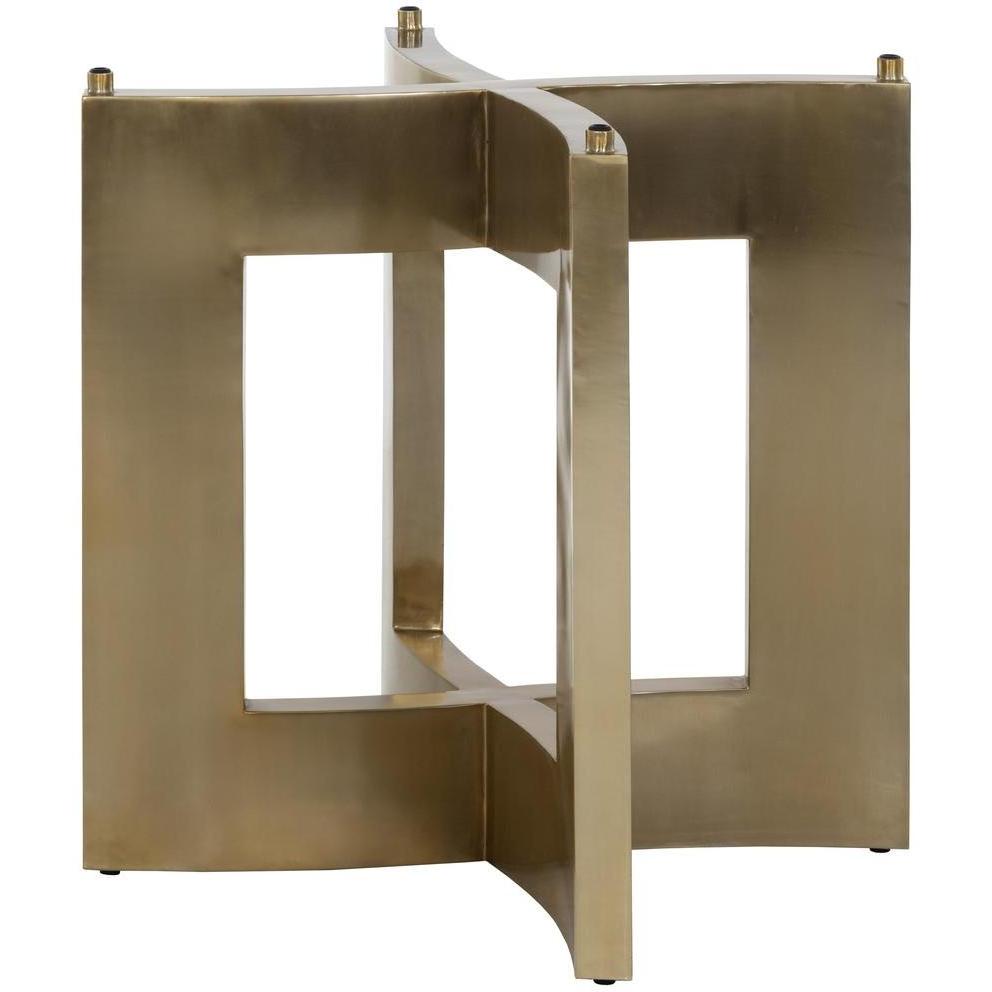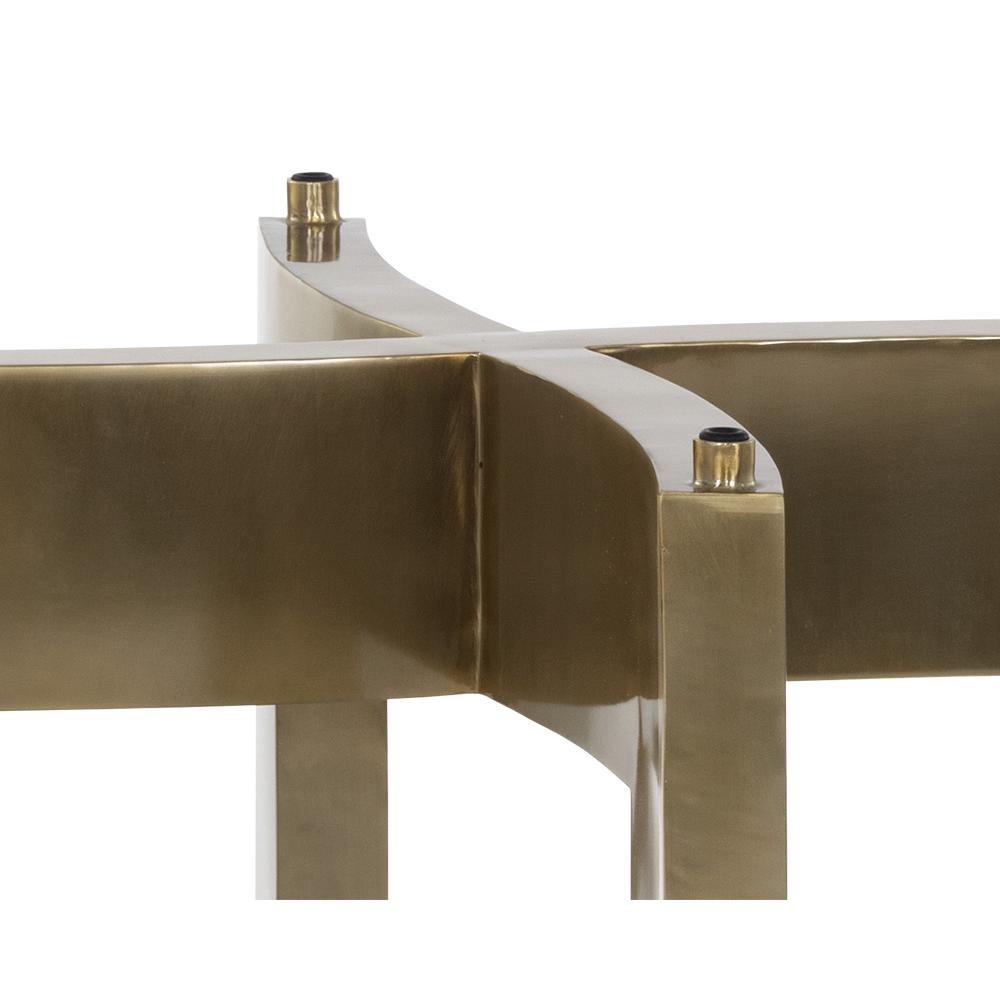 A stylish, geometric dining table base constructed from stainless steel with a gold lacquer finish. Intended for use with a 59″ round glass dining table top, or use two bases with a 86.5″ glass top for a rectangular dining table combination. Table tops sold separately. Designed for use with glass table tops only. Made in India. With refined craftsmanship, this design was brought to life by skilled local artisans. Due to the nature of handcraftsmanship, unique imperfections such as fissures, markings and variations in colour and shape are welcomed and appreciated characteristics for a truly one-of-a-kind piece.