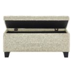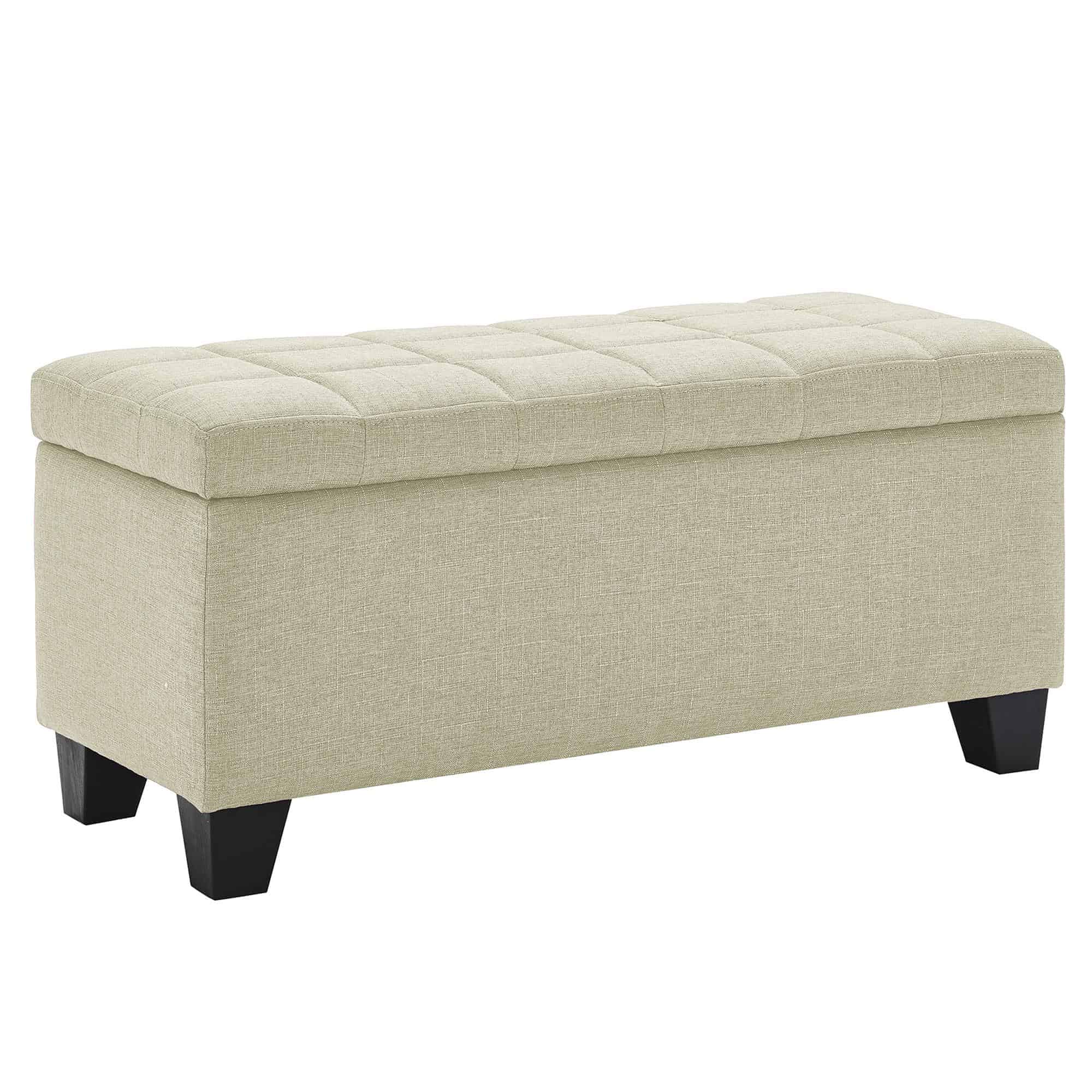 Items you keep in this ultra-deep storage ottoman may be out of sight and out of mind, but this piece can stay front and centre! A perfect add-in to any space for extra seating when needed and extra storage always available. The tufted, upholstered design will work well in any space. Safety-stop hinges keep fingers safe by preventing any accidental slamming of the seat. Sturdy black legs provide stability and support in this versatile piece.