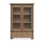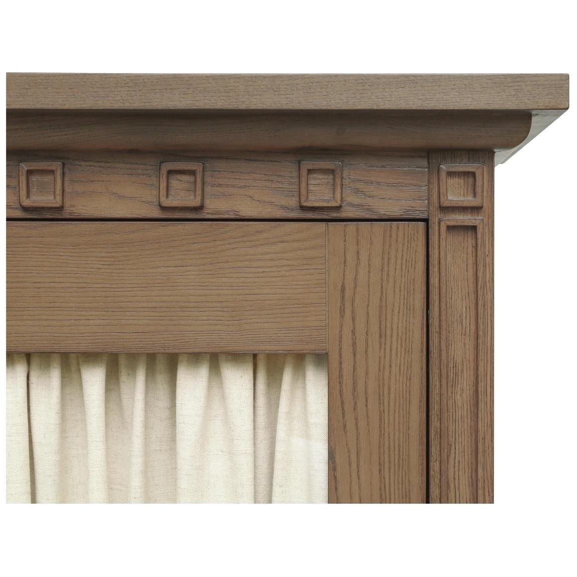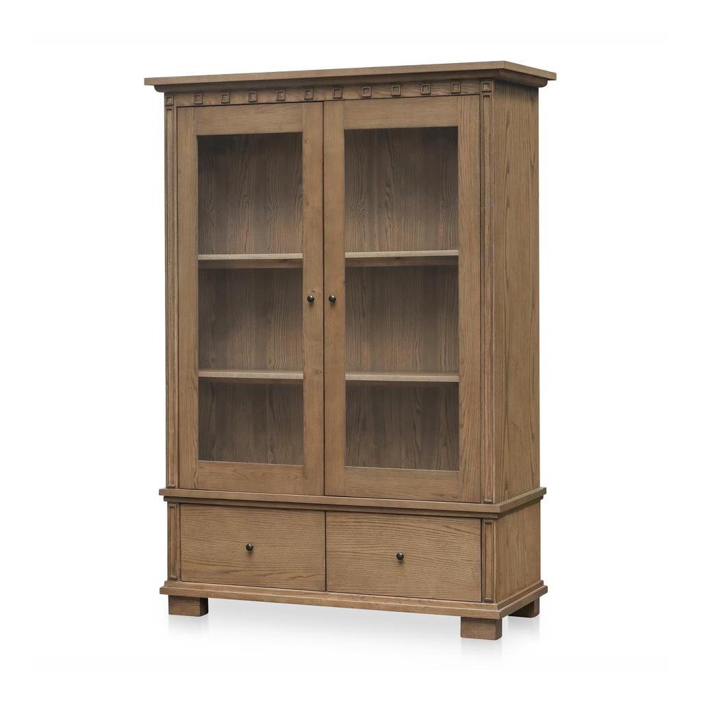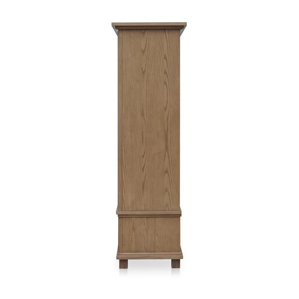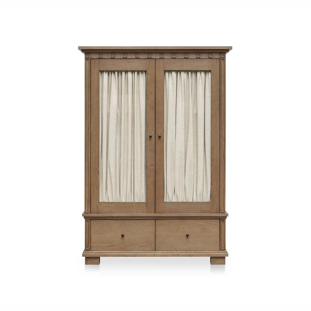 The Lillian makes storage feel elevated. Framed in solid ash with glass doors, its tall silhouette pairs traditional molding with a warm brown finish. Inside, removable linen-textured drapery softens the display or can be taken out for a crisper look. Blackened bronze handles open to three shelves above and two deep drawers below—showcase up top, hideaway down low. A timeless piece designed to balance form and function.