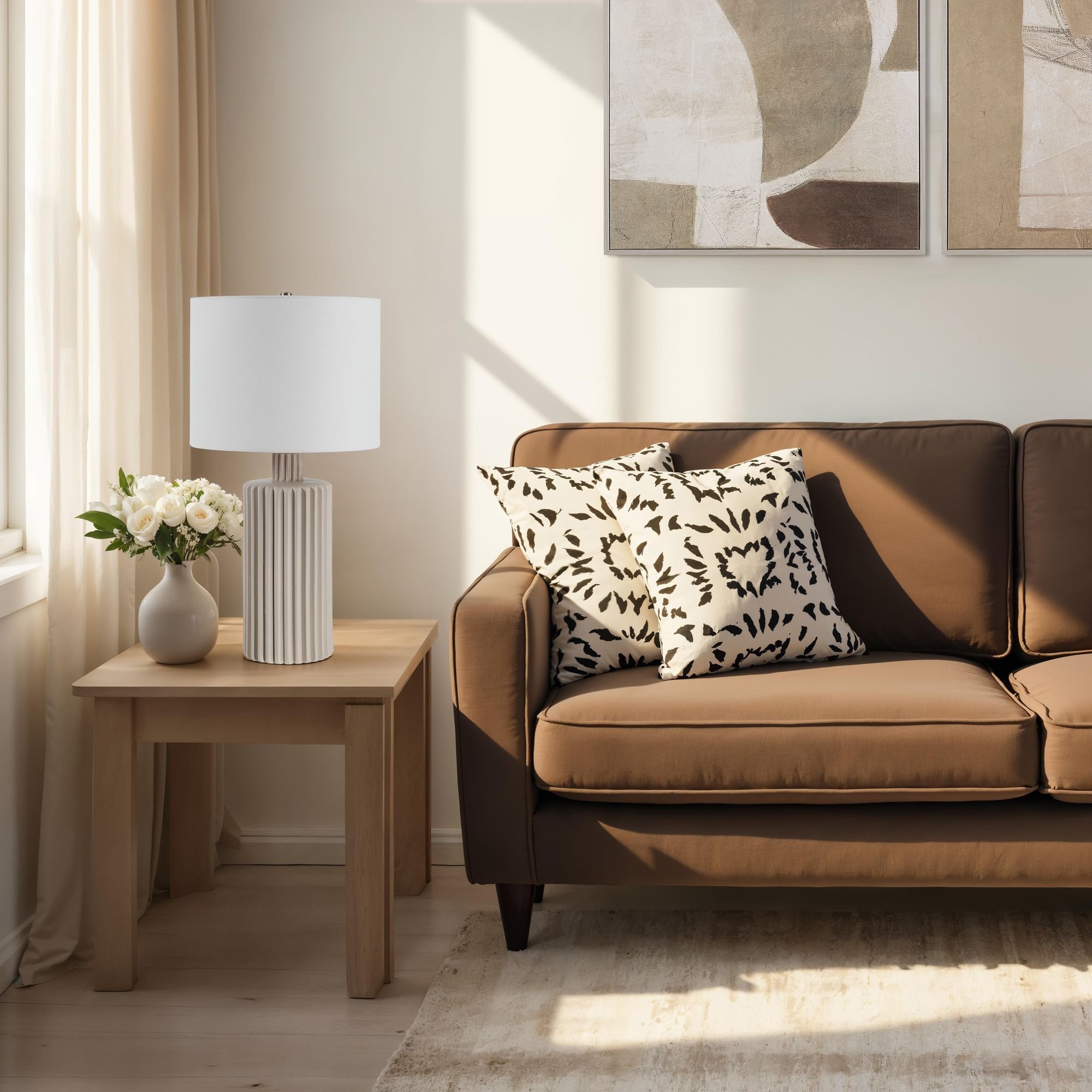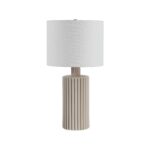 Update any interior with the texture and neutral hues of this ribbed ceramic table lamp. Measuring two feet tall, it holds a stately presence in a bedroom, living room or dining room. Offering dimmable lighting and a diffused glow thanks to its linen drum shade, this beige lamp will add style and light to your design project.