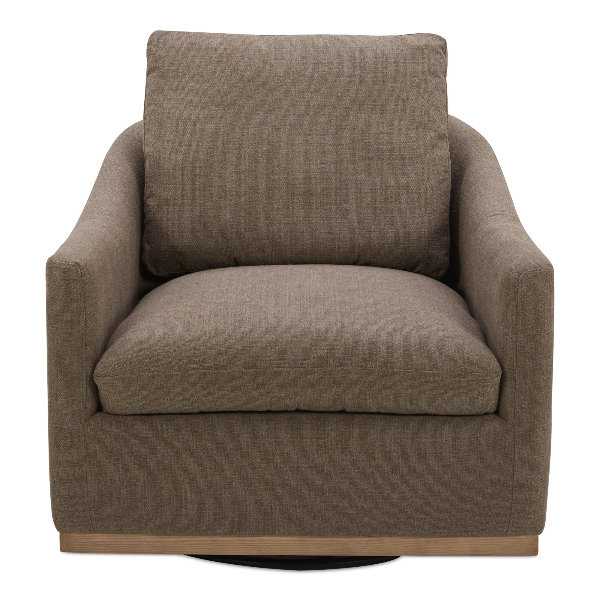 The Linden swivel chair features a curved barrel back paired with a generously sized toss cushion support. A smooth, solid wood base completes the look with a 360° swivel function for an updated, sophisticated feel.