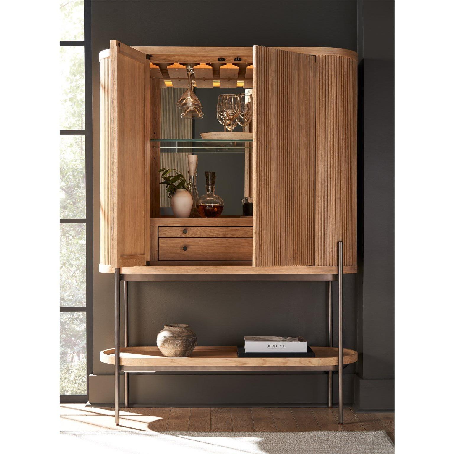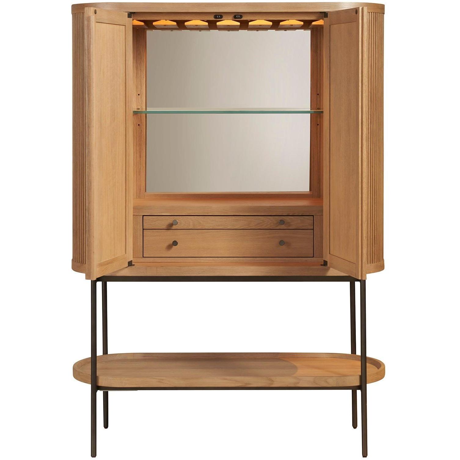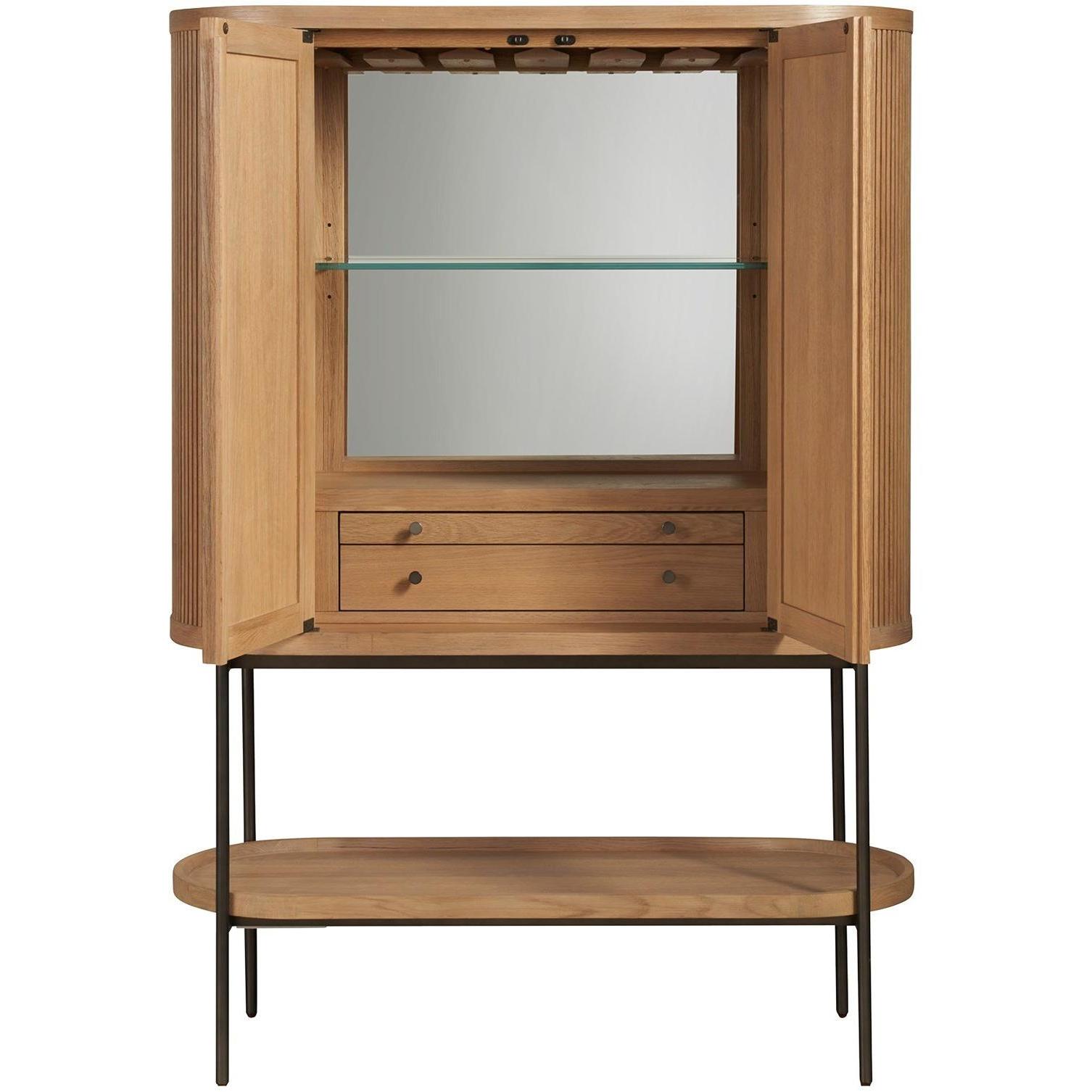The Linnea Bar Cabinet offers a fresh interpretation of classic design, with two doors unveiling ample space for spirits and glassware. Clad in Natural Oak and complemented by aged Satin Pewter metal accents, this piece embodies modern elegance. The subtle ridging in the wood enriches its character, blending functionality with a distinct aesthetic appeal.
