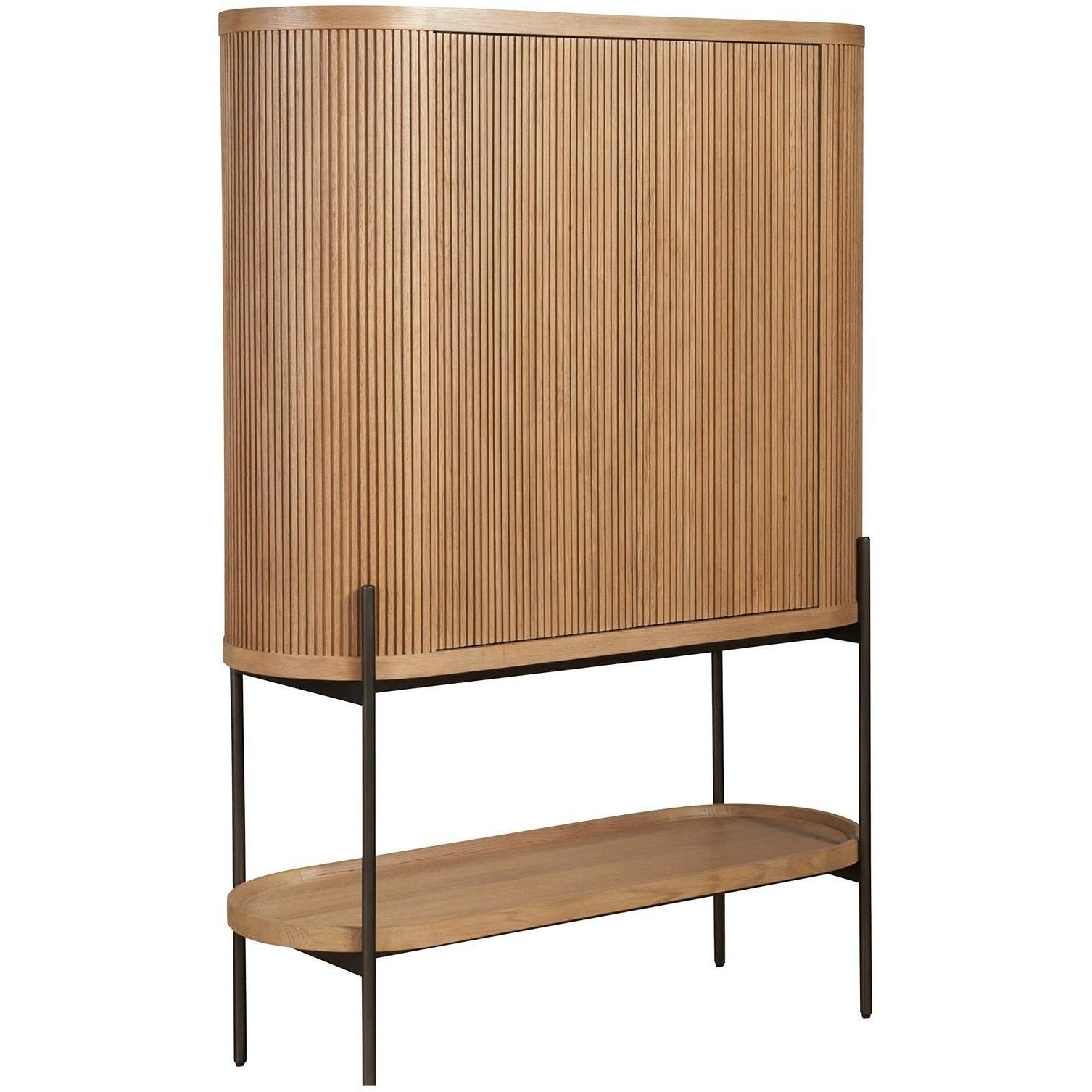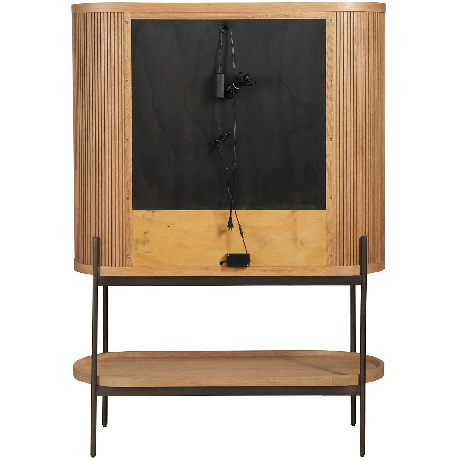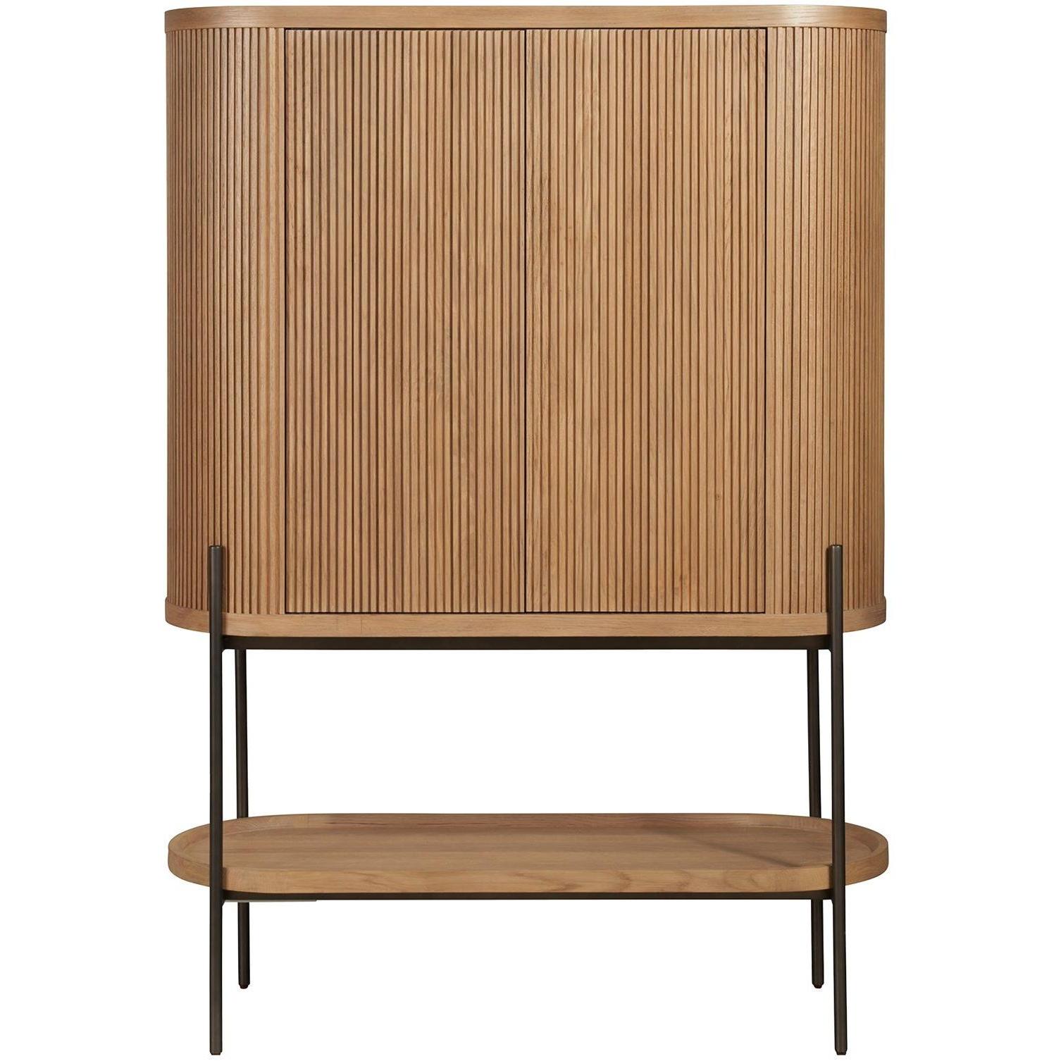 The Linnea Bar Cabinet offers a fresh interpretation of classic design, with two doors unveiling ample space for spirits and glassware. Clad in Natural Oak and complemented by aged Satin Pewter metal accents, this piece embodies modern elegance. The subtle ridging in the wood enriches its character, blending functionality with a distinct aesthetic appeal.