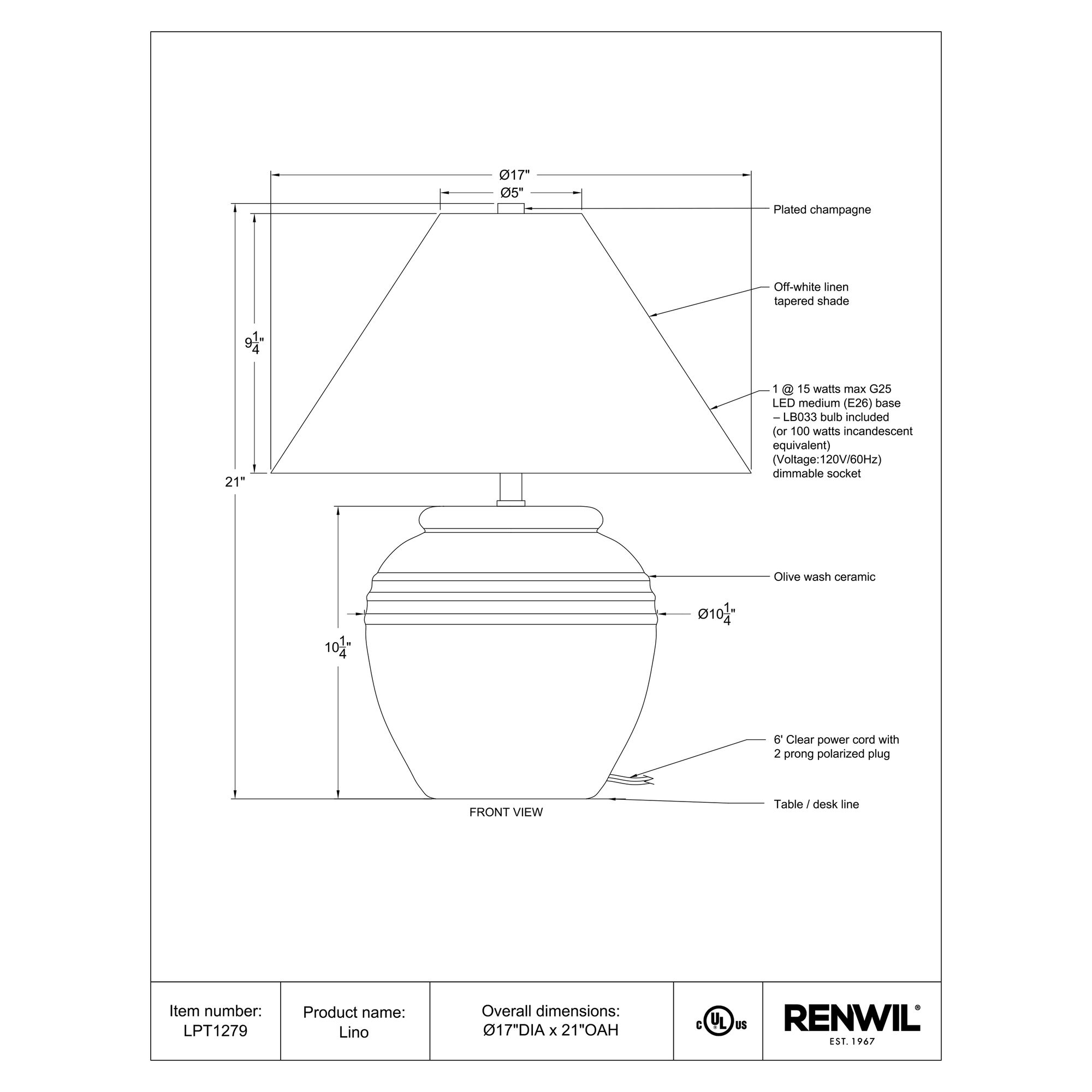 Turn on impeccable style in any room with the Lino table lamp. Featuring a richly textured hand thrown ceramic base with an olive wash painted finish for a one-of-a-kind look, this dimmable lamp embodies a timeless aesthetic that’s always in fashion. Its champagne plated fitting holds an included bulb that works with the beautiful off-white tapered linen shade to diffuse ambient light for a soft and gorgeous glow in any space. Perfect as a living room lamp, bedroom lamp or in just about any room, it’s suitable for modern, classic or rustic farmhouse interiors alike. To light up your life with sophistication and style, simply plug in and switch on this stunning lamp.