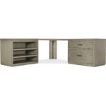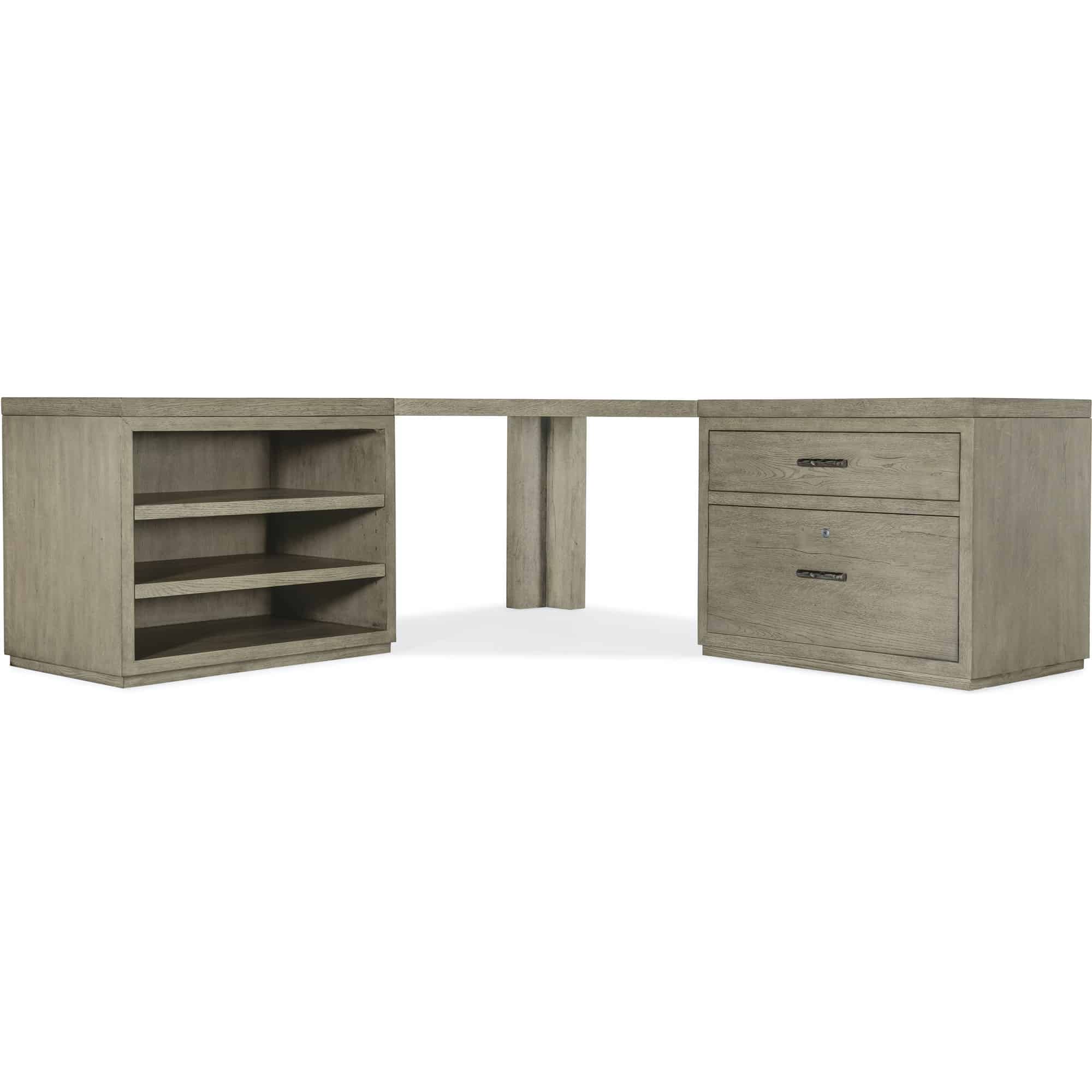 Features: Includes a corner top, two 36-inch tops, an open desk cabinet and a lateral file