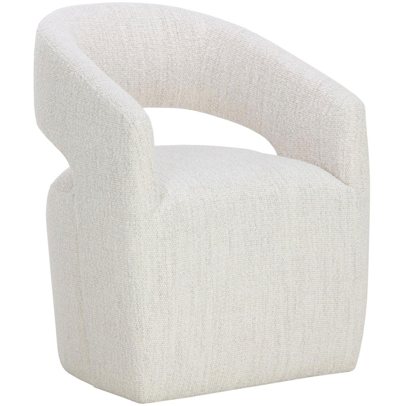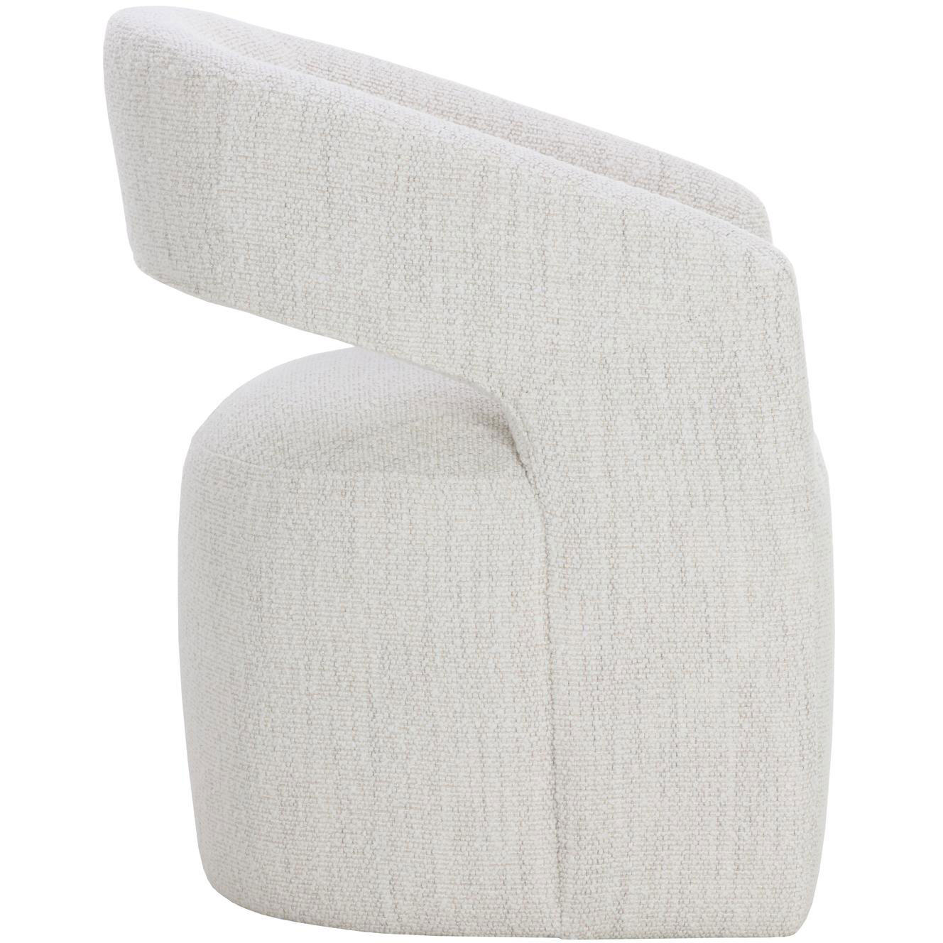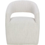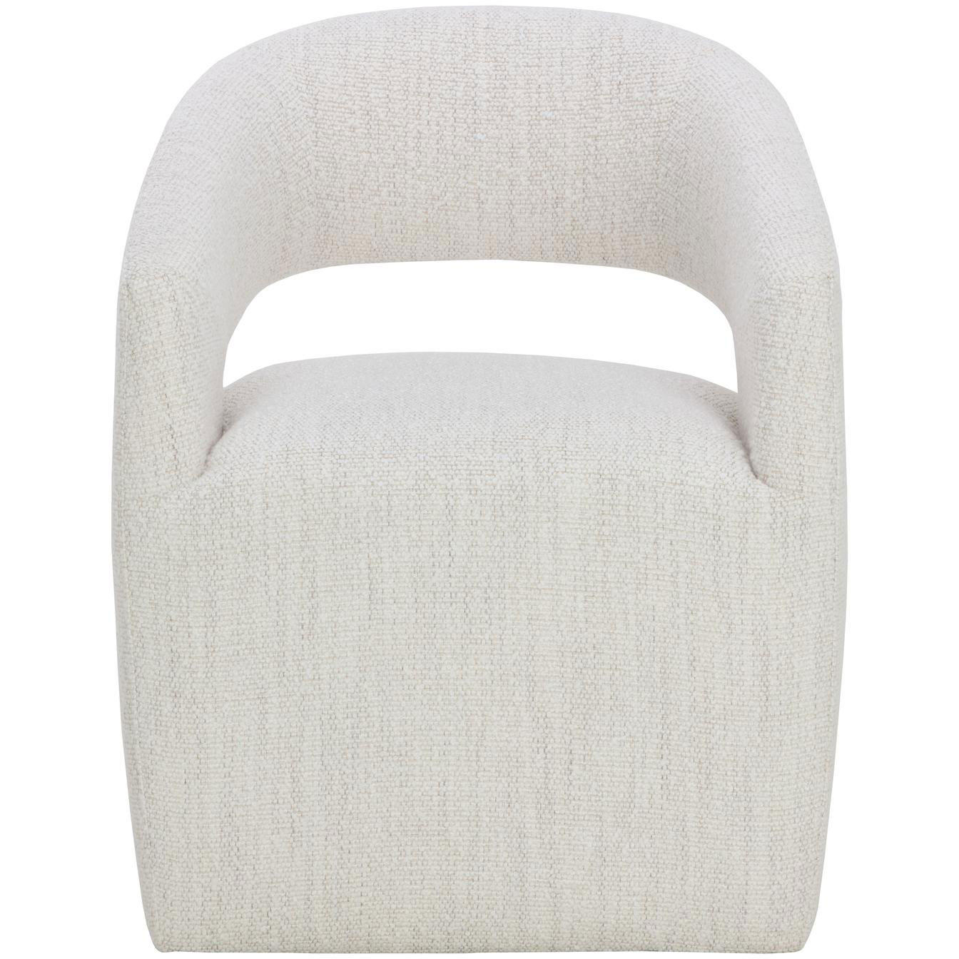 Gentle curves give the Lloret Wheeled Dining Armchair an elegantly defined silhouette. Fully upholstered in merino pearl performance fabric with a comfortable seat and casters for an easy glide. Performance fabric is moisture repellent, durable and easy to clean.