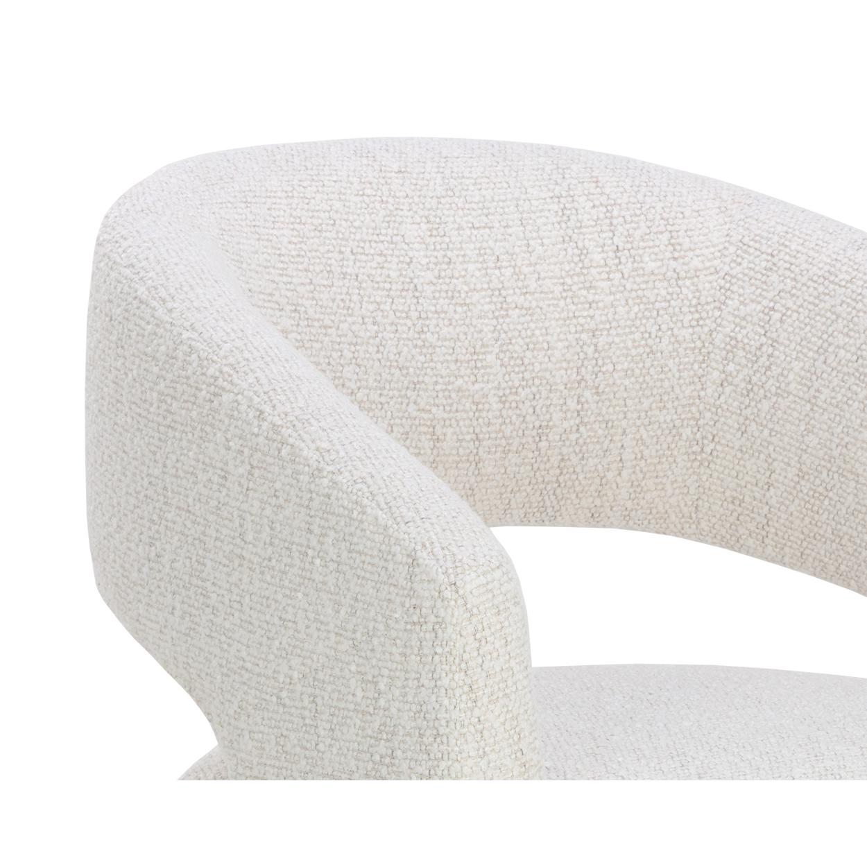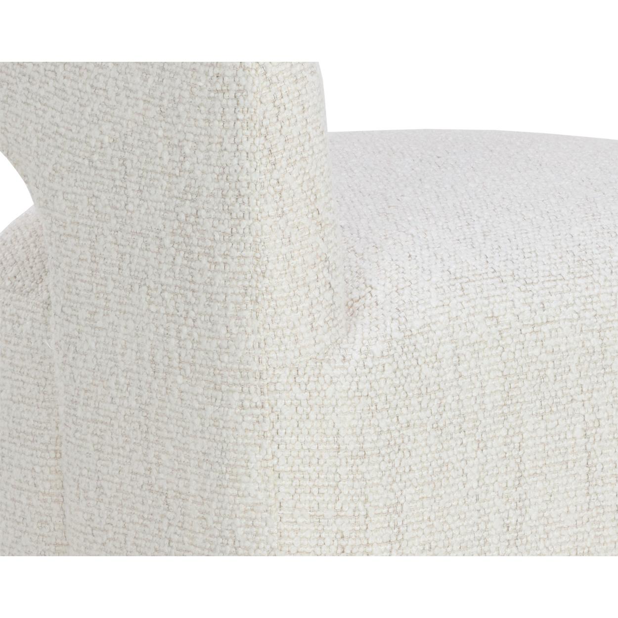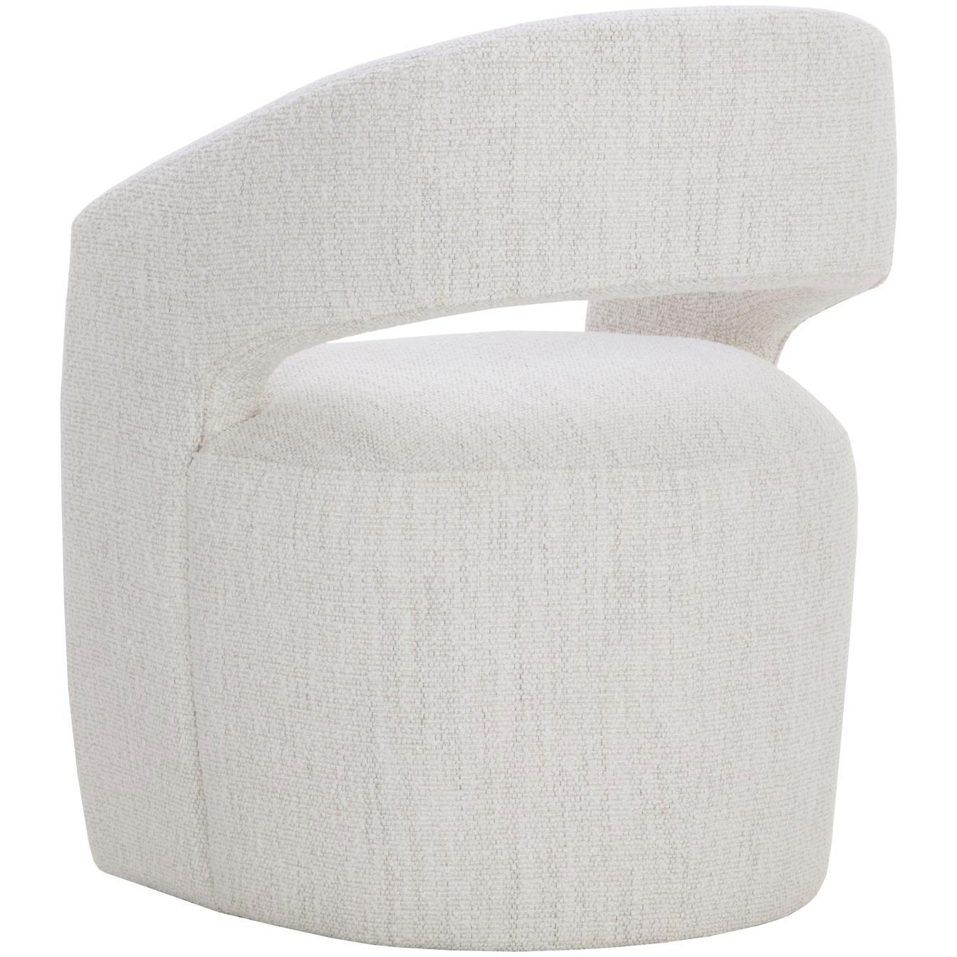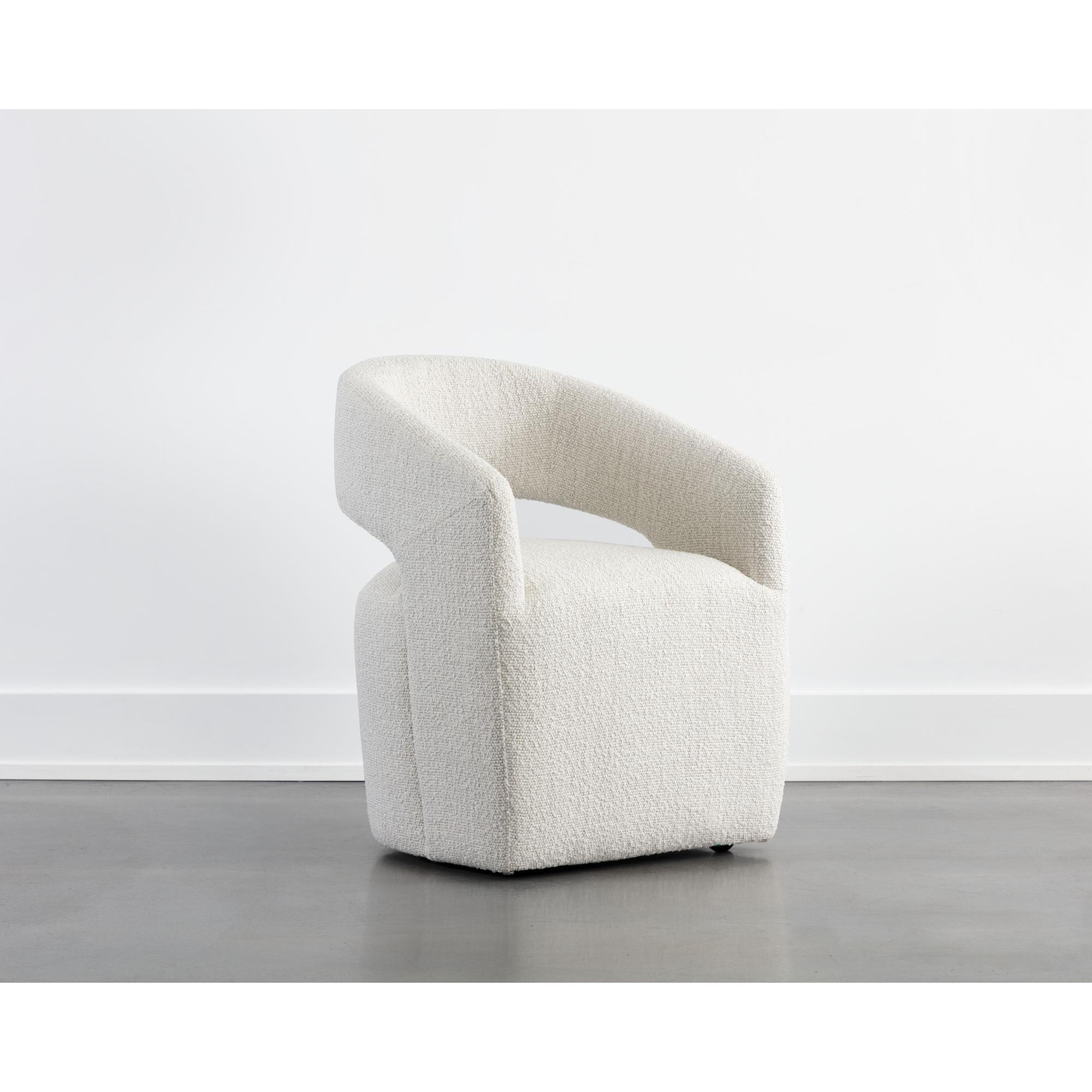 Gentle curves give the Lloret Wheeled Dining Armchair an elegantly defined silhouette. Fully upholstered in merino pearl performance fabric with a comfortable seat and casters for an easy glide. Performance fabric is moisture repellent, durable and easy to clean.