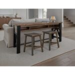 - Multi-step hand-painted water-based acrylic lacquer finish in gray and brown tones for an updated “reclaimed wood” look.